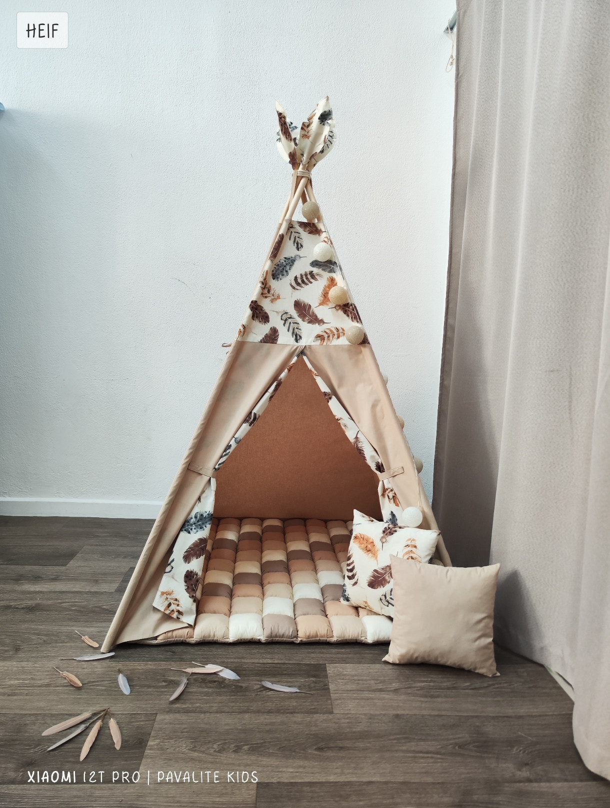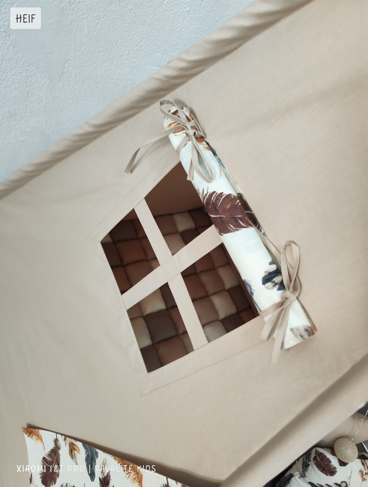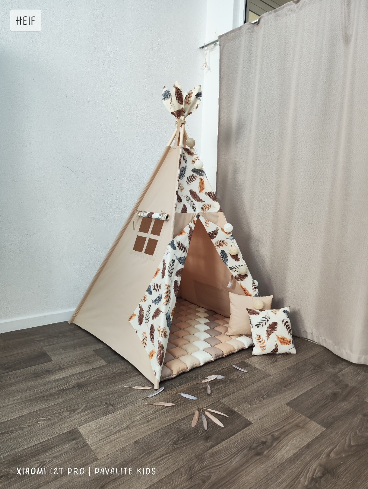 Индианска детска палатка за игра - типи. Основата на палатката е 100х100см. В комплекта е включен палатка в неутрален десен, пухкаво килимче на квадратчета ( дебелина около 6см), стабилизатор за палатката, комплект пера и 2 бр възглавнички.