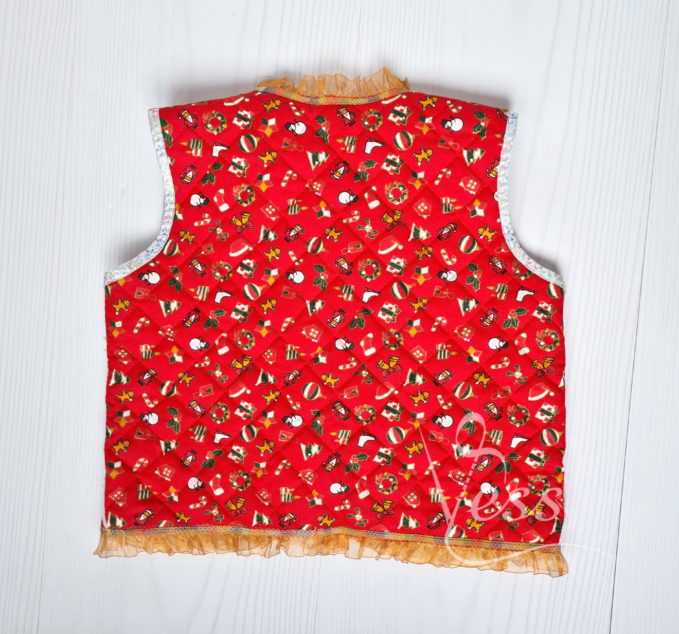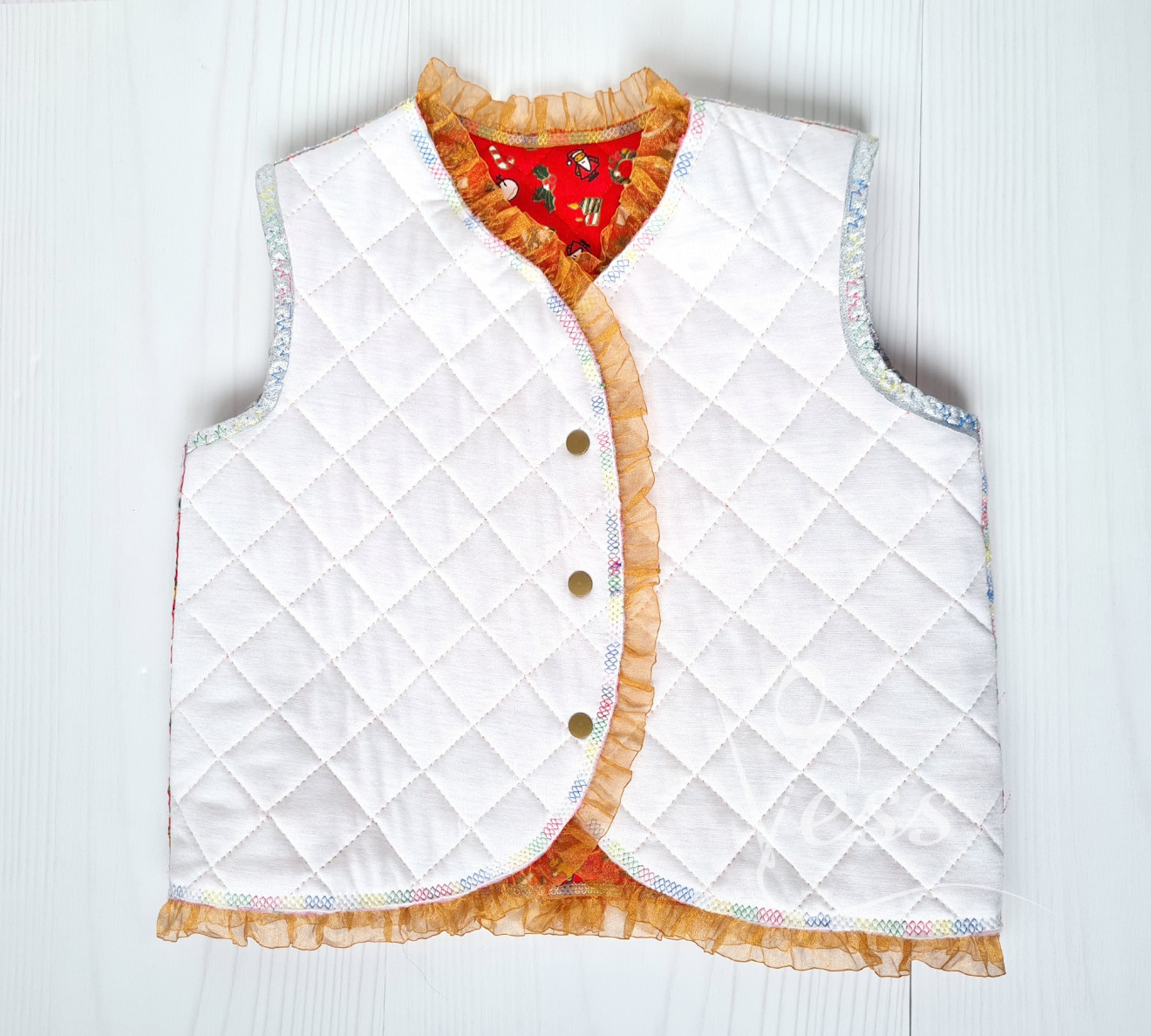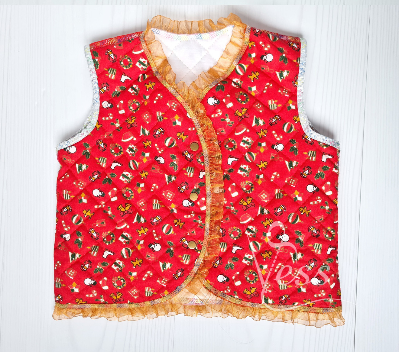 Красиво коледно елече с две лица от памучен капитониран плат с коледна щампа и бяло памучно трико от другата страна, с тънък слой вата между тях. Обточено с сребрист ширит и бродирано, воланче от органза за разкош. Закопчава се и от двете страни с копчета тик-так. Удобно, практично и интересно. Размер 98-104 Продукта е бутиков и е единична бройка. Препоръчва се пране на ръка или на деликатна програма и гладене при необходимост със слаба ютия. Възможно е цветовете на снимките да изглеждат различно, спрямо устройството което използвате!