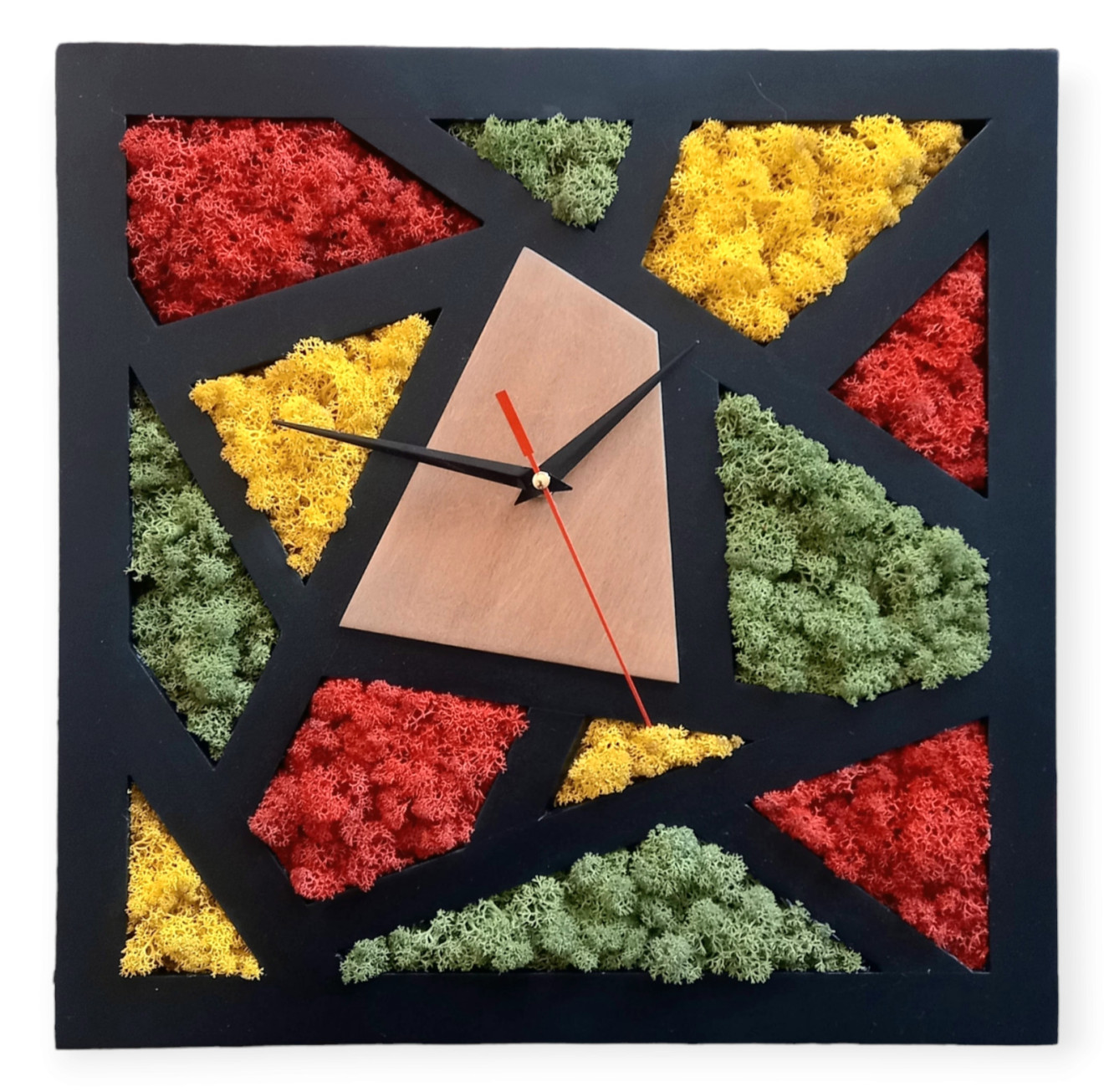 Часовник, изработен от масивно дърво и декориран със скандинавски мъх.
