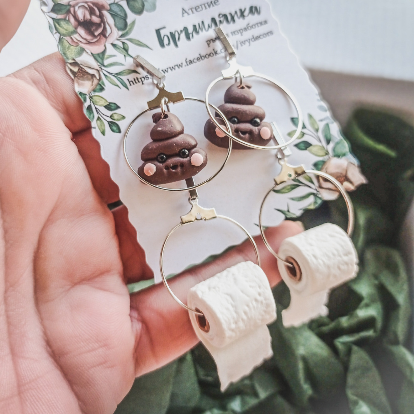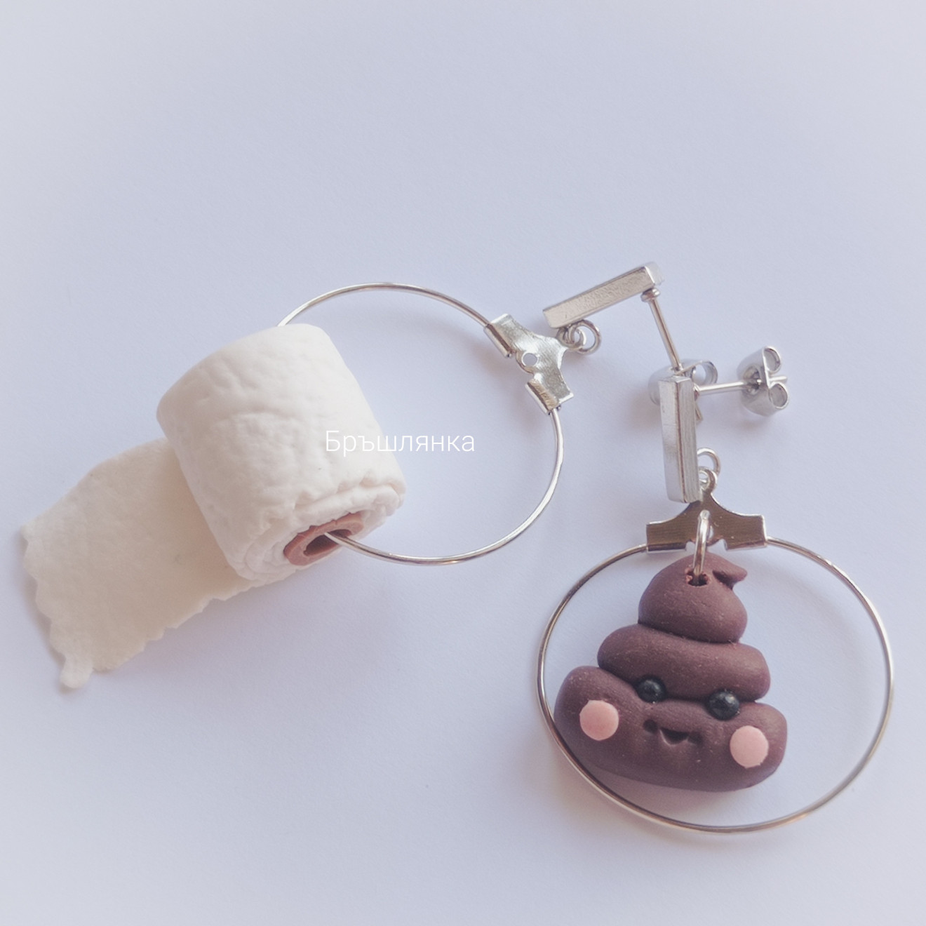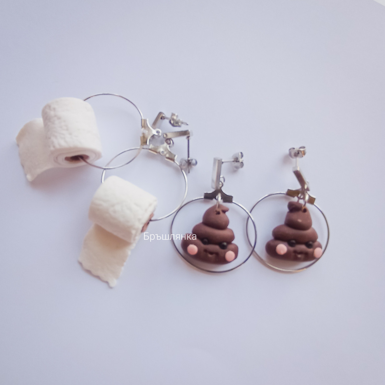 Ръчно изработени обеци от полимерна глина Пупси и ролки Тоалетна хартия? С размер приблизително 15мм на фигурката, 20мм е ринга. Изработени по поръчка, могат да се изработят отново. Окачването е от стомана, не предизвиква алергии. Изработени като комплект, но могат да се изработят самостоятелно, както и смесено - една такава и една такава ? За повече информация и актуален срок на изработка, моля, свържете се с мен на лично съобщение тук или във Фейсбук на страницата ми Бръшлянка ?
