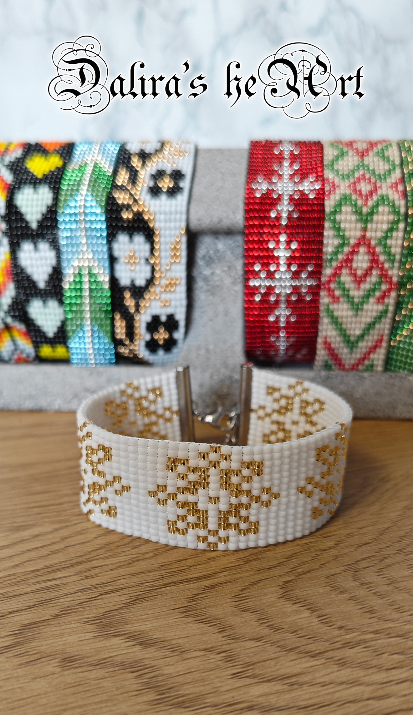 ??? Коледа иде! Тази гривна е красота, блясък, но най-вече Коледа! ??? Подарете на любим човек (защо не и на себе си) коледно настроение с тази гривна от японски мъниста Миюки. Красотата снежинките върху вашата китка! Ръчно направена с дължина 17-18см (дизайн+закопчалка)+5см удължител, метални части изцяло от стомана, за да не променя красотата си. Стоманата е чудесен избор при алергии на кожата, издръжлив материал и лесен за подръжка. Изработена с любов и внимание към детайлите.