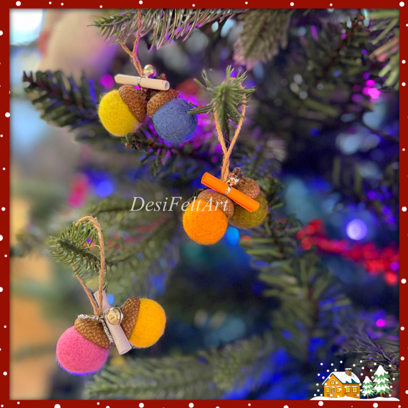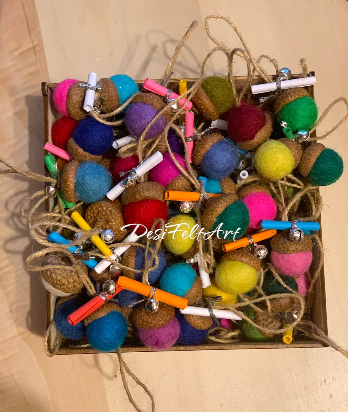 Ръчно изработени Коледни късмети от естествени жълъдови шапчици и вълнено топче, декорирани със звънче. Може да се използва и като играчка за елха. Възможни са два варианта - единичен и двоен жълъд Цената е за 1 брой Не са подходящи за деца под 3 години!