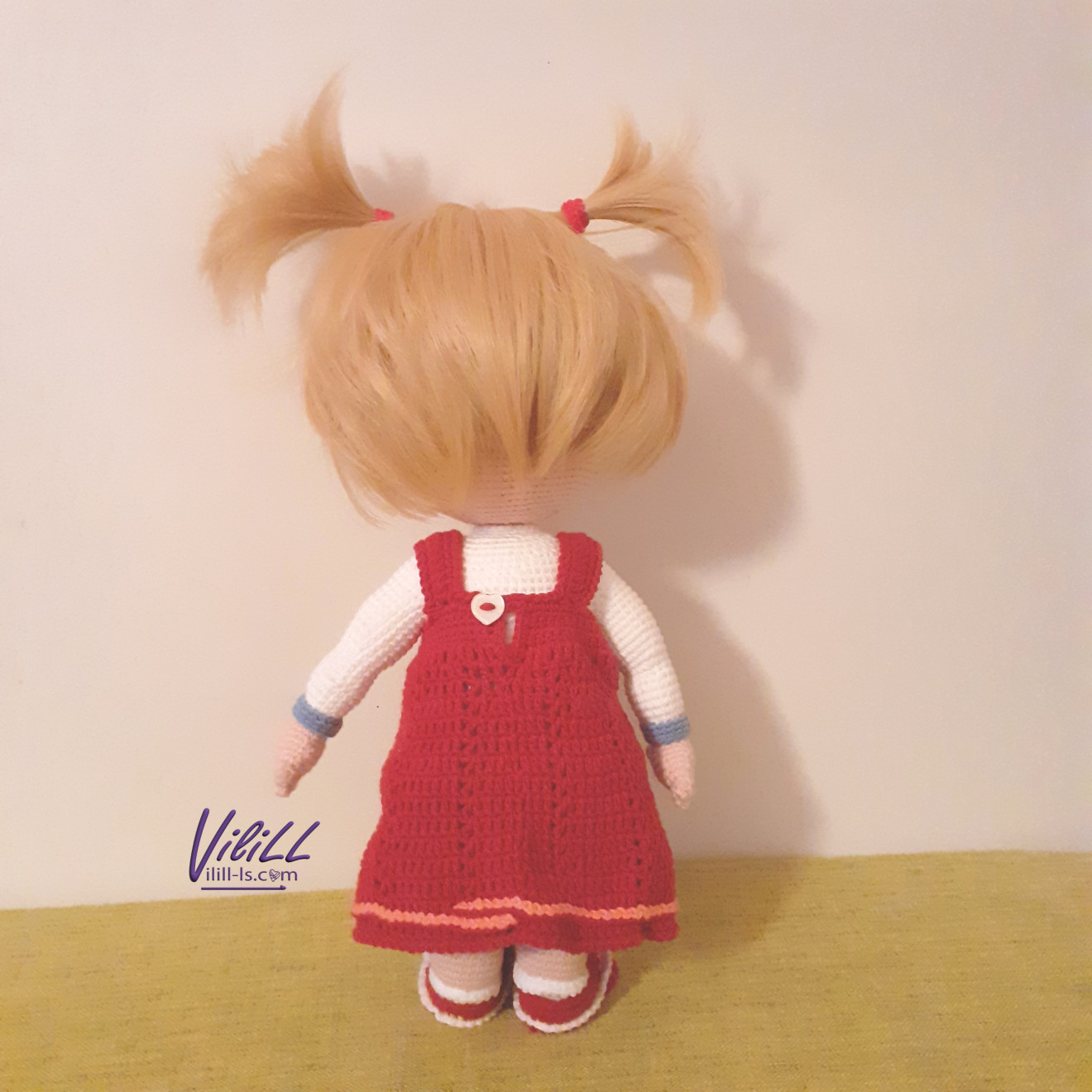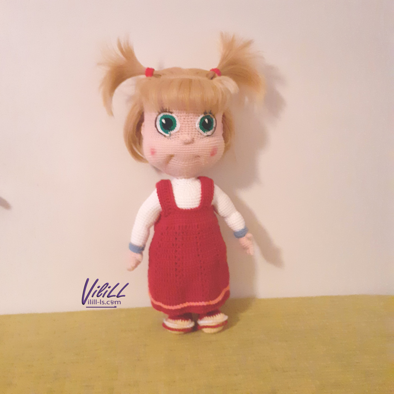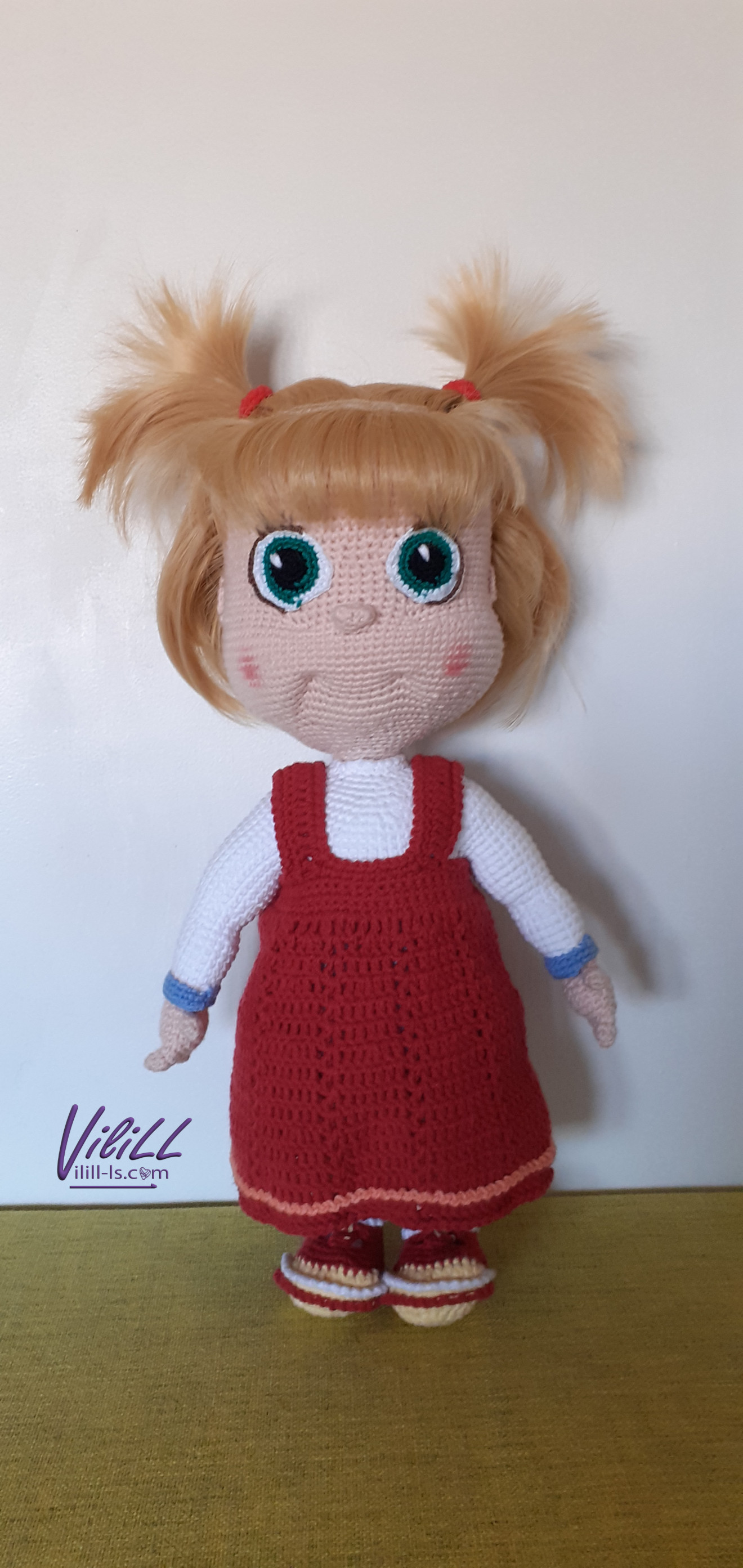 Кой обича Маша? Приблизителни размери: 1.височина- около 35 см. Материал: -прежда- смес от акрил и памук. -силиконов пълнеж; -безопасен метален механизъм, поддържащ куклата в изправено положение. Може да се постави пълен за цялостно изправено положение, може и частичен- само да държи главата изправена и да я свързва с тялото. Уточнява се в хода на поръчката. -безопасни ръчно изплетени и монтирани очички. -изкуствена коса за кукли. -пластмасово копче за роклята. НЯМА в наличност Изработва се по поръчка. Срок на изпълнение- около 1 месец. Подходяща за декоративни цели. Цена:100.00лв. Доставка до офис на Еконт за сметка на получател. Доверете се на " Люлякова стихия- ВилиЛЛ" ЕООД за изработката! При интерес, запитвания и поръчки-на 1 клик разстояние съм! Свържете се по удобен за Вас начин с мен! PS. В случай, че изберете обаждане по телефон и не успеете- опитайте отново или имайте търпение- връщам обаждане при първа възможност при получаване на служебно известие от оператор. Има понякога проблем с обхвата, въпреки че съм в населено място. Предварително се извинявам за възможното неудобство! Благодаря за разбирането!
