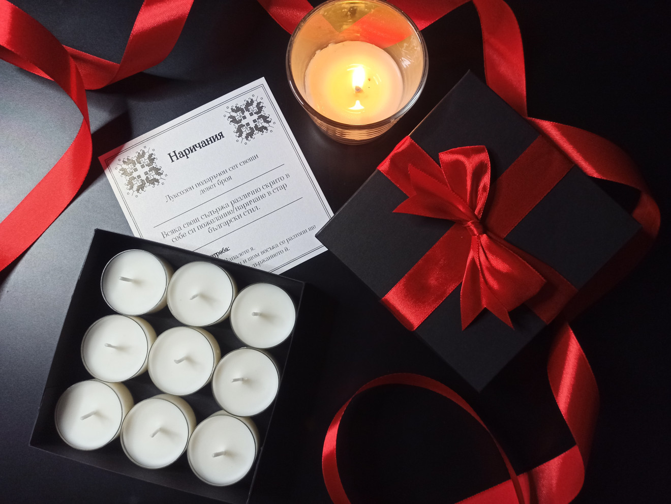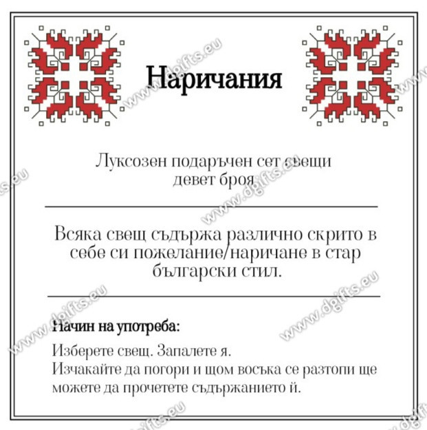 Почитаме именните дни, защото са наша българска традиция. Изключителен подарък за именник в стар български стил е този комплект свещи с наричания. Състои се от 9 свещички, всяка от които има в себе си скрито различно послание -наричане. Нужно е да бъде запалена свеща за да може да се прочете наричането съдържащо се във всяка свещ. Опаковано е в луксозна подаръчна кутия с декорация.