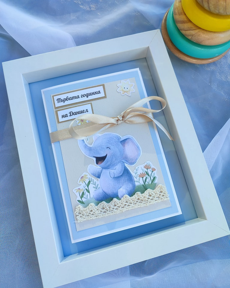 ?Красиви и нежни цветове - бебешко синьо и бежово, допълнени с памучна дантела и сатенена панделка ? В него се крият 12 илюстрации, съответстващи на месеците от първата годинка и 12 странички предвидени за снимка.