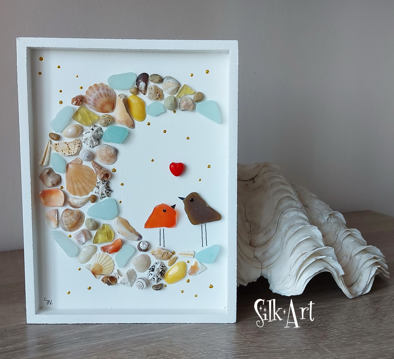 Дървена основа с размер 15/20 см. Декорация с морски стъкълца, раковини.