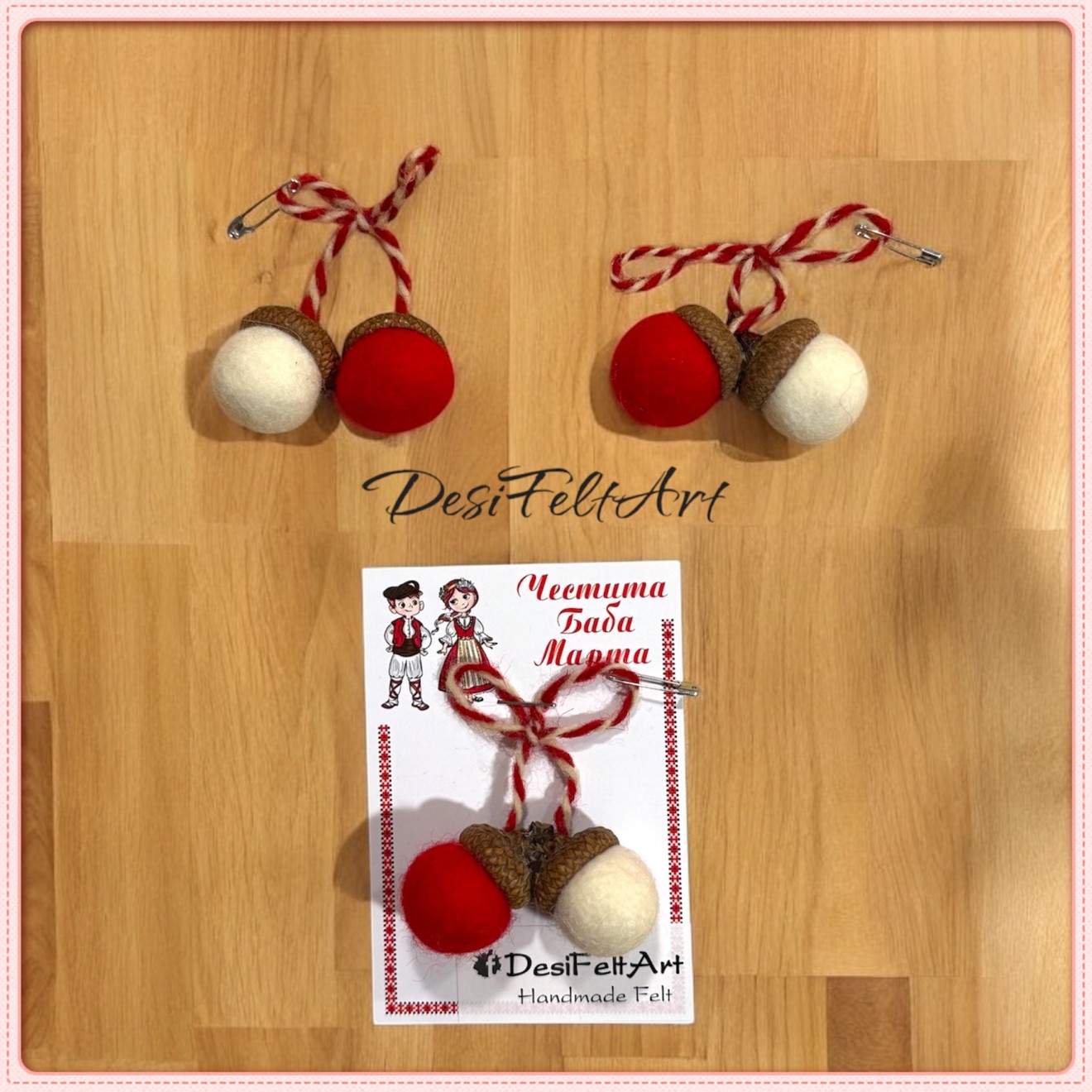 Ръчно изработени мартенички от естествени материали - вълна и жълъдова шапчица. Закичват се с безопасна игла Подходящи са за мъже, жени и деца Цената е за 1 брой Не са подходящи за деца под 3 години