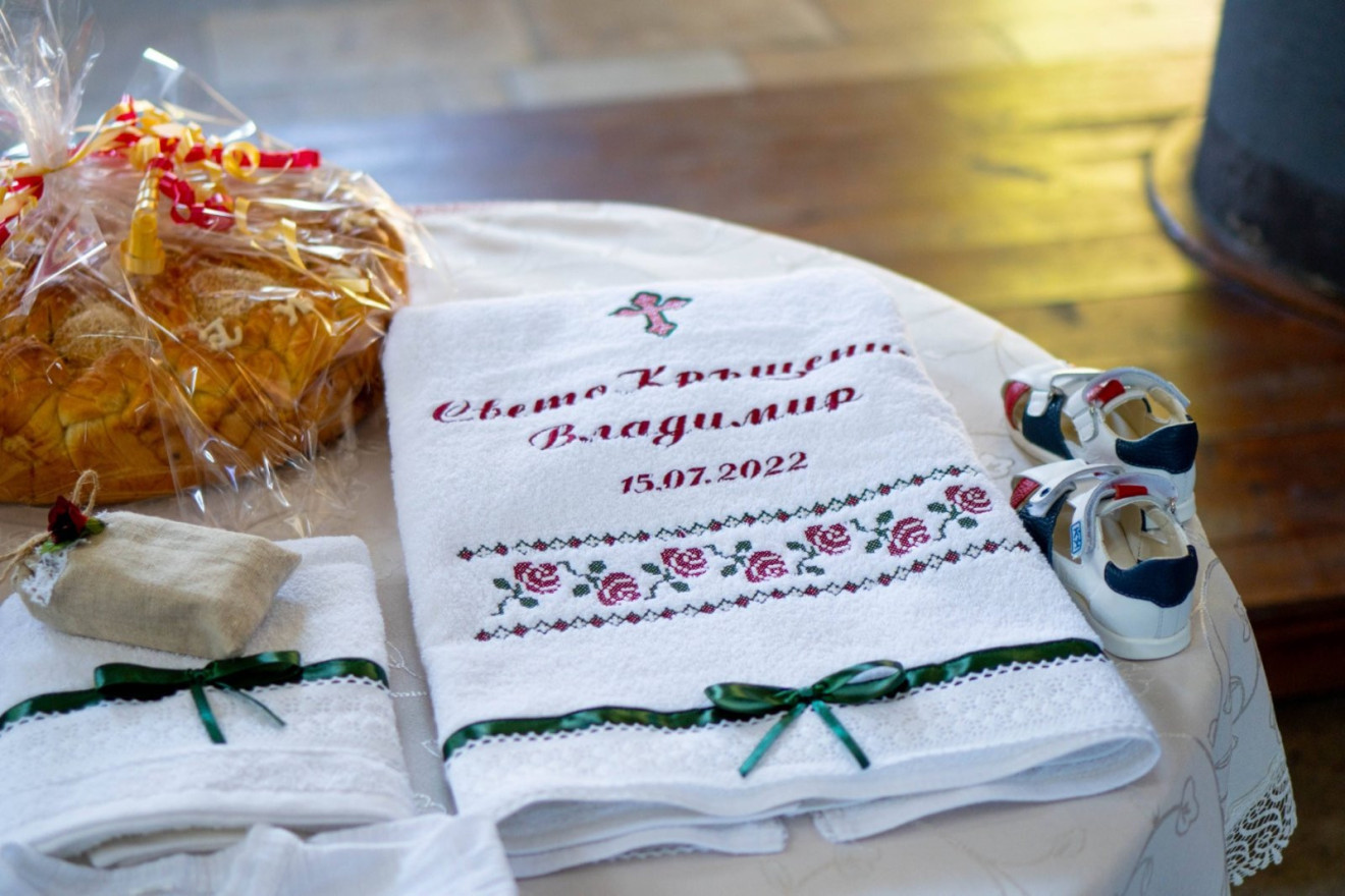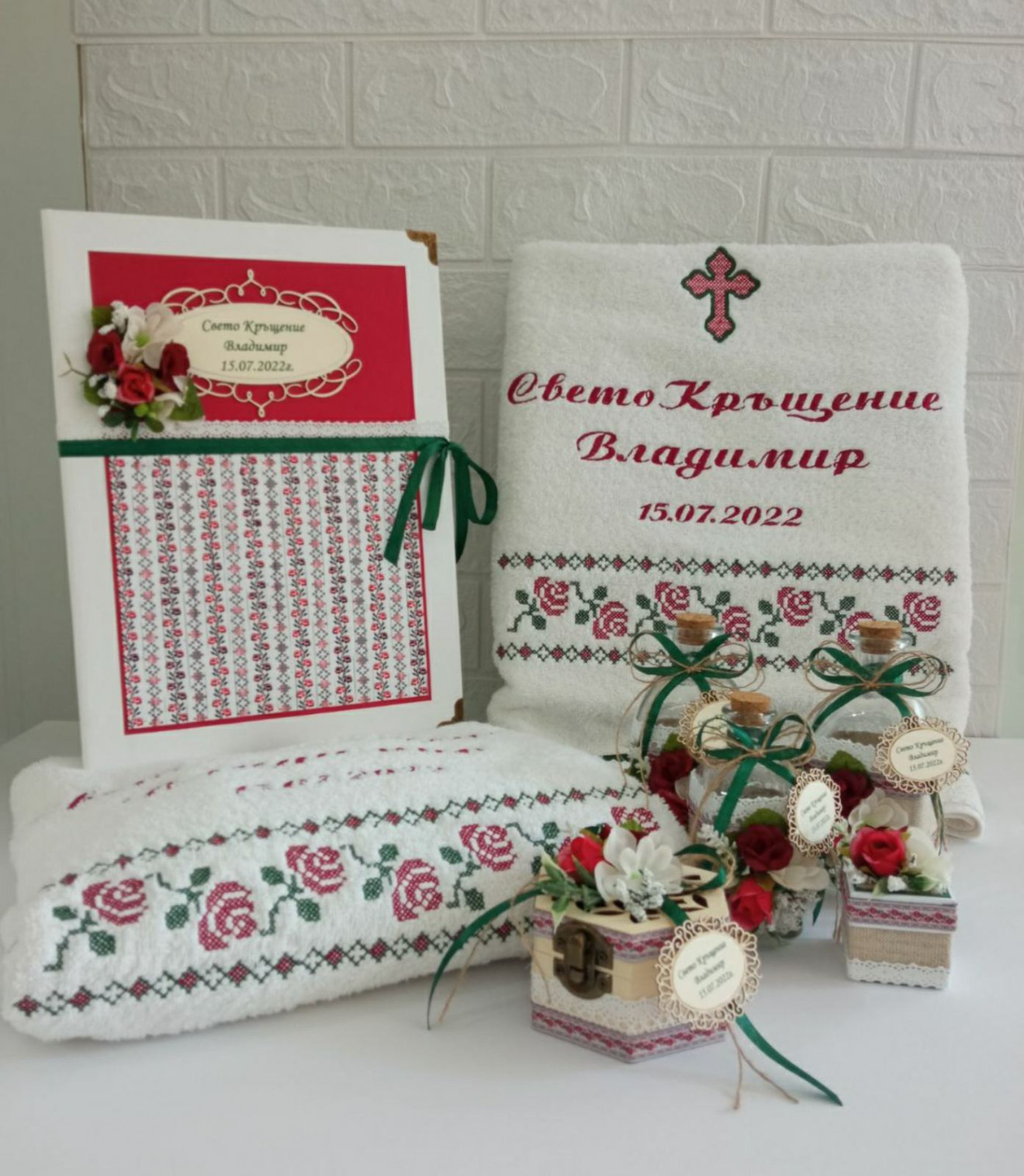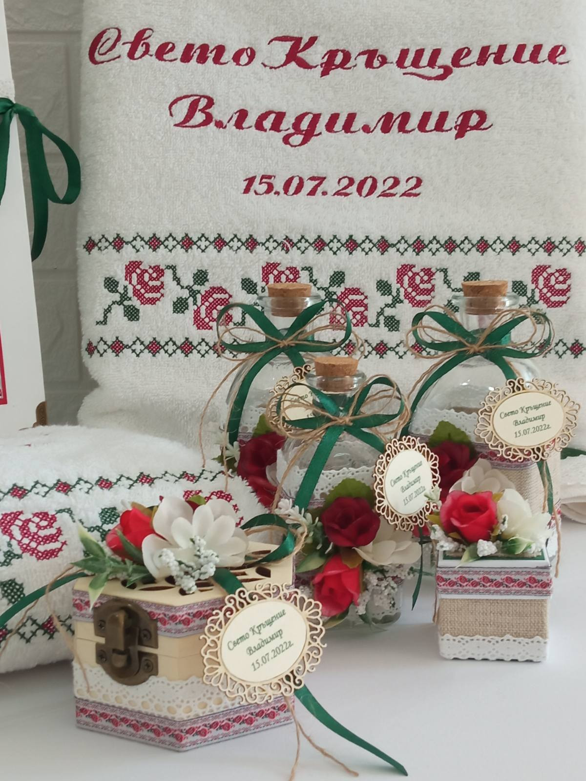 Комплект аксесоари за кръщене с декорация в етно стил, подходящ и за момче и за момиче. Моделът включва: - папка за кръщелно свидетелство, шишенце за миро, шишенце за светена вода, кутийка за косичка, кутийка за кръстче, голяма хавлия с бродерия, дантела и панделка, малка хавлия със същата декорация. По желание може да се добави кутия за дрехи, книга за пожелания, бурканче за мед, свещ с декорация и др.