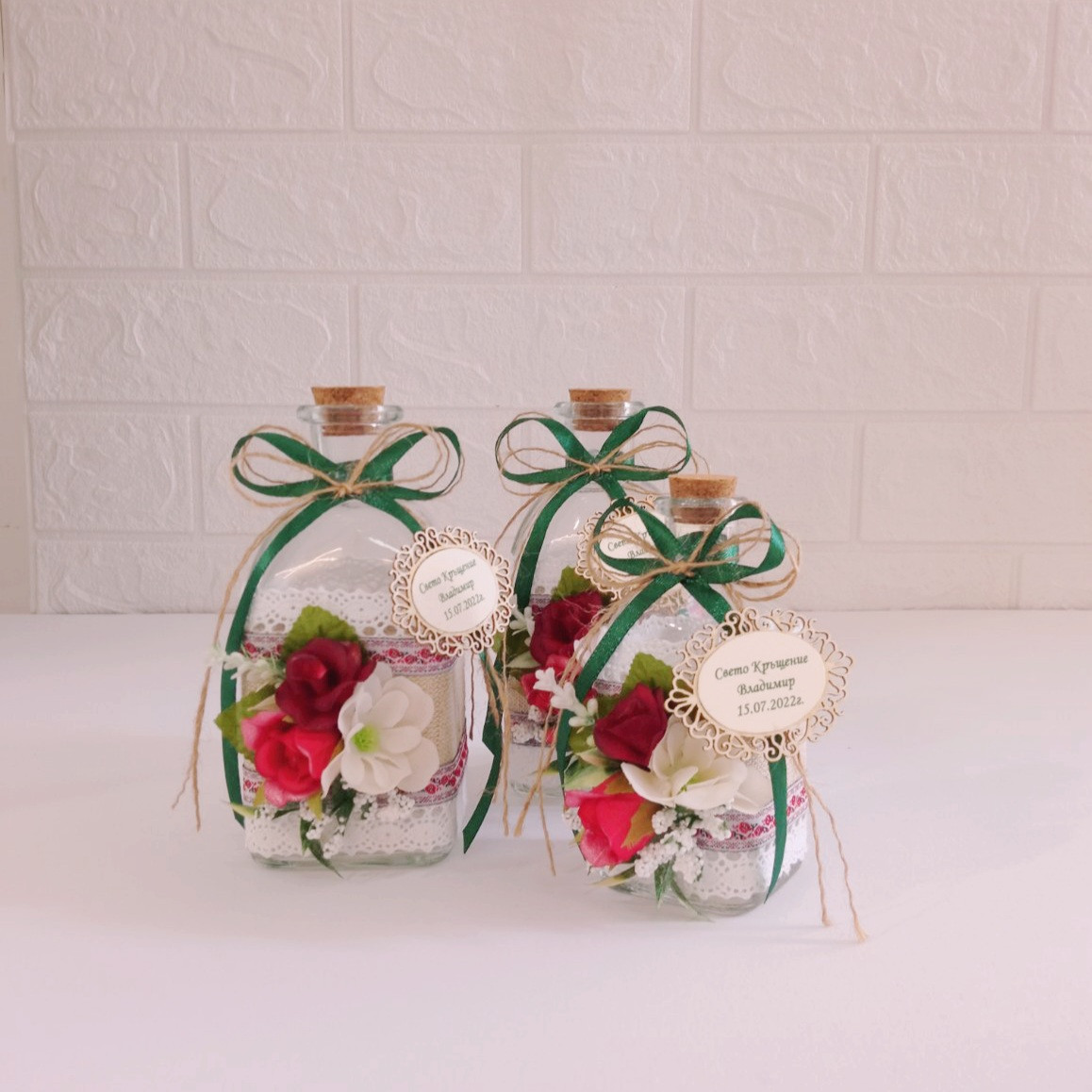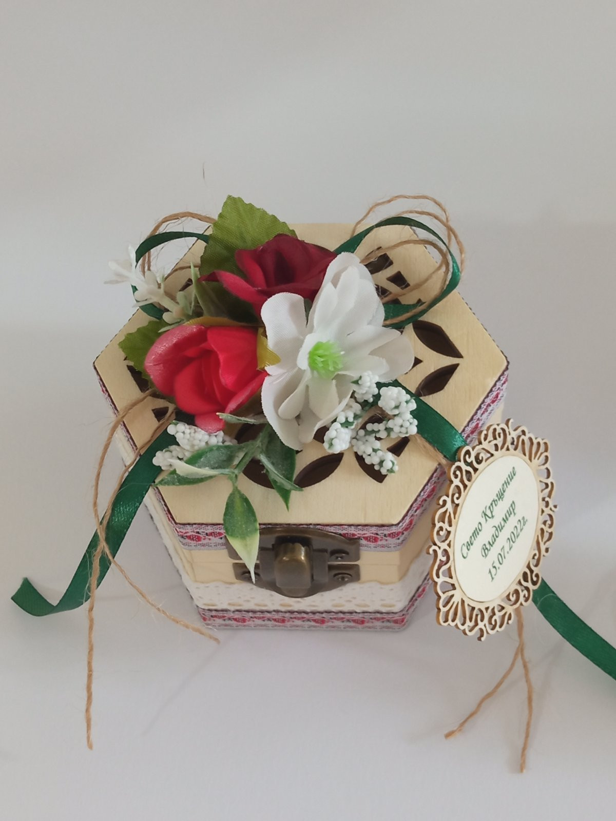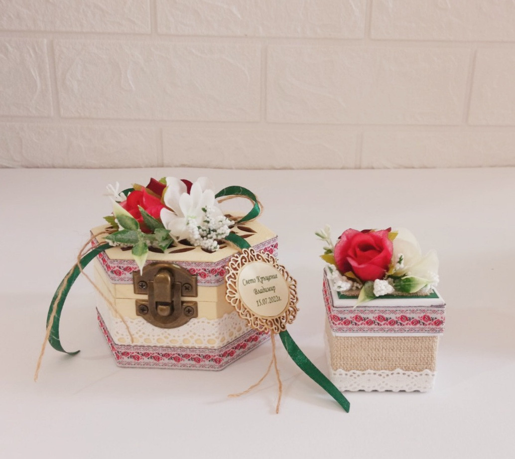 Комплект аксесоари за кръщене с декорация в етно стил, подходящ и за момче и за момиче. Моделът включва: - папка за кръщелно свидетелство, шишенце за миро, шишенце за светена вода, кутийка за косичка, кутийка за кръстче, голяма хавлия с бродерия, дантела и панделка, малка хавлия със същата декорация. По желание може да се добави кутия за дрехи, книга за пожелания, бурканче за мед, свещ с декорация и др.