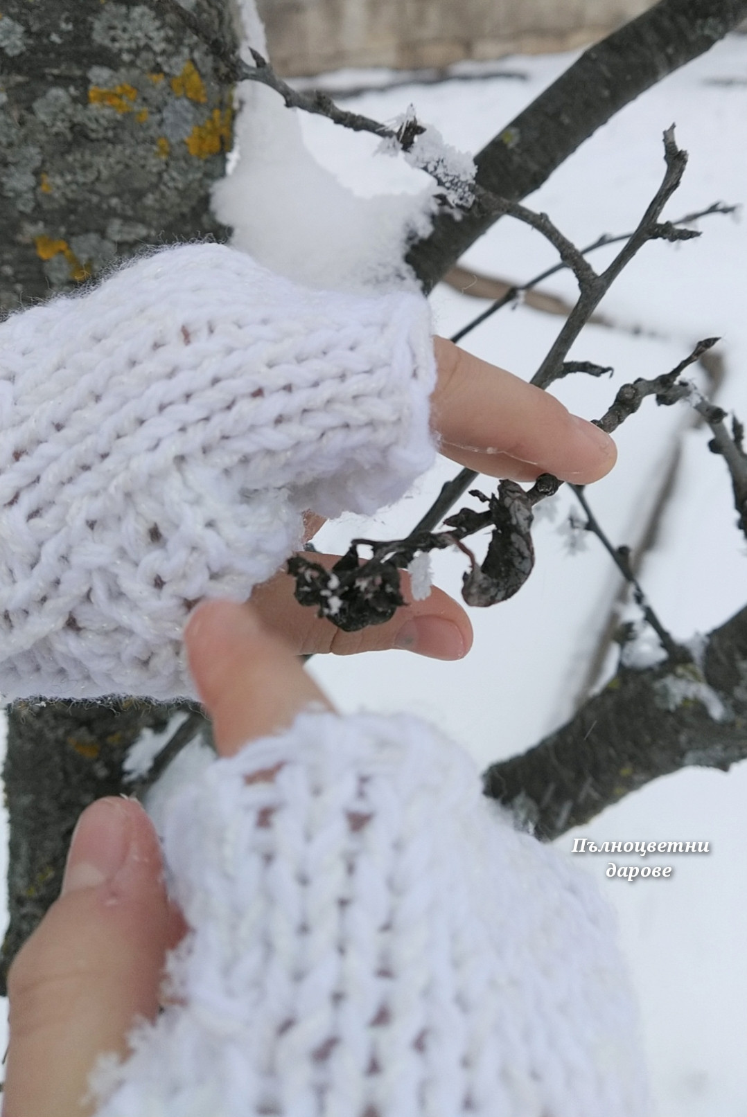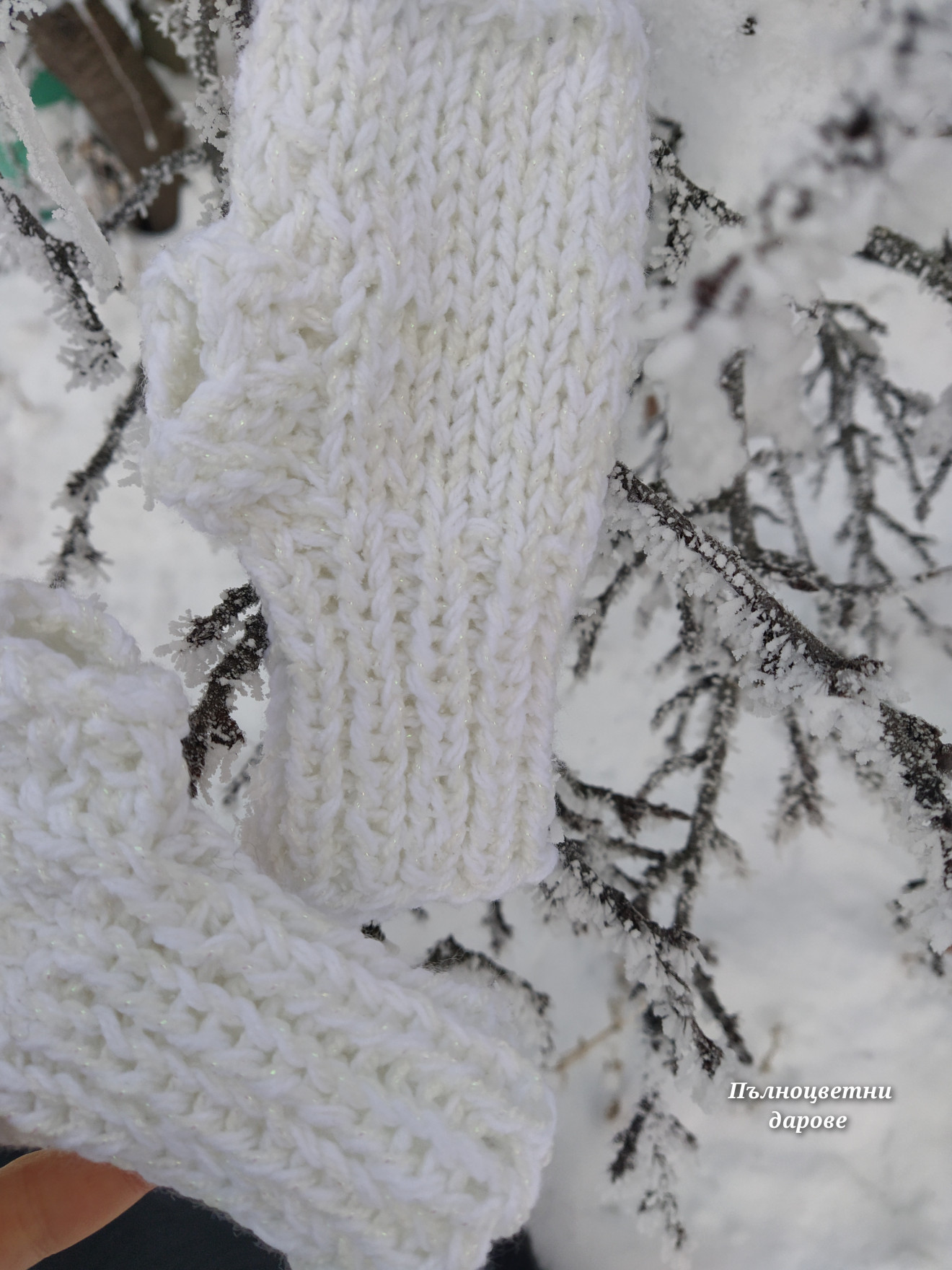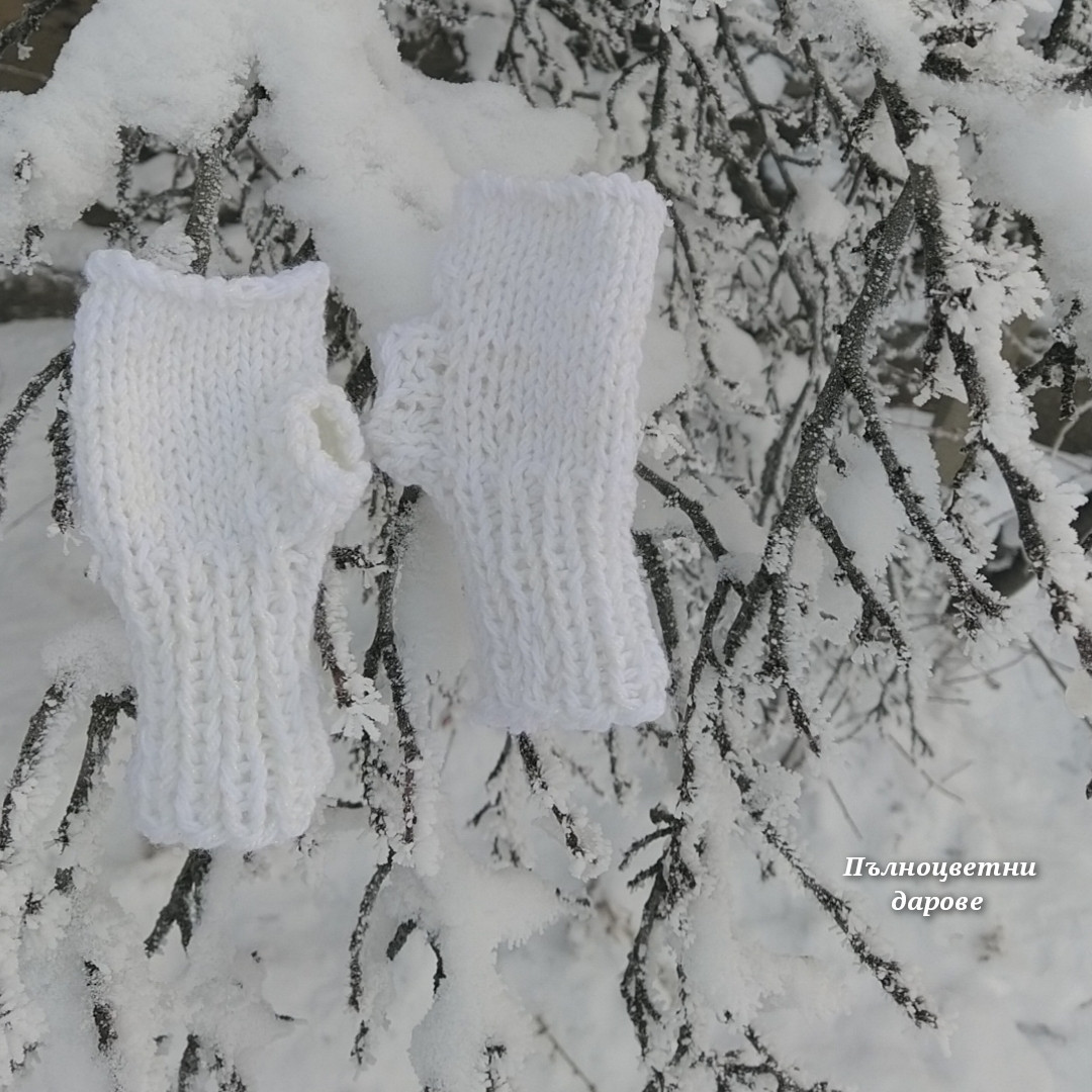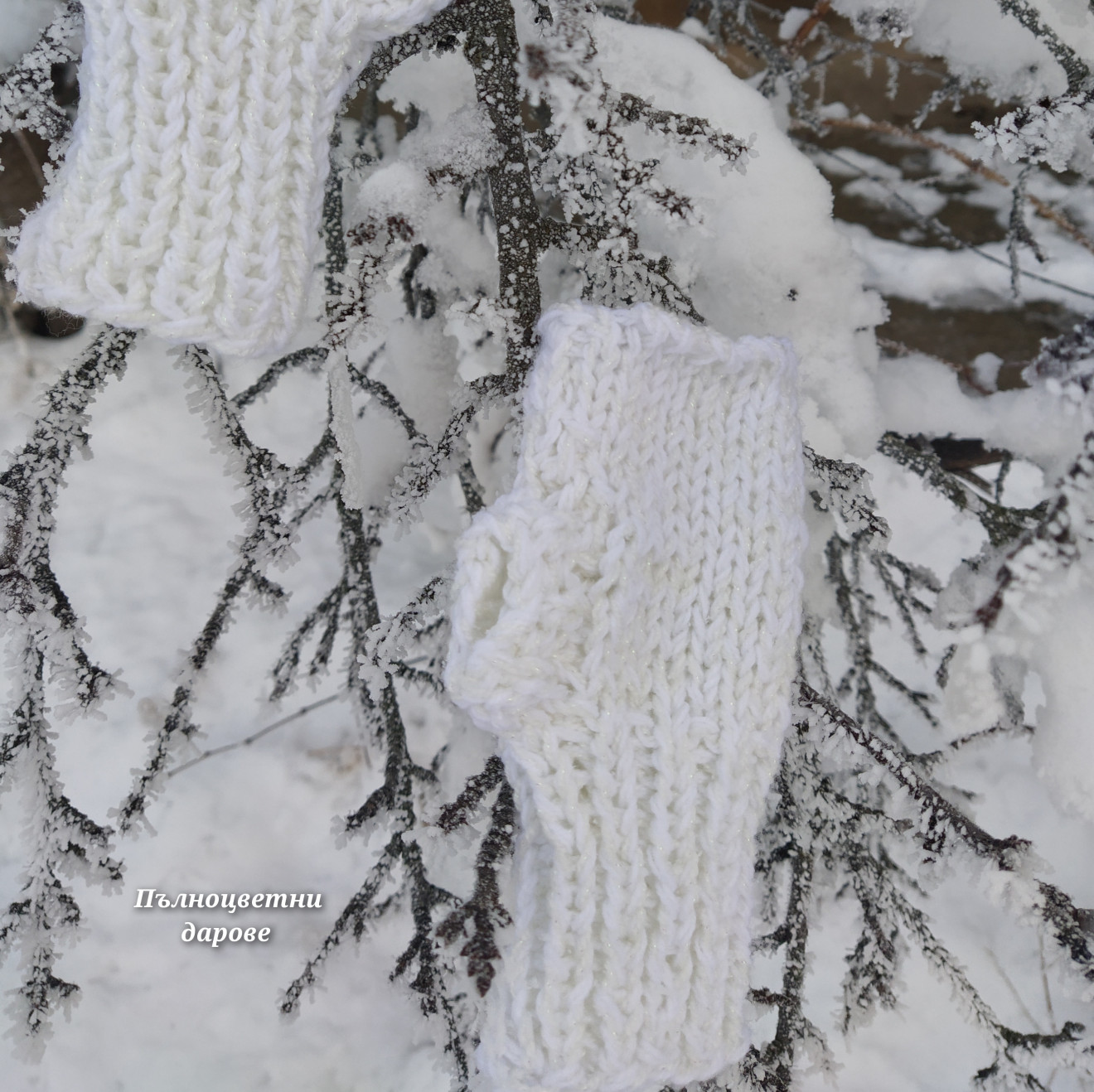 Ръчно изработени плетени ръкавици без пръсти в бяло. С добавена блестяща нишка. Меки и топли, с цветове и размер по поръчка. Тези от снимките са изплетени от прежди със състав 20% вълна и 75% акрил, 5% металик и 100 % акрил. Изработват се и във вариант с капаче. Преждата може да бъде с променливо съдържание на вълна, с алпака, мохер, друга смес или 100% акрил. Съобразяваме се с идеята и желанията на получателя. Срокът за изработване зависи от текущия график. Напишете съобщение, за да уточним детайлите. Благодаря! Пълноцветни дарове ?