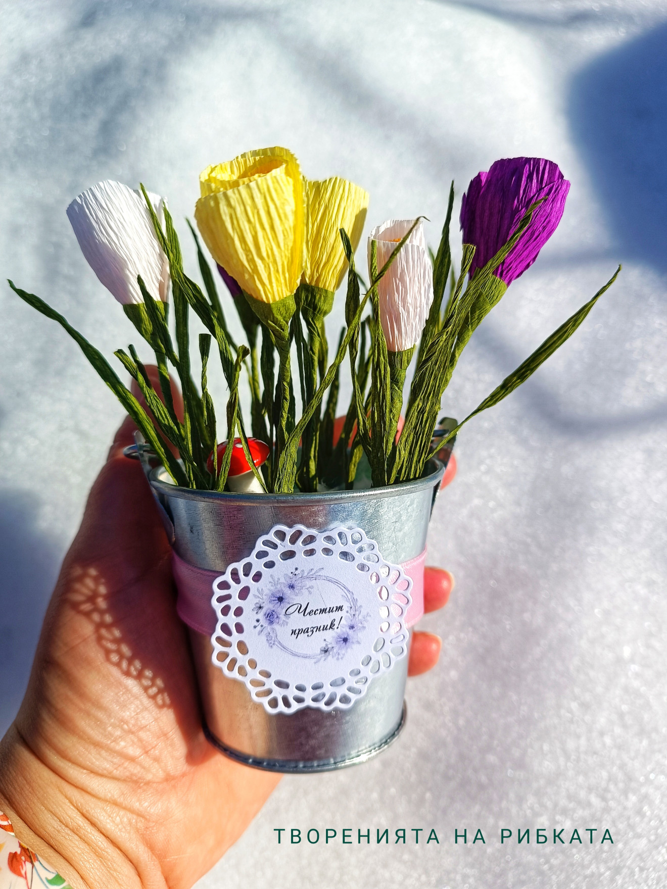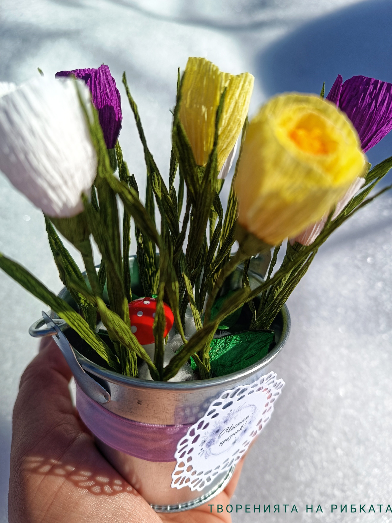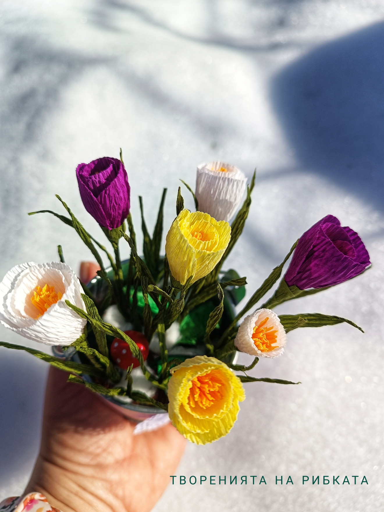 Разцъфтяха се сред снега ни в двора. ? Минзухарчета в реален размер от креп хартия в метална кофичка. Добавих им малко "сняг" за разкош и една рано рано поникнала гъбка. ☺️ Височина на аранжировката: 15-18см.