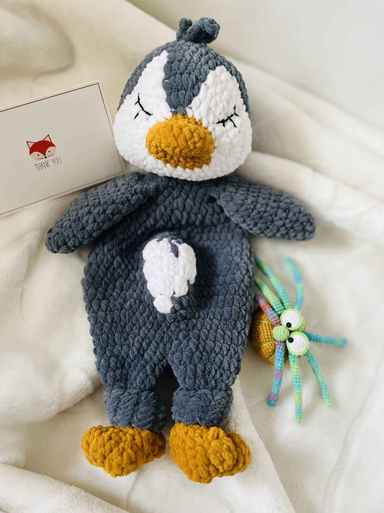 Ръчно изработено плюшено пингвинче от хипоалергенна прежда и силиконов пълнеж, без пластмасови елементи. Пълнеж само в главичката, което го прави идеално за спане и декорация. Размер 43 см.