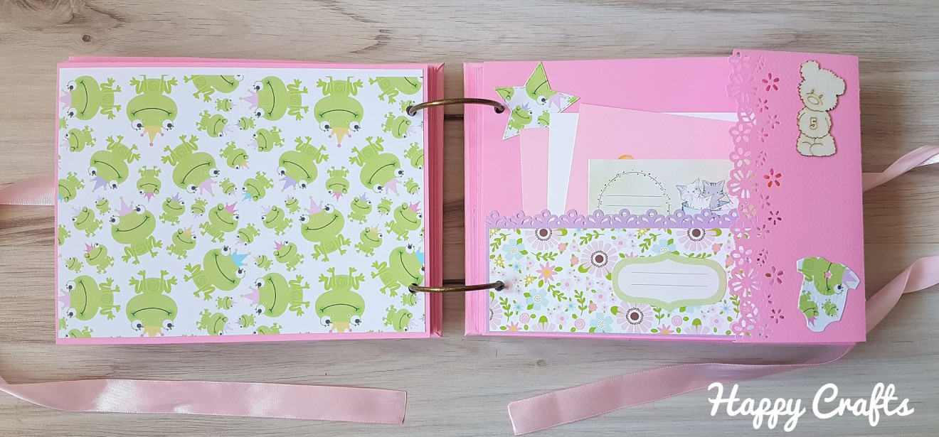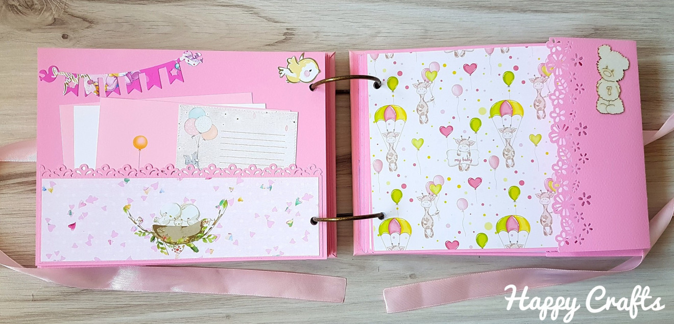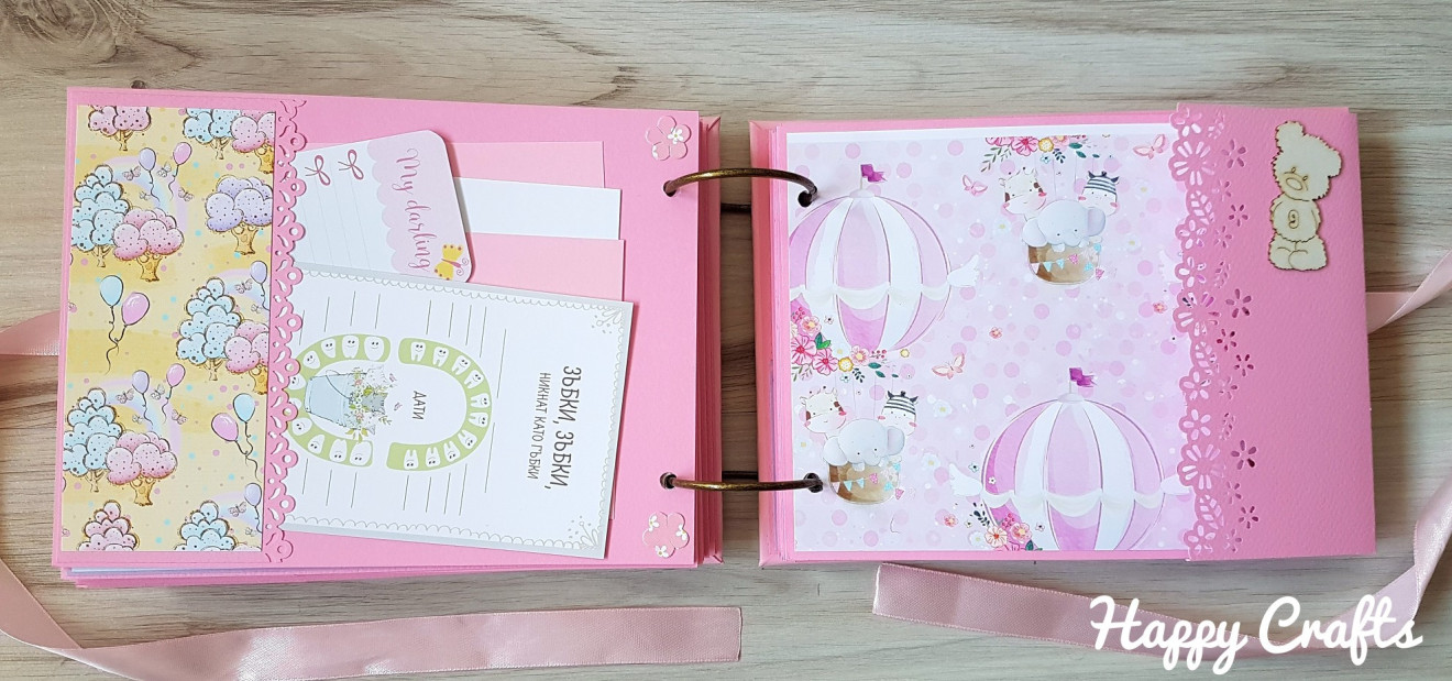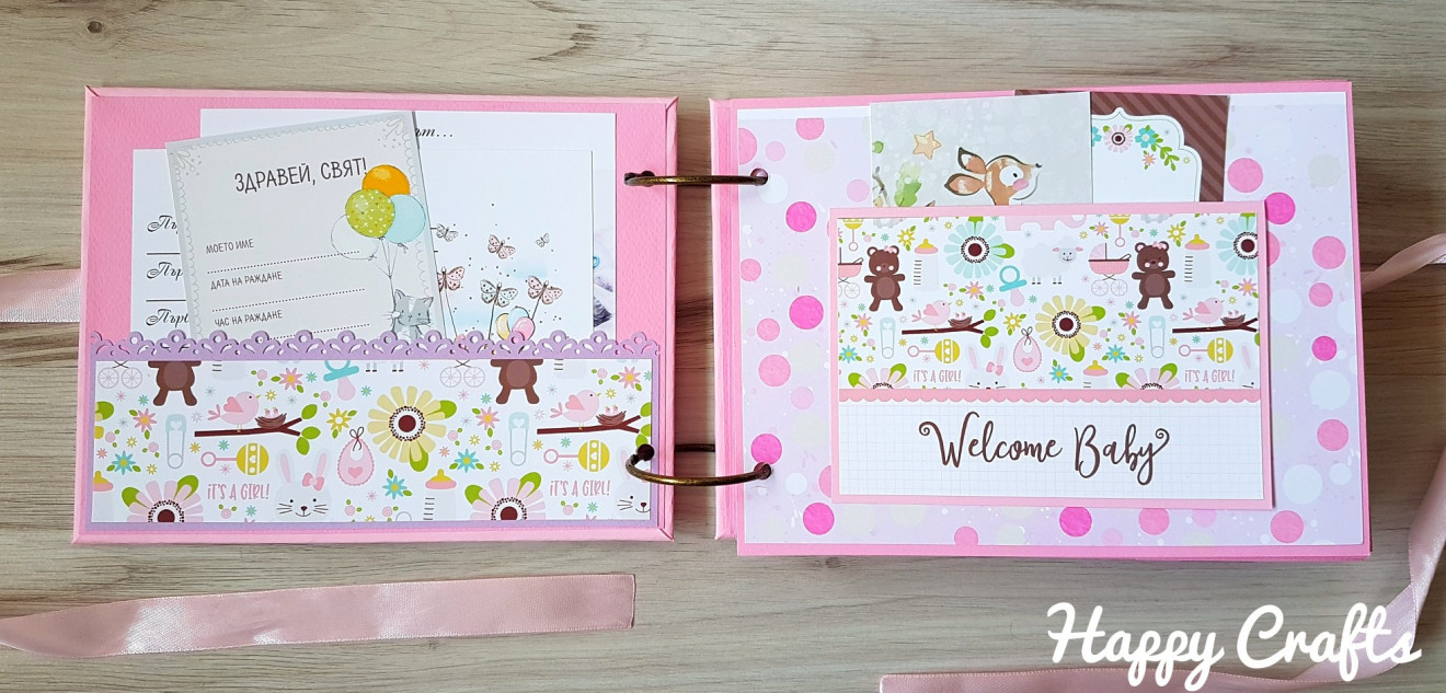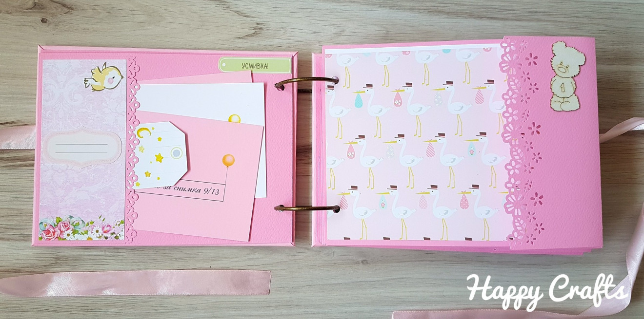 Бебешки албум за момиче, в което ще откриете: ?28 изцяло декорирани страници с размери 16х22 см, които побират около 50 снимки с размер 10/15 см; ?място за записване на данните на бебето – имена, дата и час на раждане, тегло, ръст; ? място за записване на първите най-важни моменти след неговото раждане – първата нощ у дома, първо гукане, първи стъпки и т.н.; ❤ обозначения за всеки месец от първата годинка на бебето; ☑ Албумът може да се изработи и в други цветове, а също така и за момченце.
