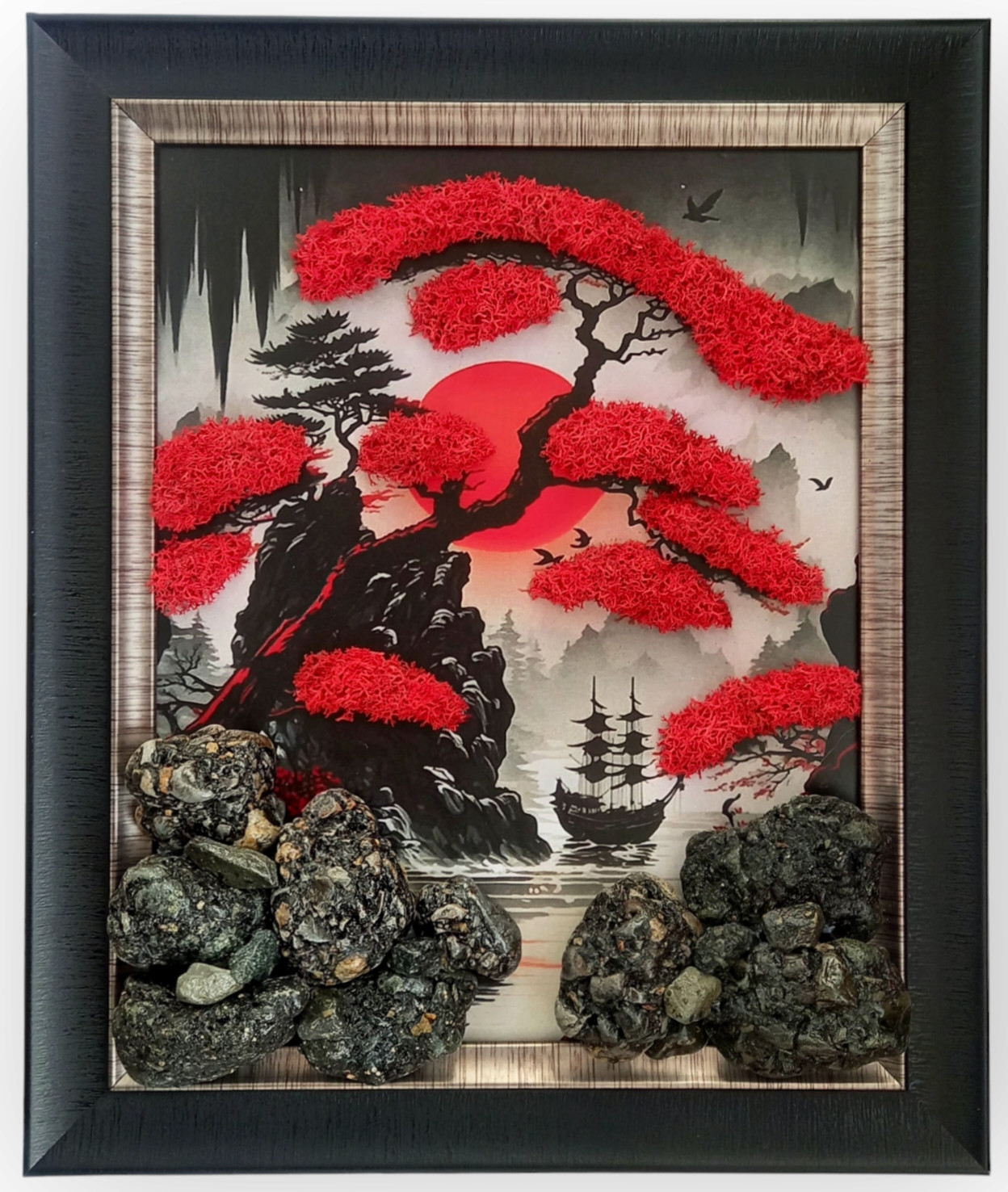 Картина със скандинавски мъх и морски камъчета. Размери 25/30 см.