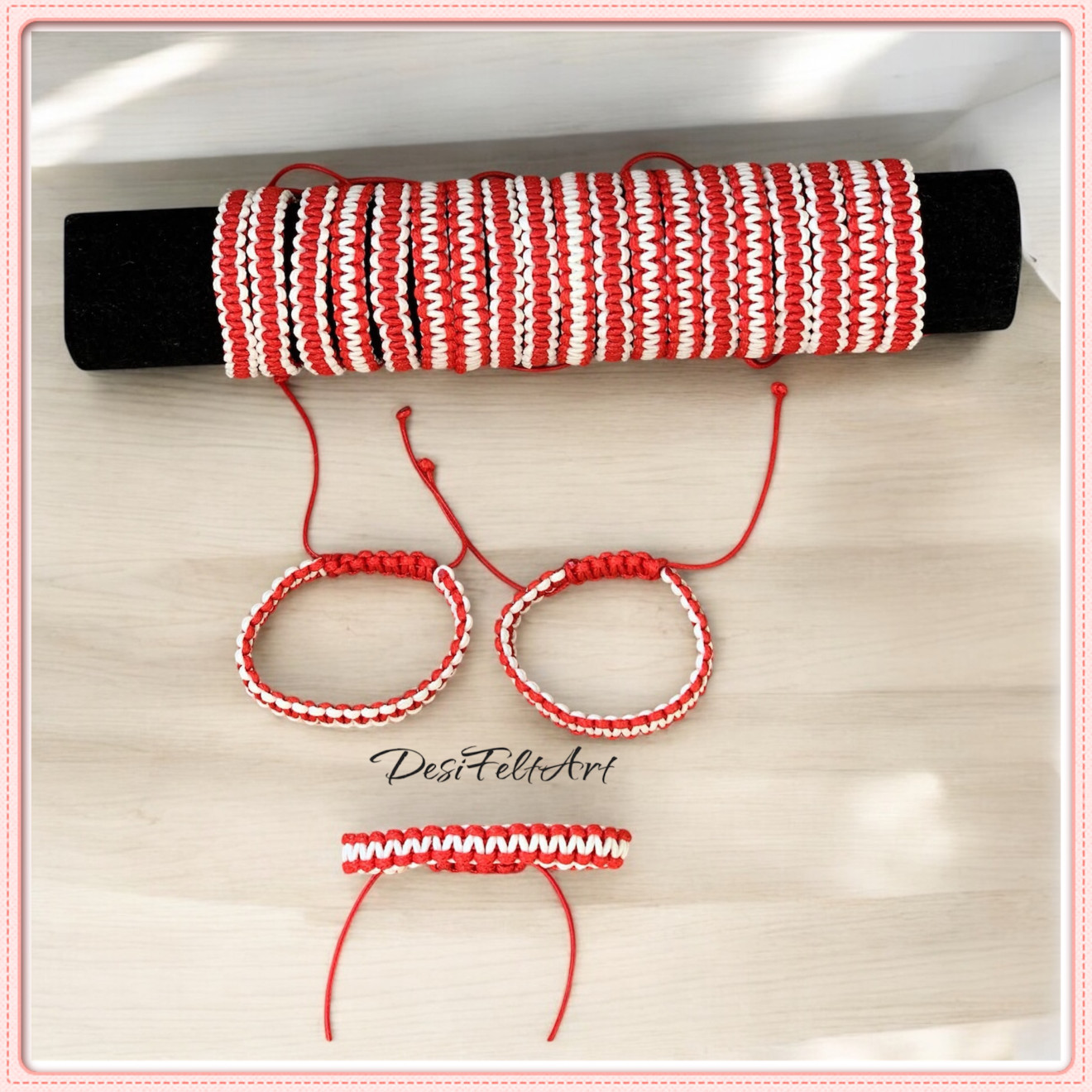 Ръчно изплетени мартеници от водоустойчив полиестерен шнур, чрез плетка шамбала. Размера се регулира, дебелина - около 1см. Цената е за 1бр. Опаковани и готови за подаряване :)