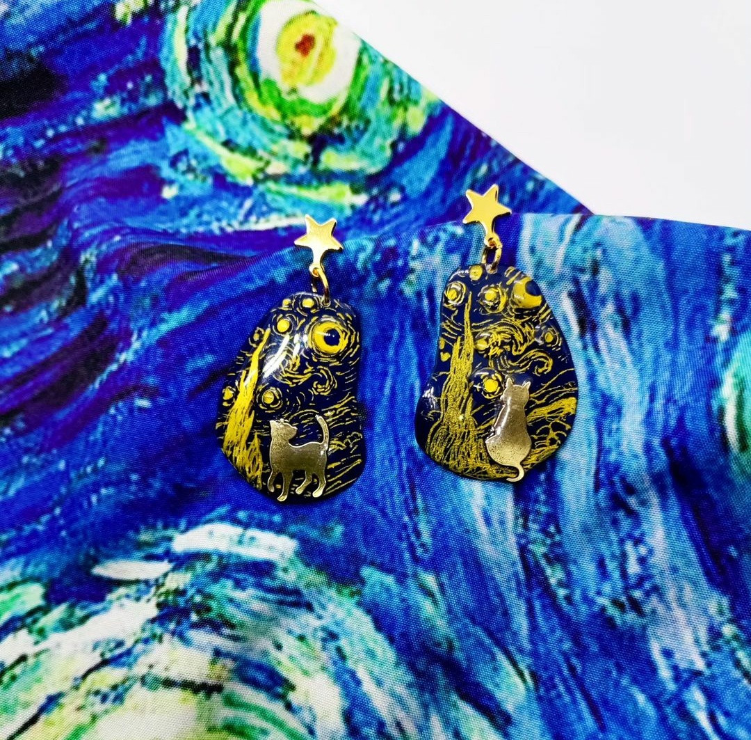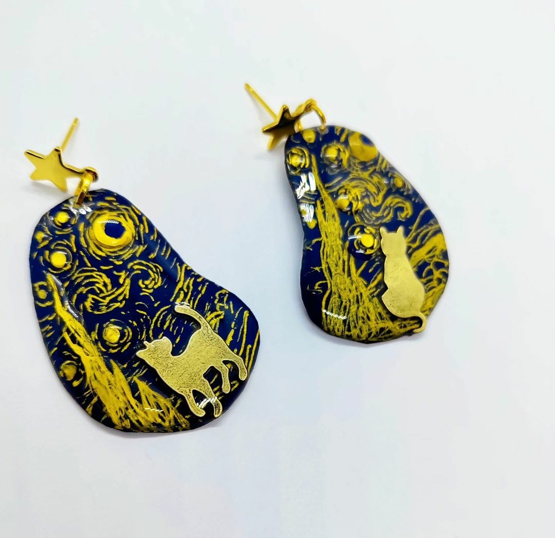 Ръчно рисувани обеци от смола в тъмно синьо и златно с вграден метален елемент