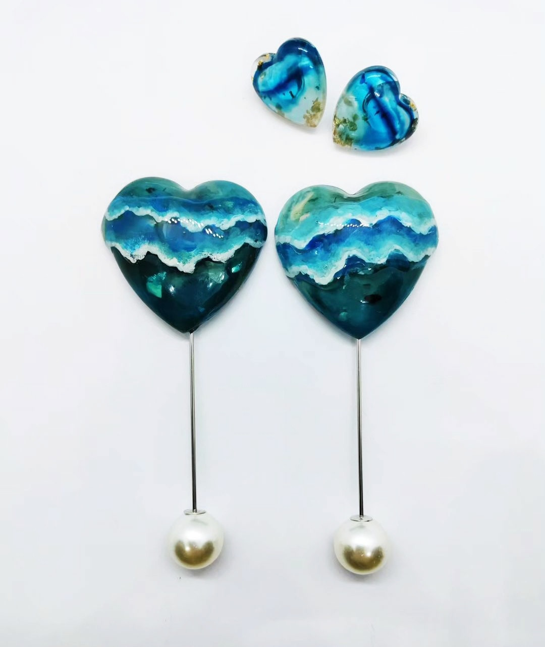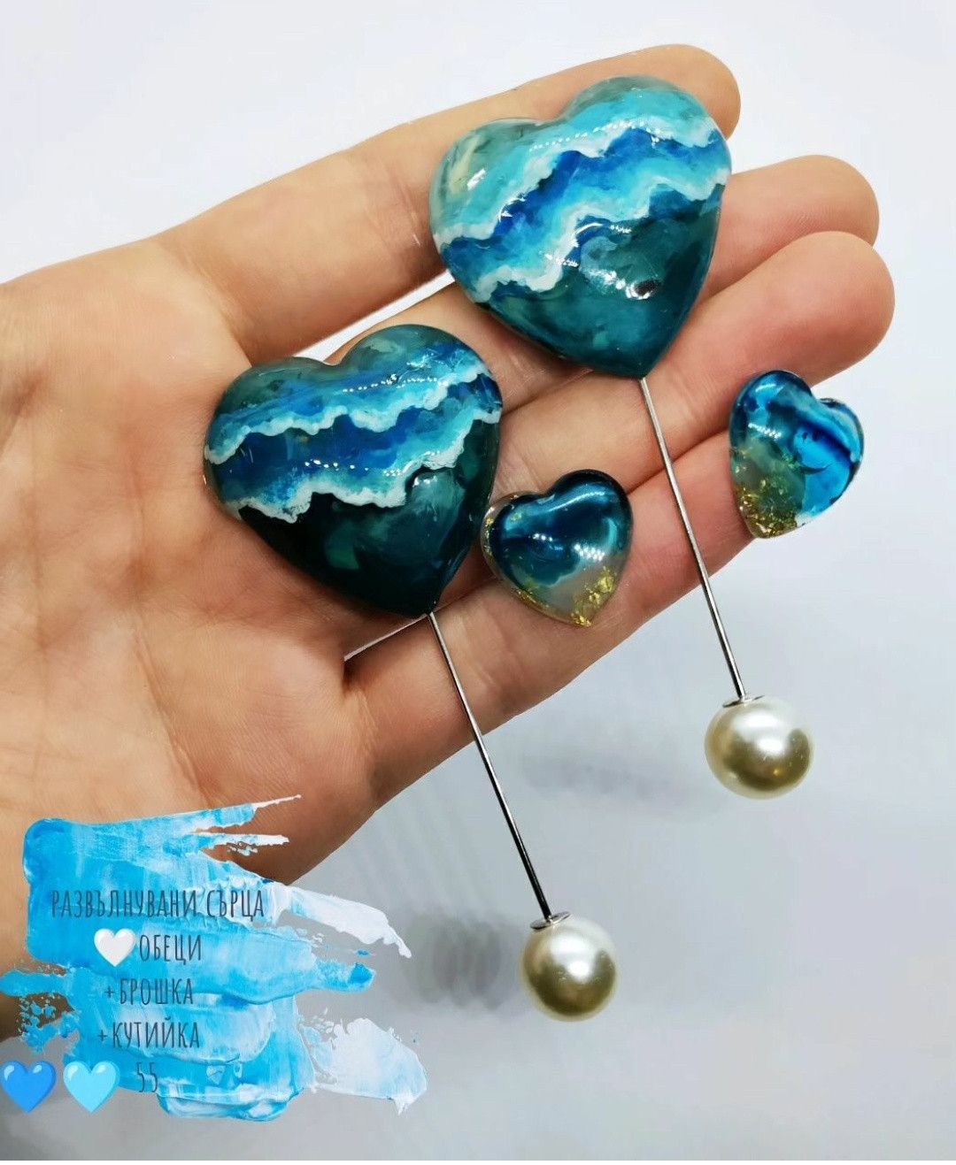 Ръчно изработени от няколко слоя смола обеци на силиконов винт и брошка с перлено топче. Развълнувайте близък или себе си с Море в сърце. Ще получите и ръчно рисувана кутийка Може по поръчка
