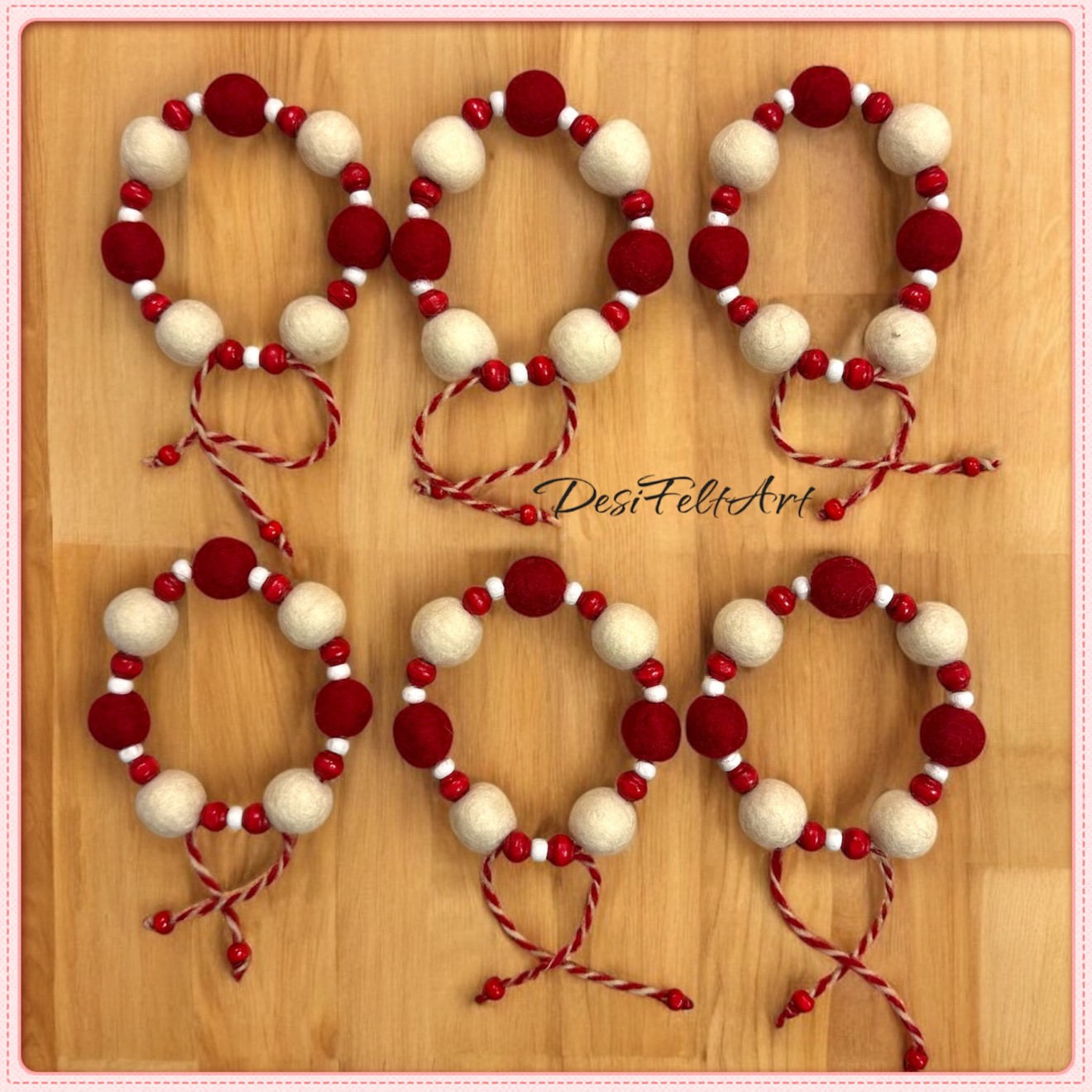 Ръчно изработени мартенички от вълна и дървени елементи. Размер на топчето - около 1,5см. Дължината на гривната се регулира. Цената е за 1 брой Красиво опаковани и готови за подаряване :)