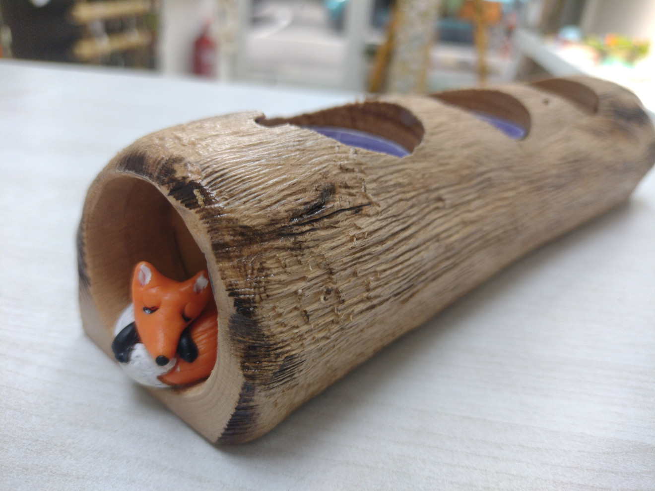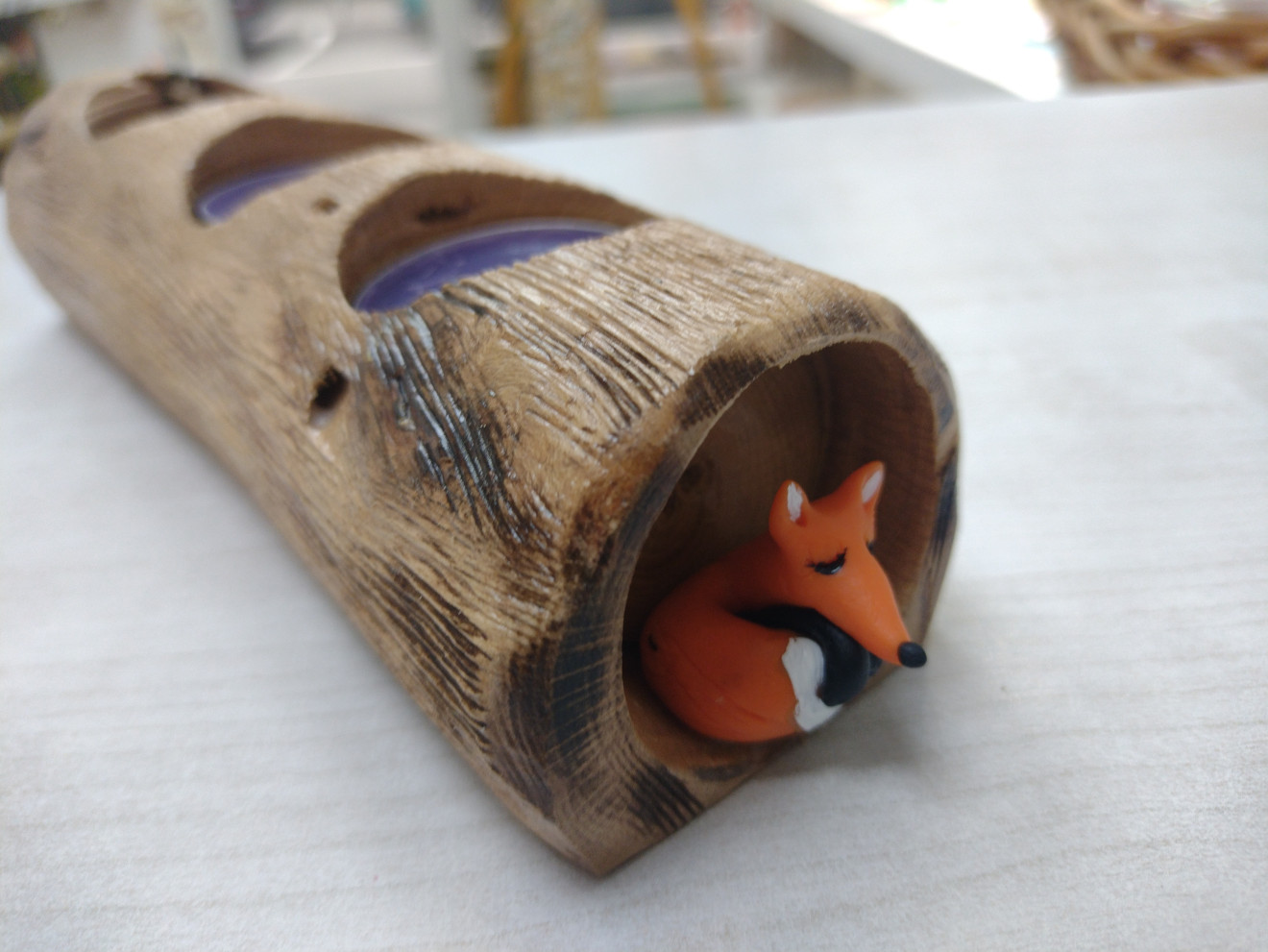 Дървен свещник за 3 броя свещи, Лисички от полимерна глина