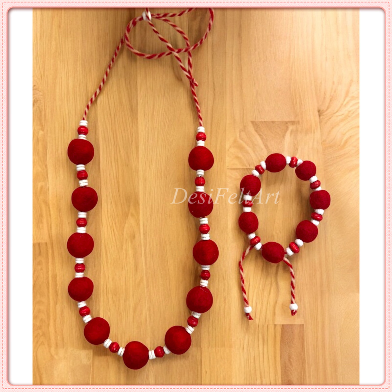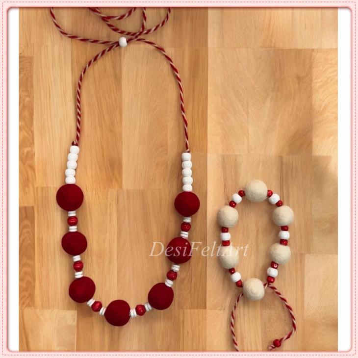 Топчетата са изработени, чрез техника мокро плъстене. Размерът им на колието е около 2см, а на гривната - около 1,5см.