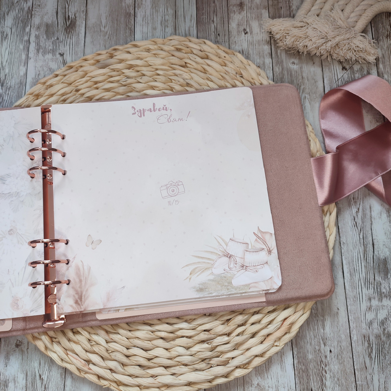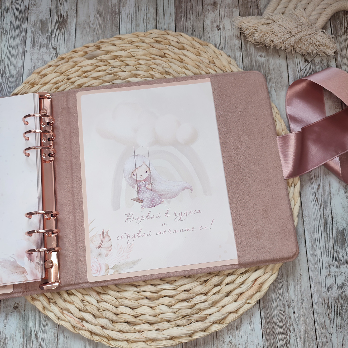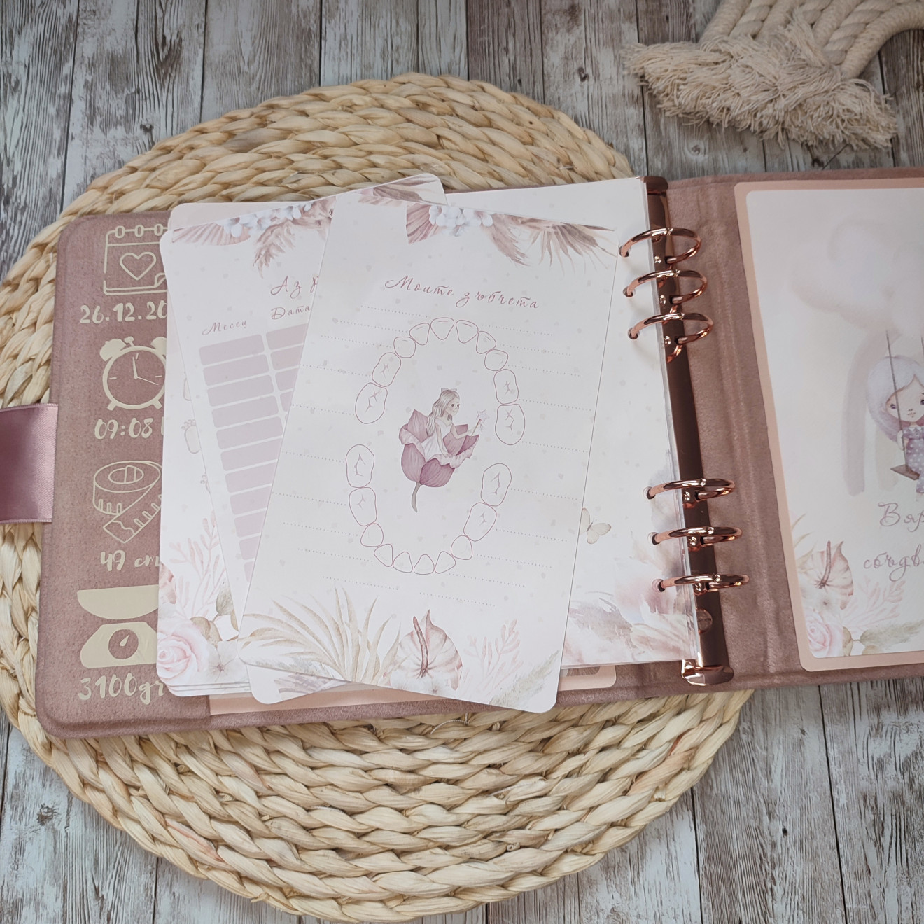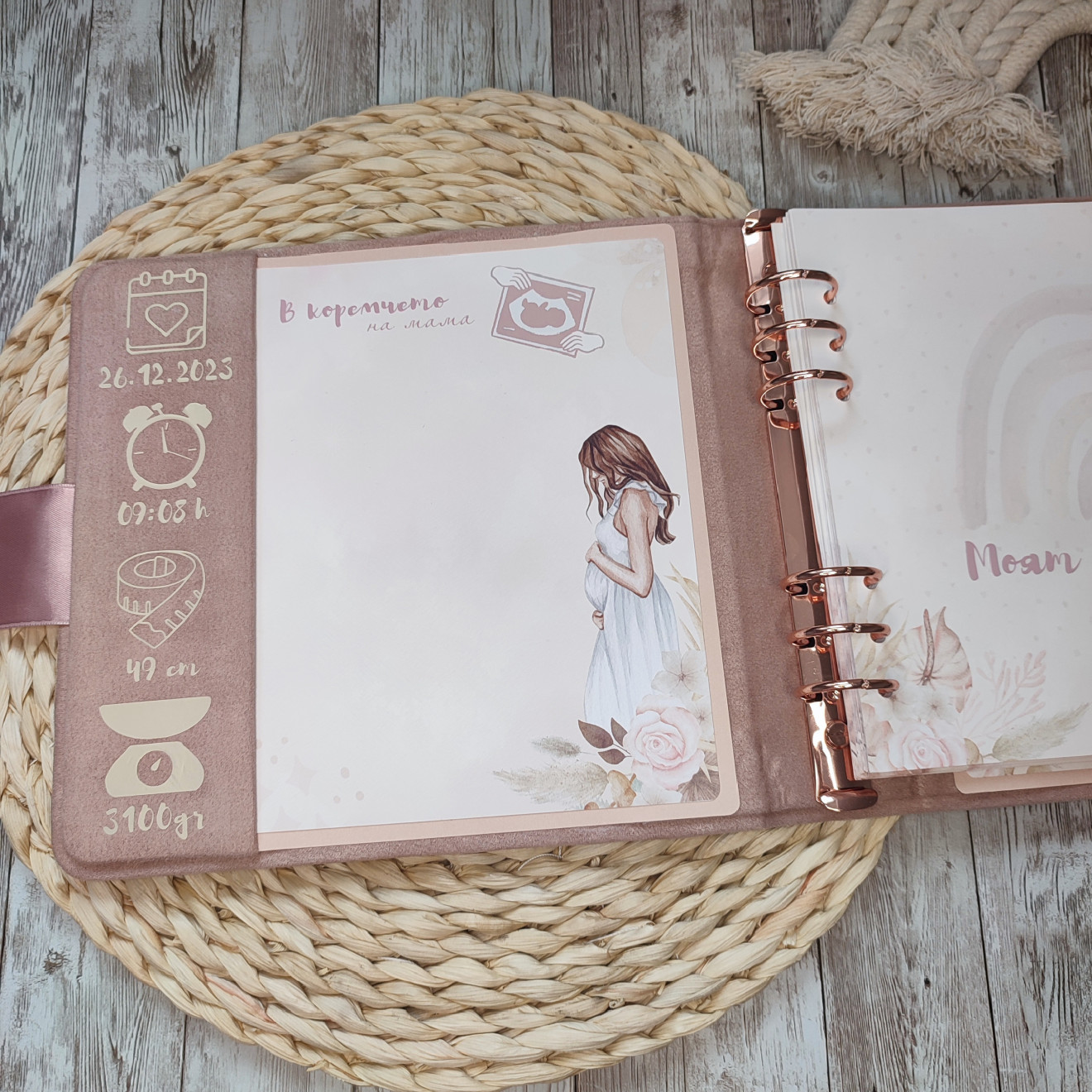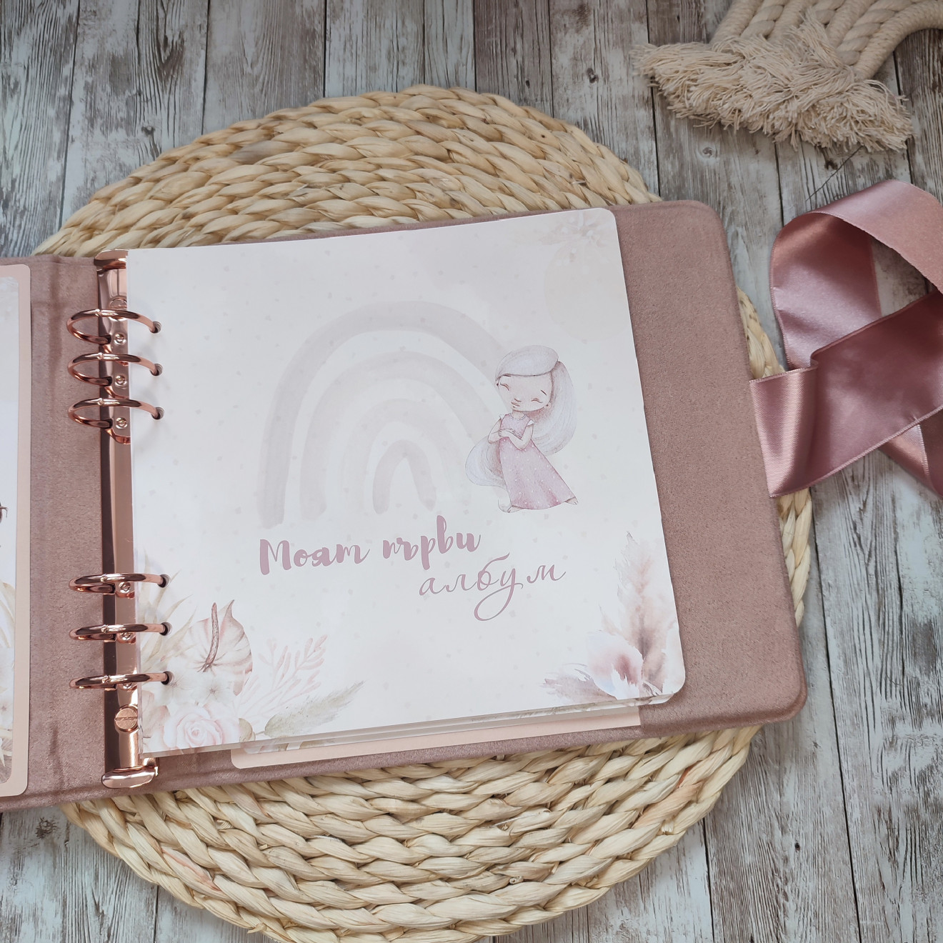Ръчно изработен албум с място за 60 снимки от първата годинка на бебето, съдържащ страници за: ~Снимка от ехограф ~Здравей, Свят! ~Снимки от изписването ~Добре дошла/дошъл у дома ~Моите родители ~Моето семейство (брат, сестра и т.н.) ~Погача ~Снимка за всеки месец от първата годинка ~Разделители за писане на дата, ръст, тегло, бележки и постижения от всеки месец (по желание на клиента) ~Първи рожден ден ~Кръщене ~Първа Коледа ~Други важни моменти от 1-вата годинка ~Място за отпечатък на ръчичка и краче (по желание на клиента) ~Таблица на растежа, Моят речник, За първи път, Моите зъбчета (по желание на клиента) Албумът може да бъде изработен според изискванията на клиента за цвят и тема, също така може да бъде изготвен и във вариант само за снимки.
