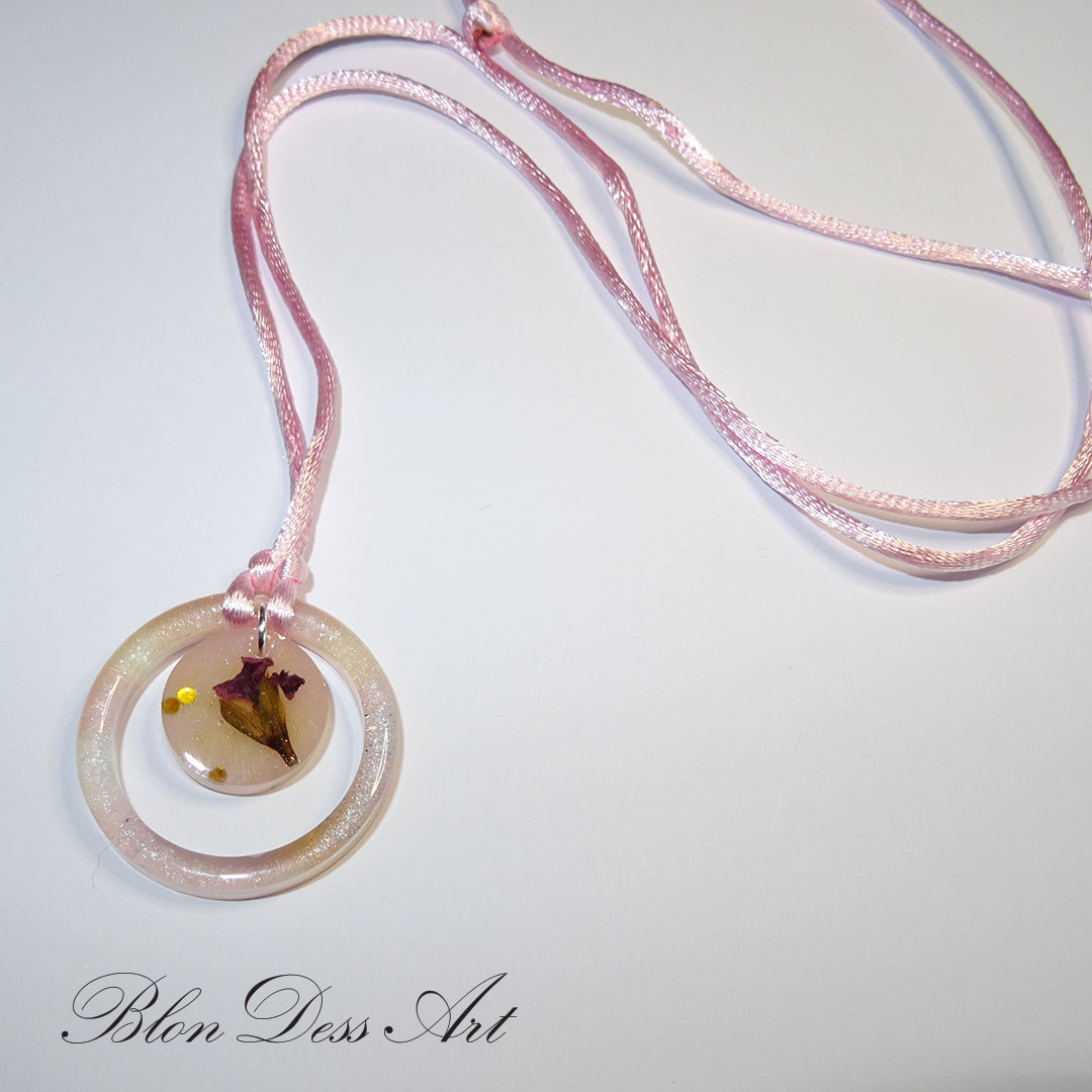Изработено е от епоксидна смола и ръчно подбрано и обработено цвете. Верижката се регулира в дължина по желание. изработена е от промазана памучна верижка, която не предизвиква дразнене.