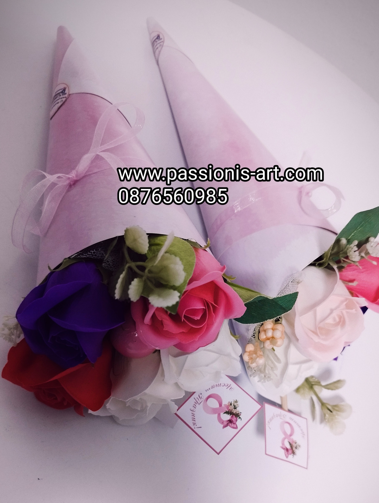 Букет от сапунени рози, декориран с листа и други декоративни цветя. Ориентировъчни размери 20 на 10 см.