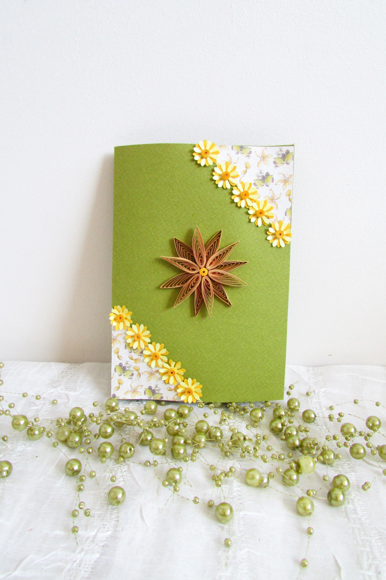 Ръчно изработена картичка с квилинг техника (хартиен филигран). Универсално допълнение към подарък за рожден или имен ден, сватба или за всеки друг повод.
