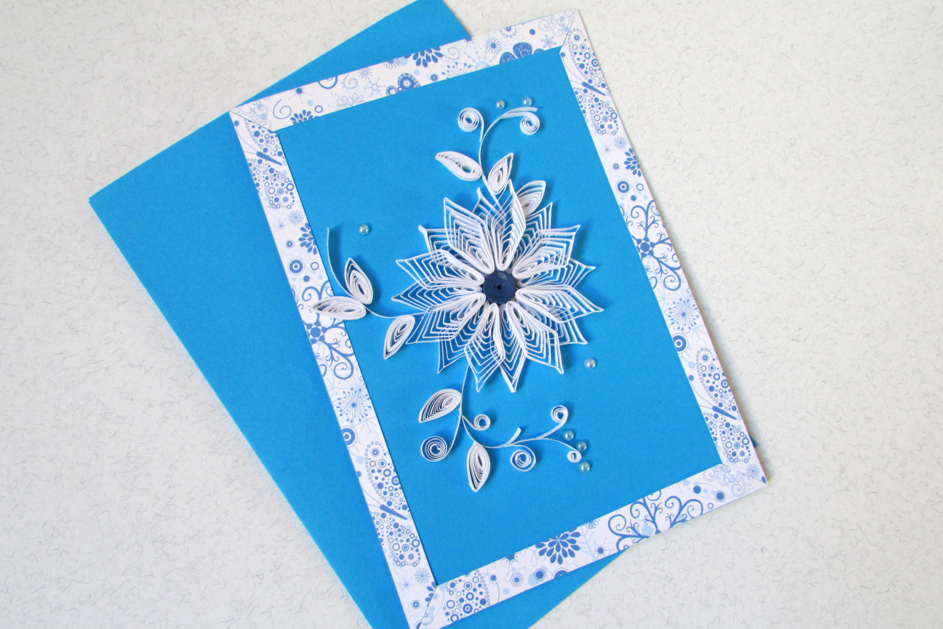 Ръчно изработена картичка с квилинг техника (хартиен филигран). Универсално допълнение към подарък за рожден или имен ден, сватба или за всеки друг повод.