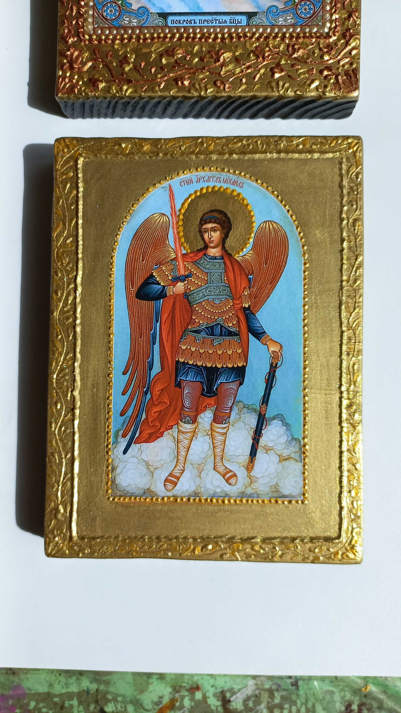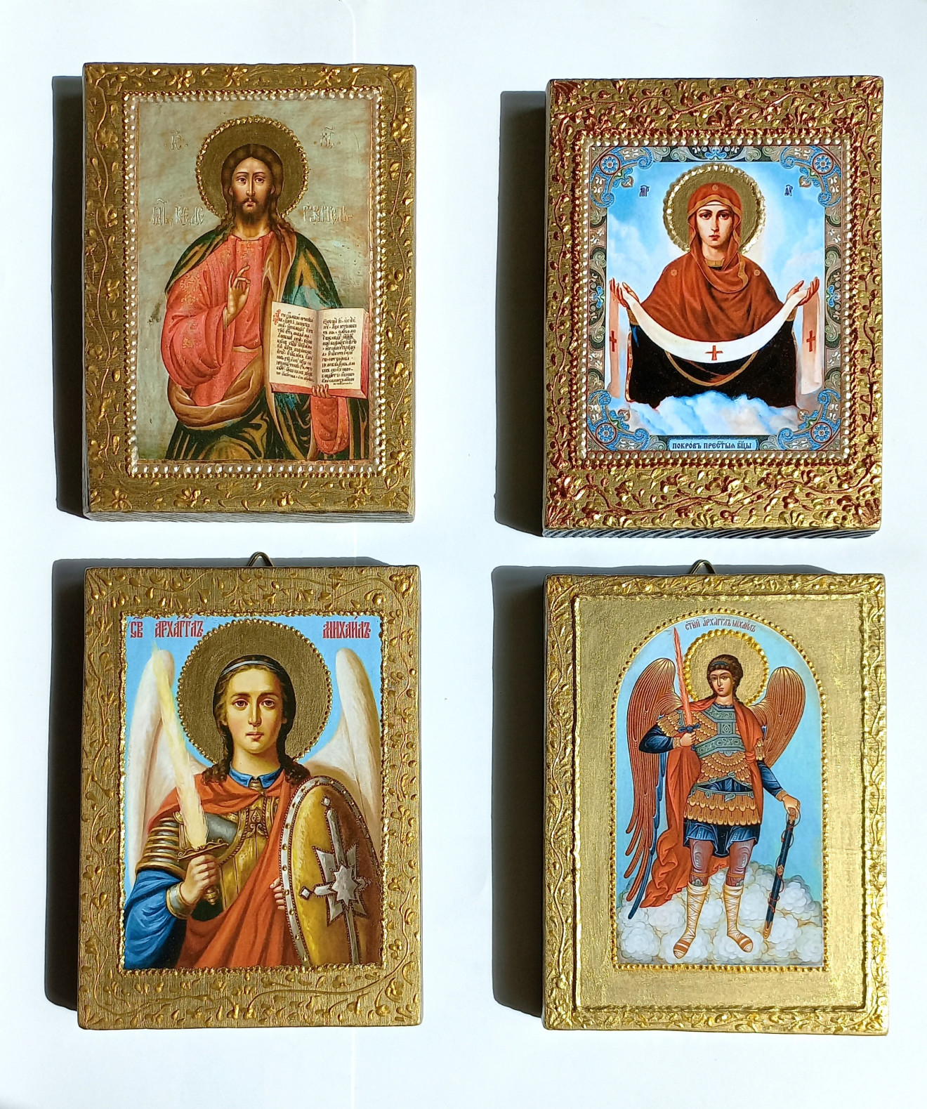 Малки икони с размер 12/16 см. Изработката на тези икони представлява декупаж с ръчно дорисуване, патениране и др. Дървената дъска се обработва по уникален старинен метод. Всяка икона е защитена с лак. Образите, които сме изработили този път са на Иисус Христос, Майка Богородица и Архангел Михаил. Изработваме и размери 20/25 и 20/30 см. Срок на изработка от 5 до 10 дни. Предлагаме и изцяло ръчно рисуване на икони. За поръчка може да се свържете с нас на лично съобщение.