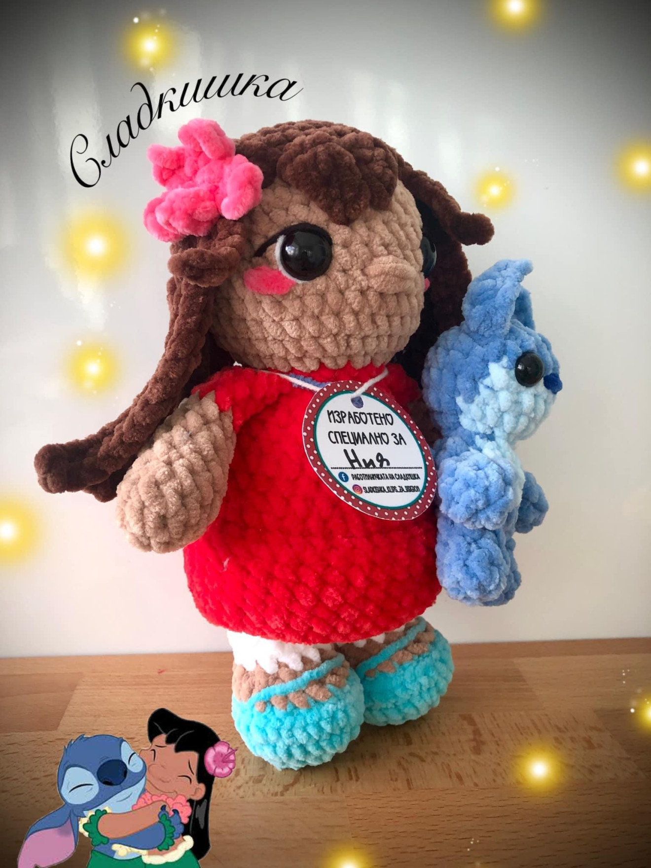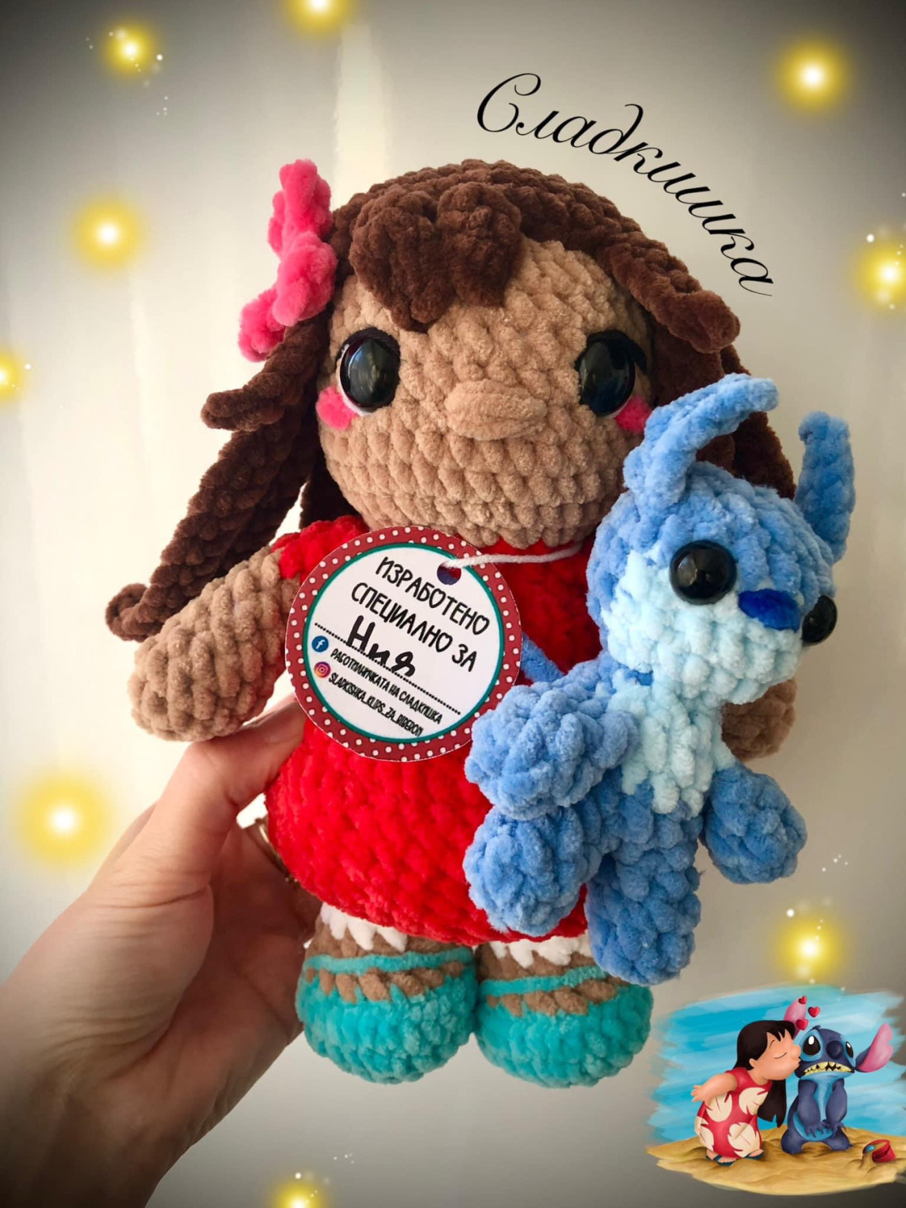 Специално за феновете на Лило и Стич - плетена играчка или ключодържател. Кукла Лило + аксесоар Стич: височината на куклата е 25см. Цената на комплекта е 65лв. Стич: висок 32/33см, към него може да има аксесоар с приятелчето му Скръм, цветенце или нещо друго. Цената е 40лв. Ключодържател Стич - 15лв.