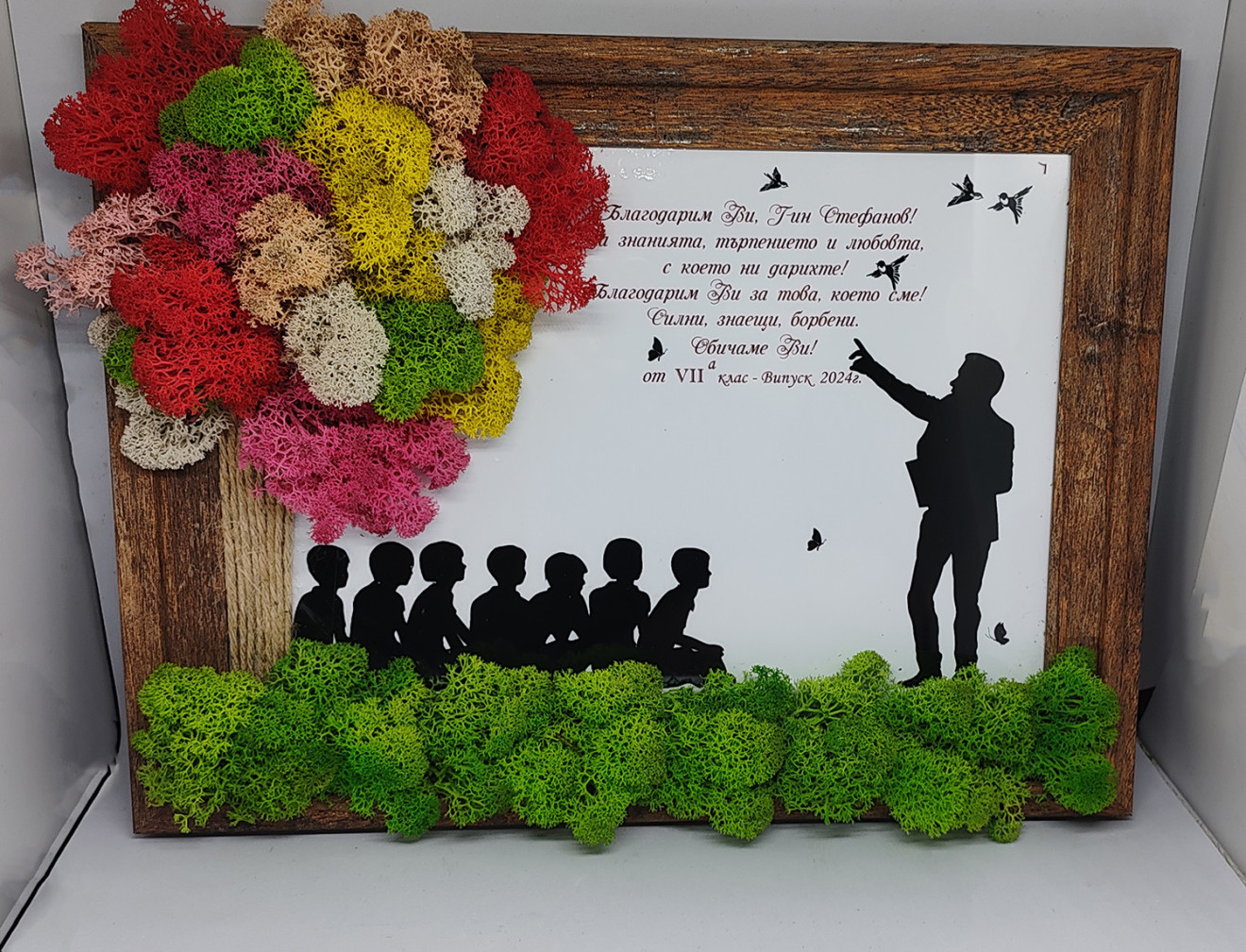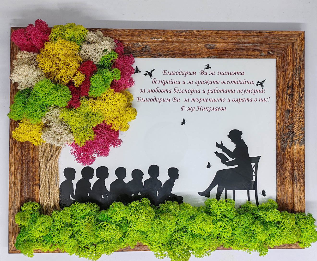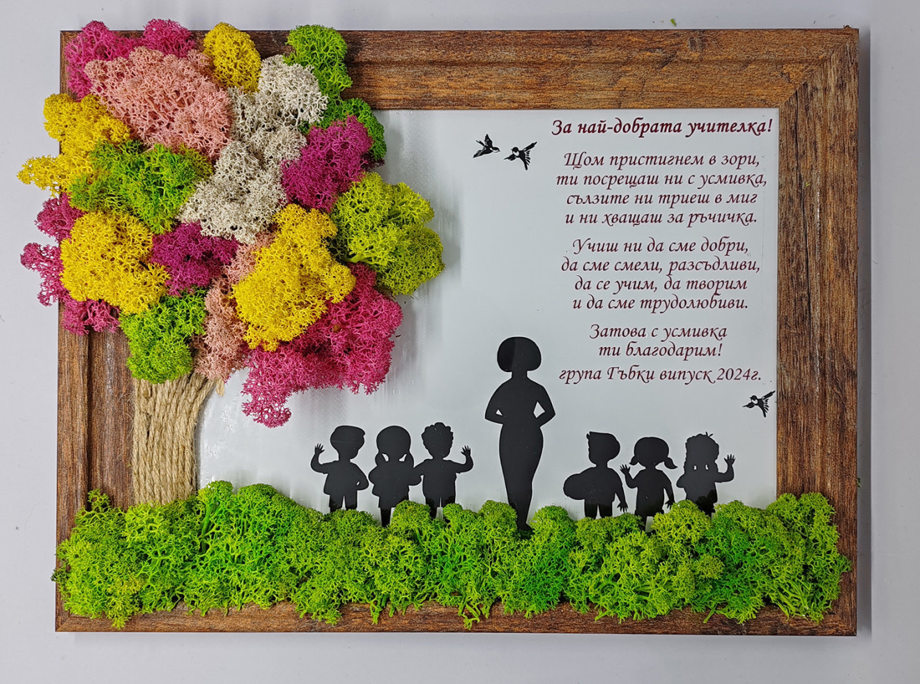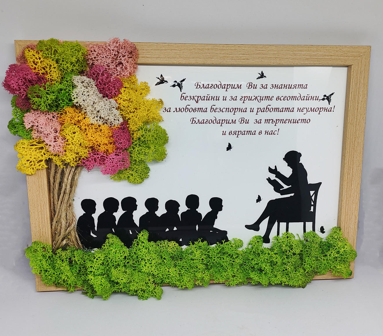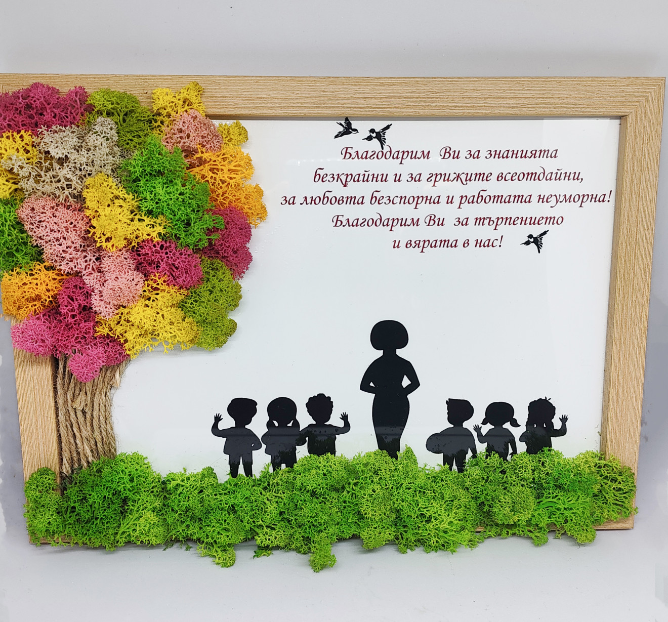 Страхотен и неповторим пдоарък за всеки учител. Картина със скандинавски мъх и персонален надпис. Подари един неповторим подарък на своя любим учител. Картината е опакована в подаръчна кутия, готова за подаряване. Декорирана е със свежи цветове скандинавски мъх. Картина за учител за детска градина, училище, ясла Размер: 23х34см.
