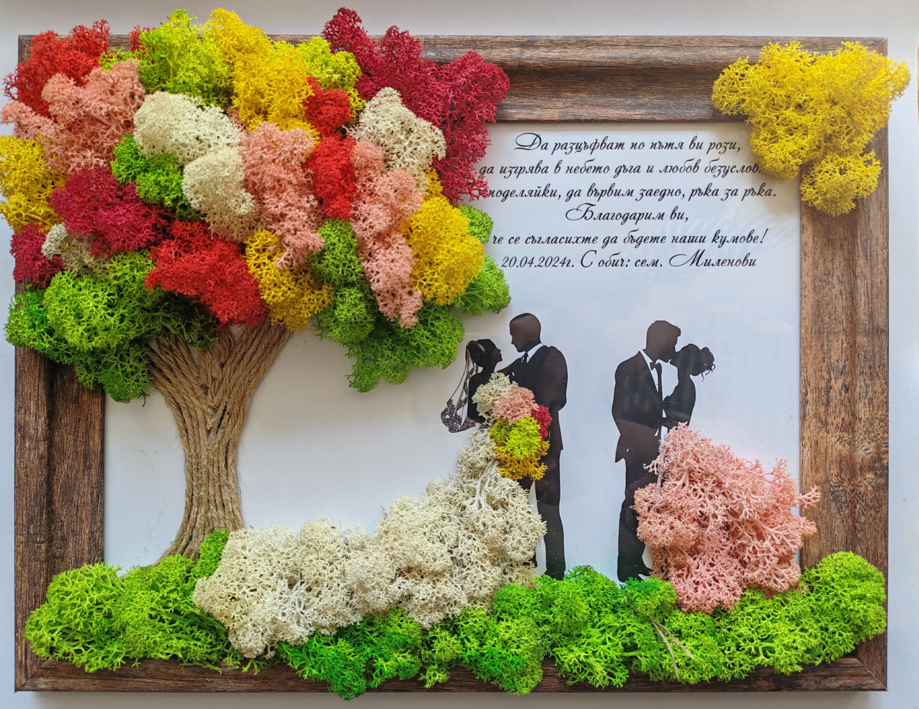 Търсите ли уникален и запомнящ се подарък за вашите кумове? Нашата персонална картина със скандинавски мъх е идеалният избор! Съчетавайки естествената красота на мъха обагрен с пъстри цветове и персонализирано послание, тя ще се превърне в ценен спомен, който кумовете ви ще пазят завинаги. Тази акртина съдържа всичко за да стане един специален и неповтроим подарък! ✓ Персонализиран текст ✓ Пъстроцветен скандинавски мъх ✓ Дървена рамка ✓ Подаръчна кутия ✓ Размер 26х33см.