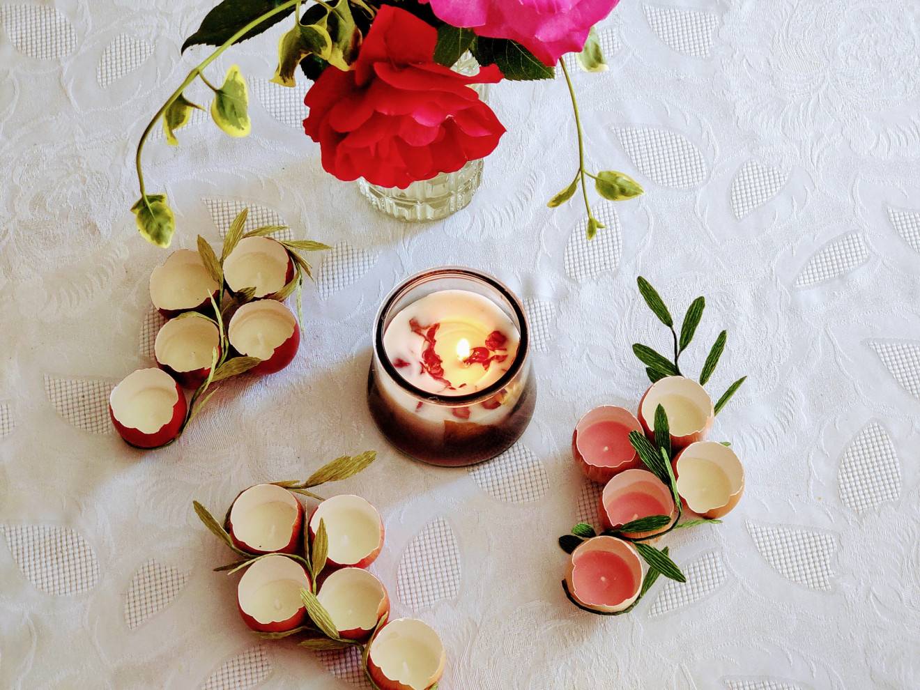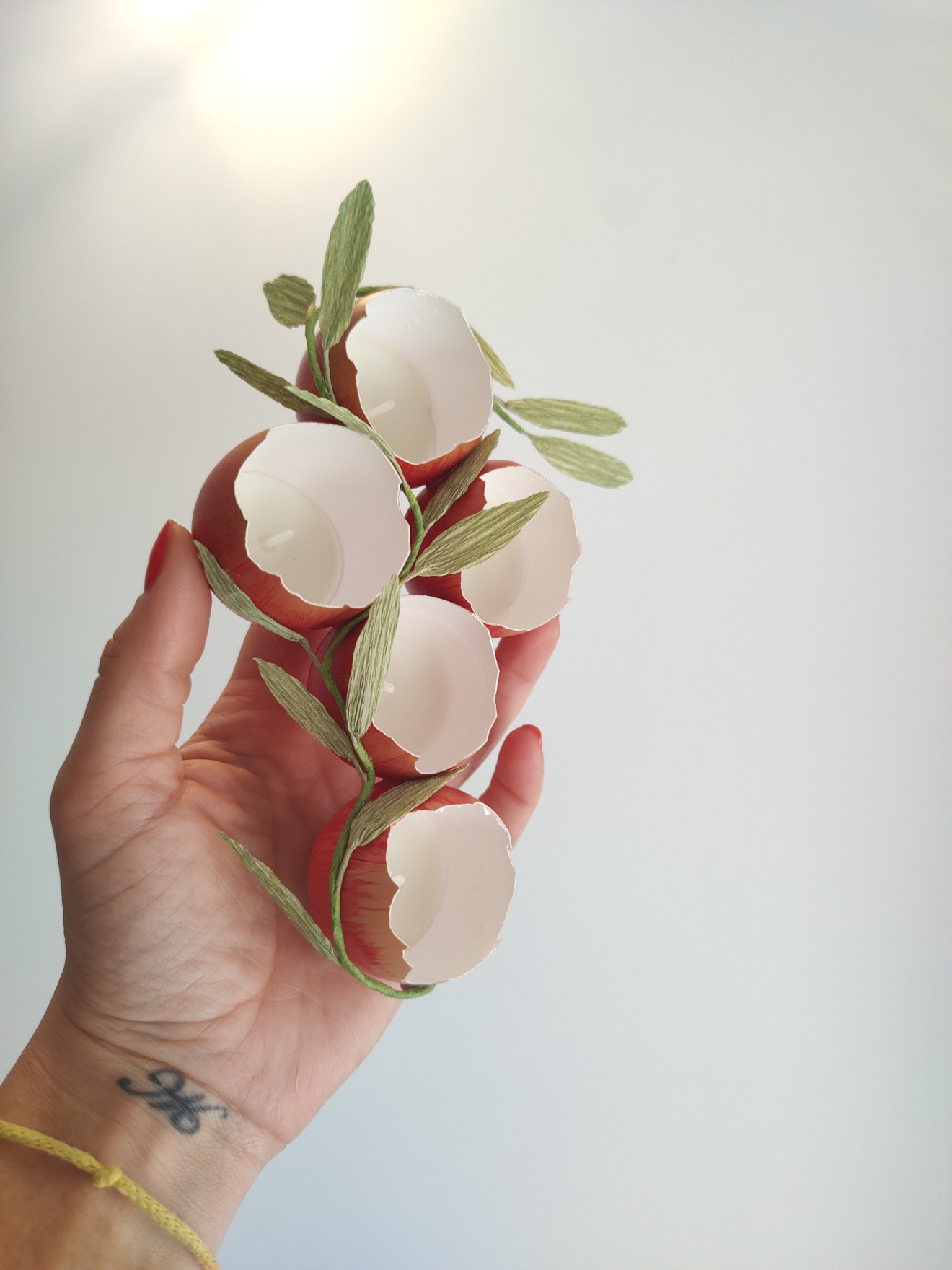 Ръчно направен от яйца, които са боядисани,може да са в цвят по желание, восъка също. Декорирани са с маслиново клонче от хартия.
