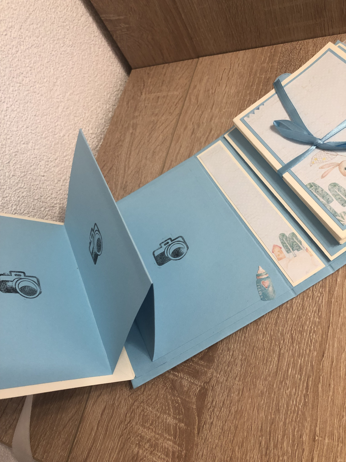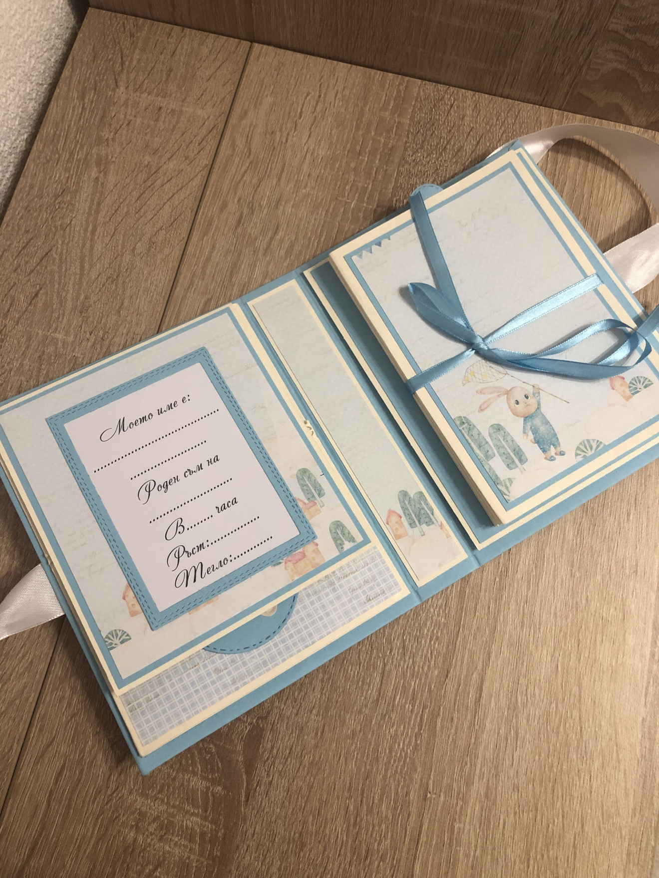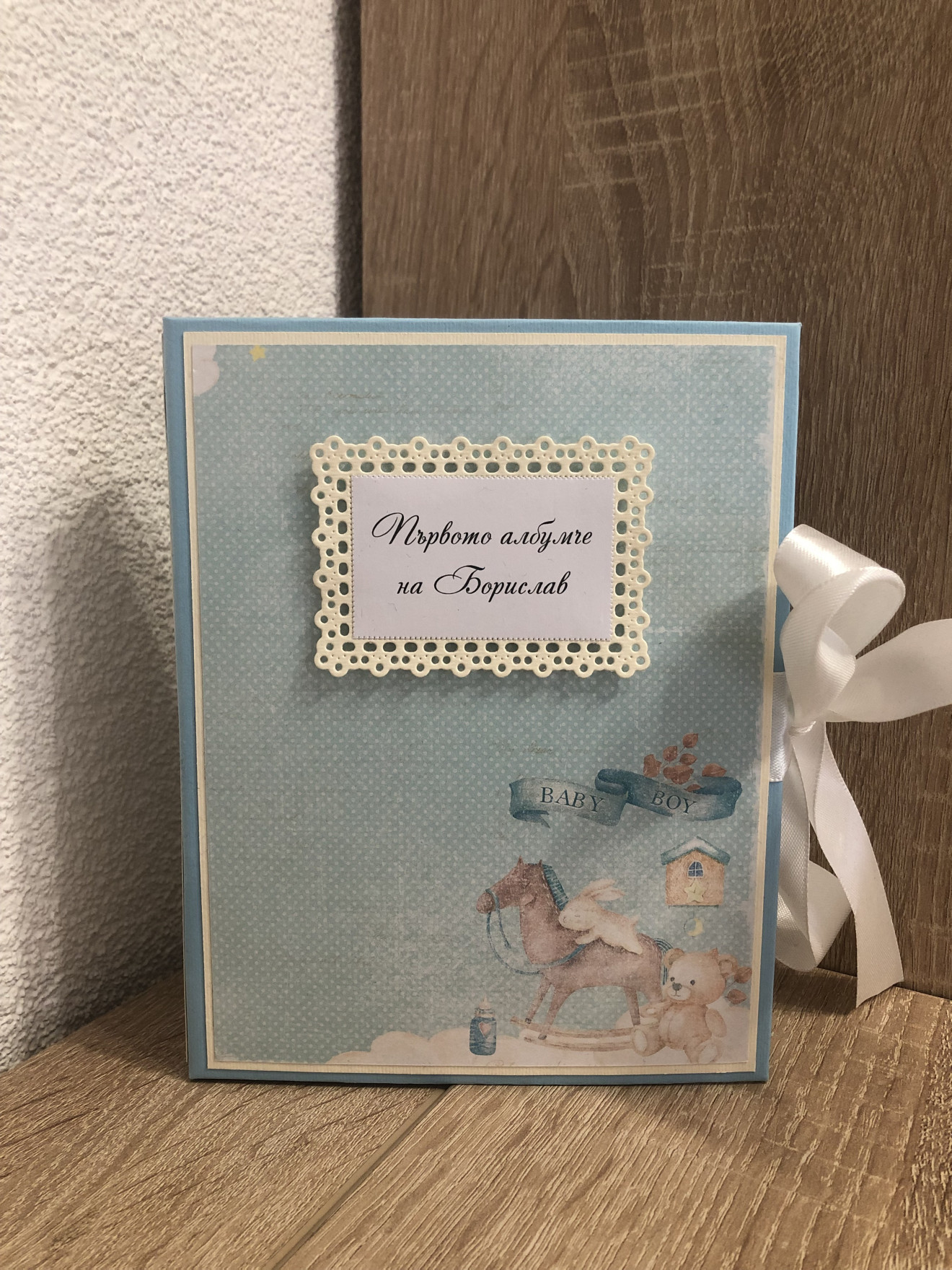 Здравейте, Представям Ви едно албумче, тип дневник за първата годинка на вашето бебе? Размери: 14*18*3 Албумът побира до 35 снимки с размер до 10*15. Може да се изработи в други размери и дизайни.
