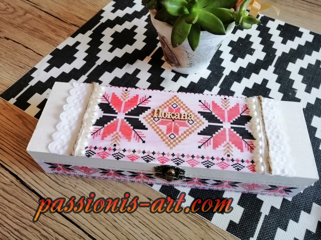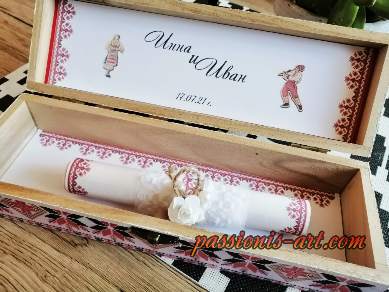 Сватбена покана в кутия с народни мотиви. Поканата е ръчно изработена дървена кутия с поставен папирус вътре. Текста е по желание на клиента. Време за изработка 3-10 работни дни. За спешни поръчки тел: 0876560985
