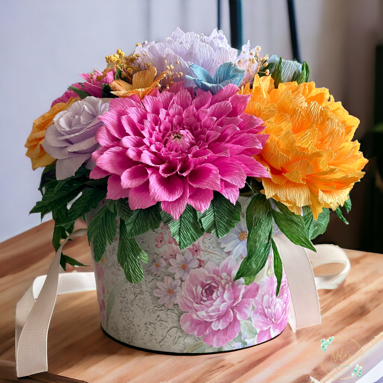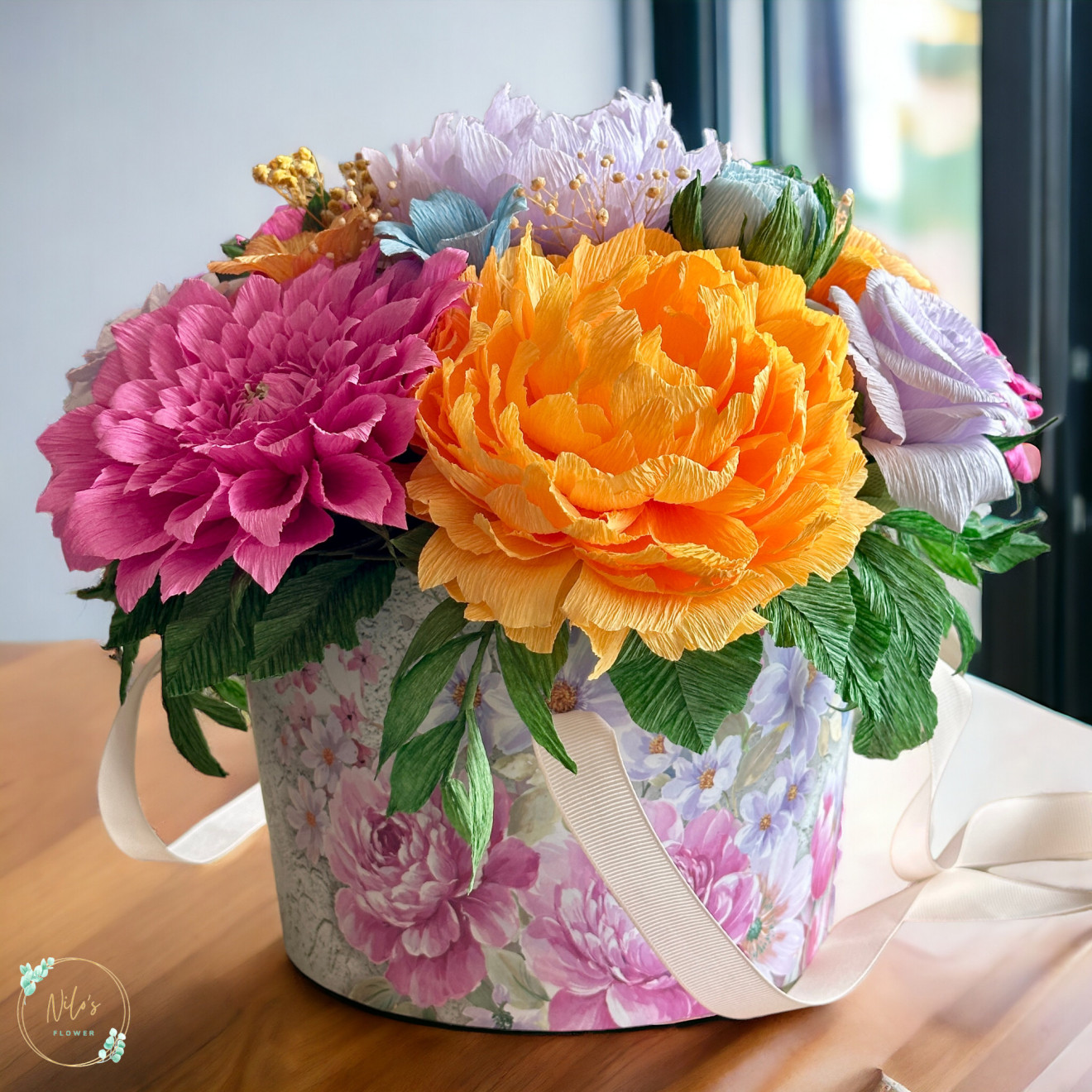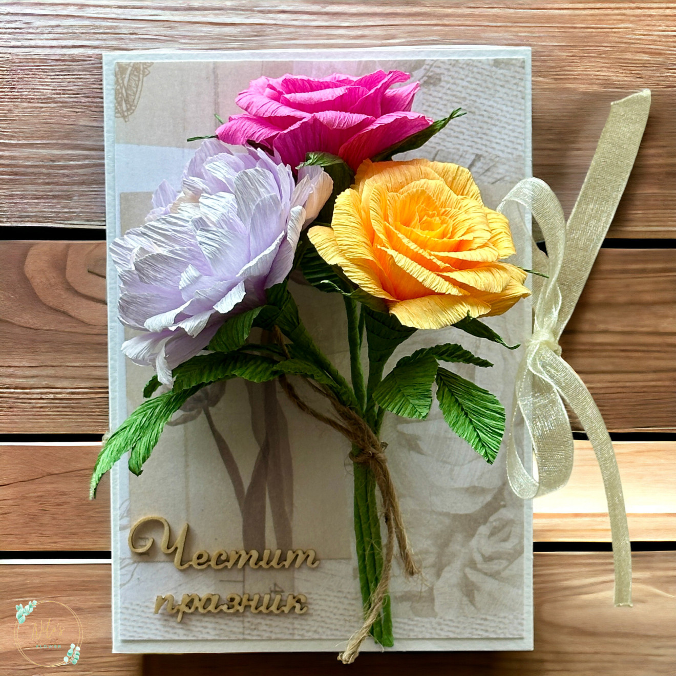 Цветен букет с ръчно изработени цветя от креп хартия аранжиран в кутия. Цветята имат допълнително лаково покритие с цел предпазване от леко намокряне и запазване на цветовете. Към него може да се изработи и картичка с цветя в съответстващи на аранжировката. Срокът за изработка може да е различен в зависимост от натовареността към момента на поръчката.