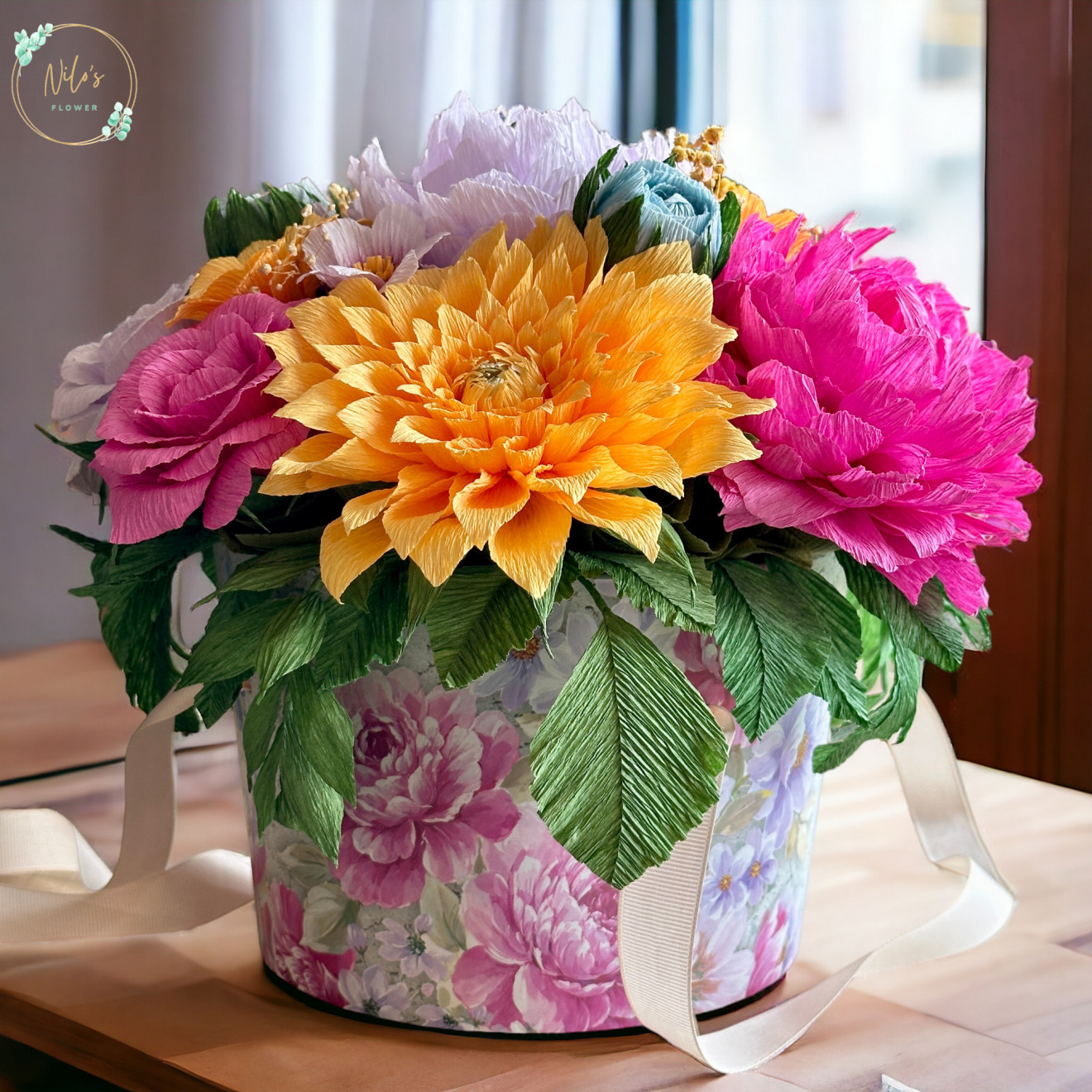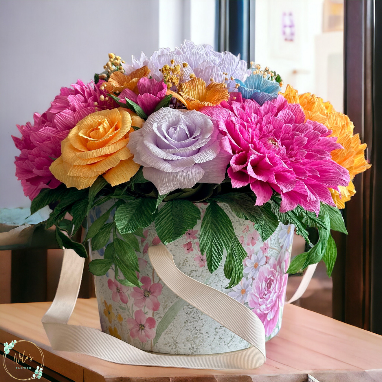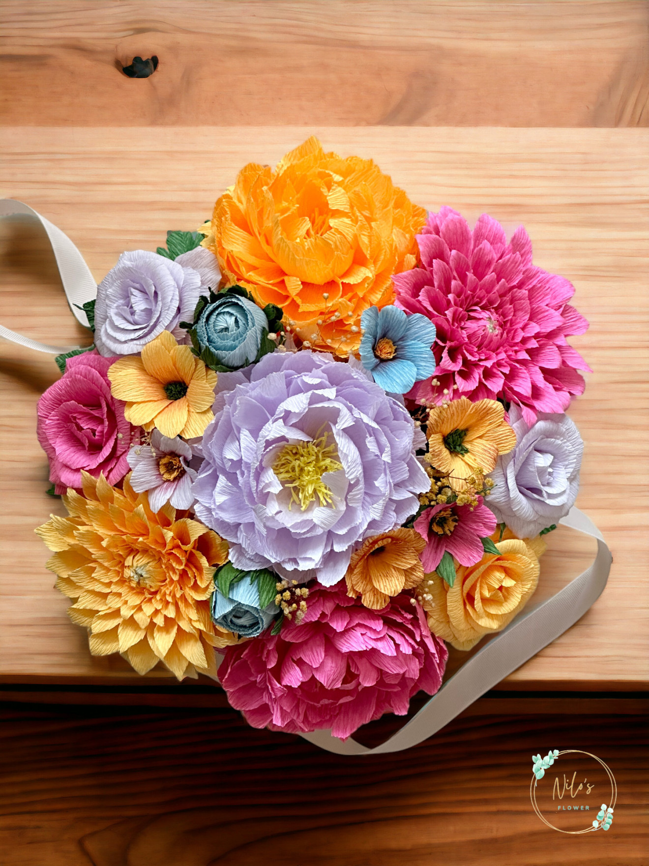 Цветен букет с ръчно изработени цветя от креп хартия аранжиран в кутия. Цветята имат допълнително лаково покритие с цел предпазване от леко намокряне и запазване на цветовете. Към него може да се изработи и картичка с цветя в съответстващи на аранжировката. Срокът за изработка може да е различен в зависимост от натовареността към момента на поръчката.