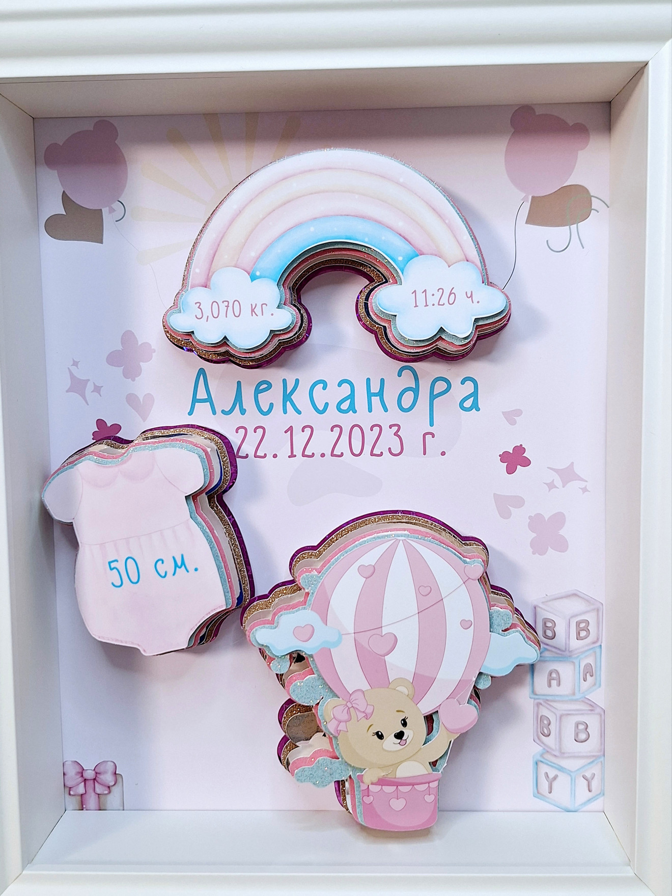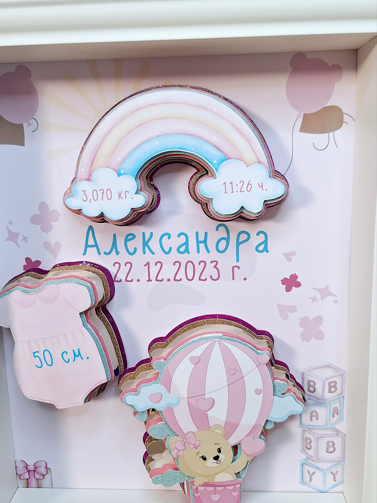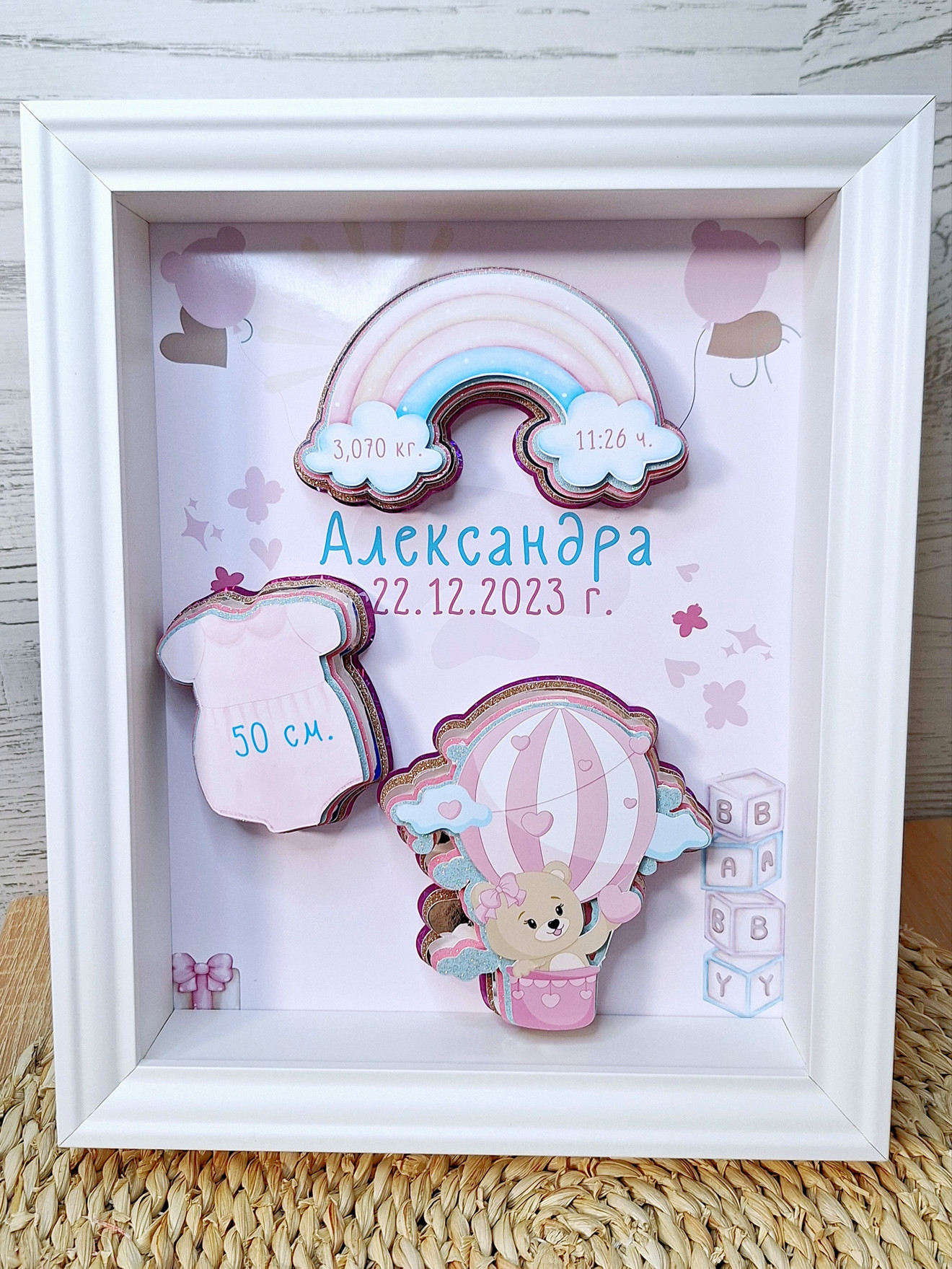 "Представяме ви нашата уникална рамка визитка за новородено, която е идеален начин да съхраните скъпите спомени от първите мигове на вашето бебе. Изработена от висококачествен MDF материал, тази рамка е декорирана с 3D елементи от картон, които придават дълбочина и изисканост на продукта. Характеристики на Продукта: - Материал: MDF рамка с 3D елементи от картон - Декорация: 3D елементи във формата на боди, дъга и мече с балон - Информация: Върху елементите са изписани сантиметри, килограми, час и дата на раждане - Цветова Гама: Зелено, оранжево и кафяво - Картон: Различни цветове картон – металиково в розов на звезди и сив цвят, блестящи картони в мента, розово и бежов цвят - 3D Ефект: Пластовете картон са залепени с повдигащи елементи за създаване на 3D визуализация - Принт: 3D елементите са залепени върху принт в розово и цвят мента с изписани дата и час на раждане Тази рамка визитка за новородено е перфектният подарък за новите родители и чудесен начин да запазите важните данни за вашето бебе в красив и стилен вид."