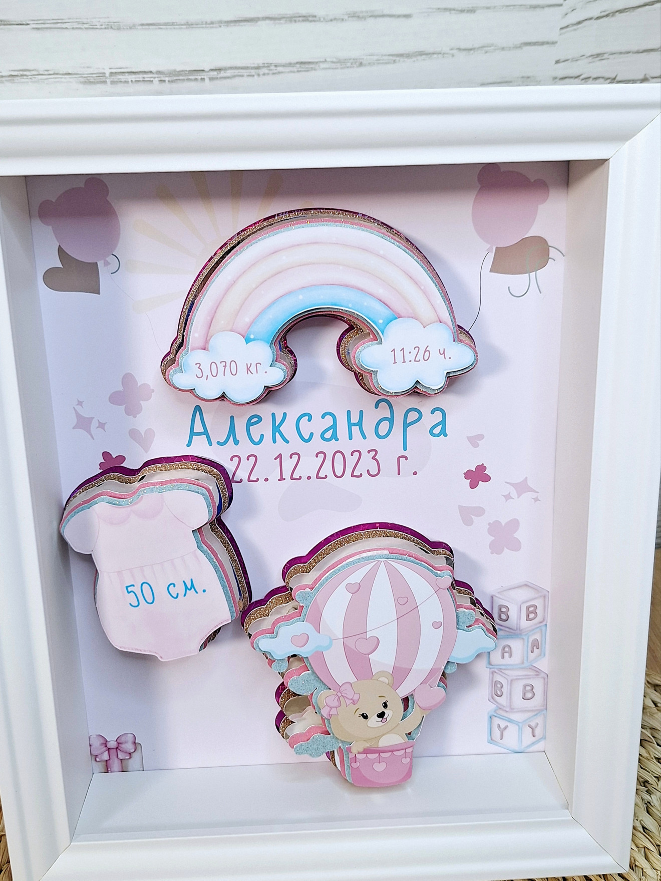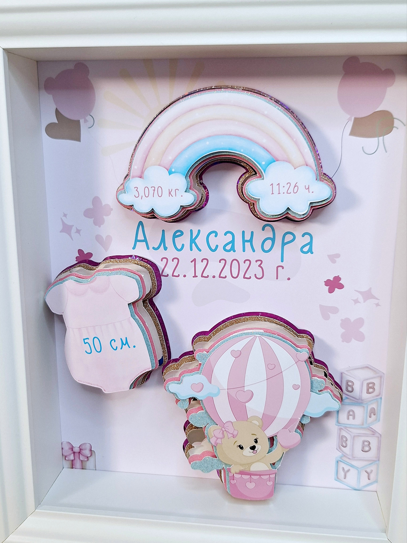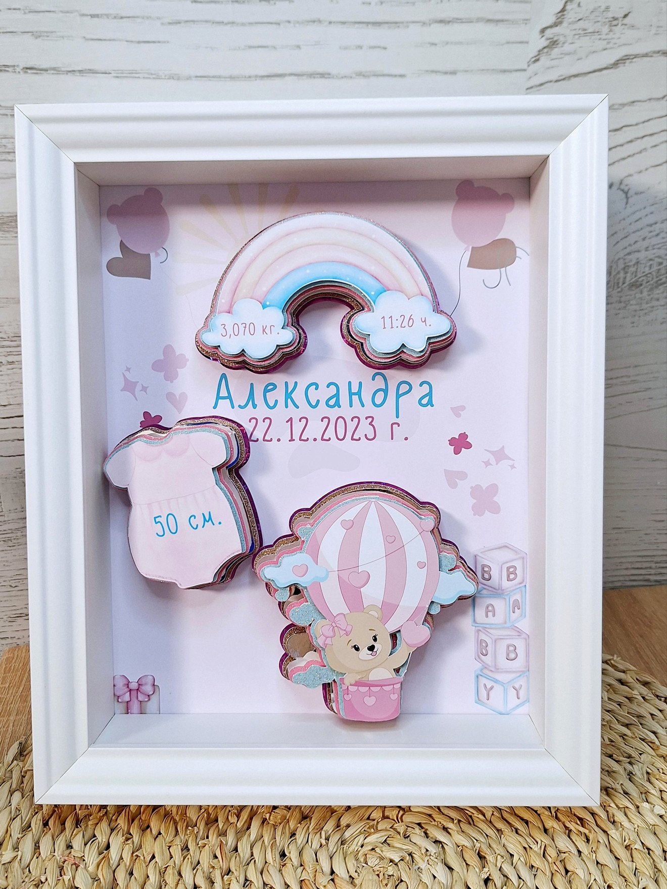 "Представяме ви нашата уникална рамка визитка за новородено, която е идеален начин да съхраните скъпите спомени от първите мигове на вашето бебе. Изработена от висококачествен MDF материал, тази рамка е декорирана с 3D елементи от картон, които придават дълбочина и изисканост на продукта. Характеристики на Продукта: - Материал: MDF рамка с 3D елементи от картон - Декорация: 3D елементи във формата на боди, дъга и мече с балон - Информация: Върху елементите са изписани сантиметри, килограми, час и дата на раждане - Цветова Гама: Зелено, оранжево и кафяво - Картон: Различни цветове картон – металиково в розов на звезди и сив цвят, блестящи картони в мента, розово и бежов цвят - 3D Ефект: Пластовете картон са залепени с повдигащи елементи за създаване на 3D визуализация - Принт: 3D елементите са залепени върху принт в розово и цвят мента с изписани дата и час на раждане Тази рамка визитка за новородено е перфектният подарък за новите родители и чудесен начин да запазите важните данни за вашето бебе в красив и стилен вид."