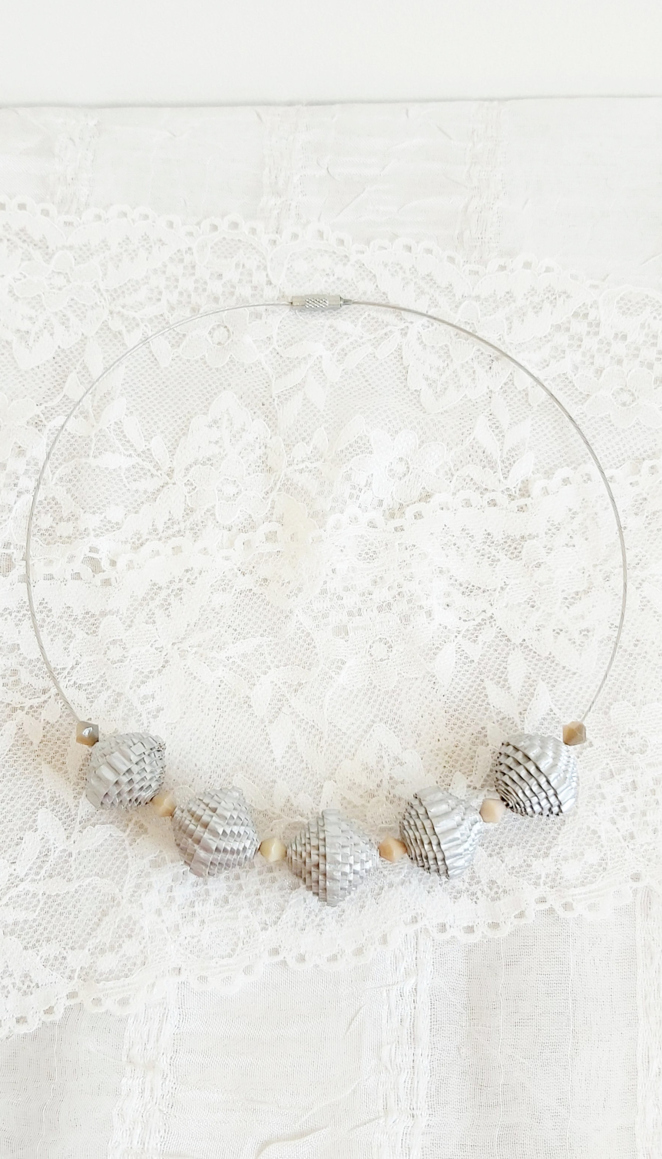 Геометрично квилинг колие със сребристи мъниста от гофриран картон
