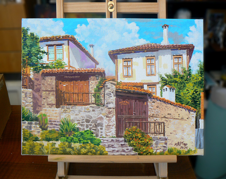 Маслена картина с къщи от Златоград. Платното е с размери 30 на 40 см и е хубаво, от лен. Нарисувана е 2024 г.
