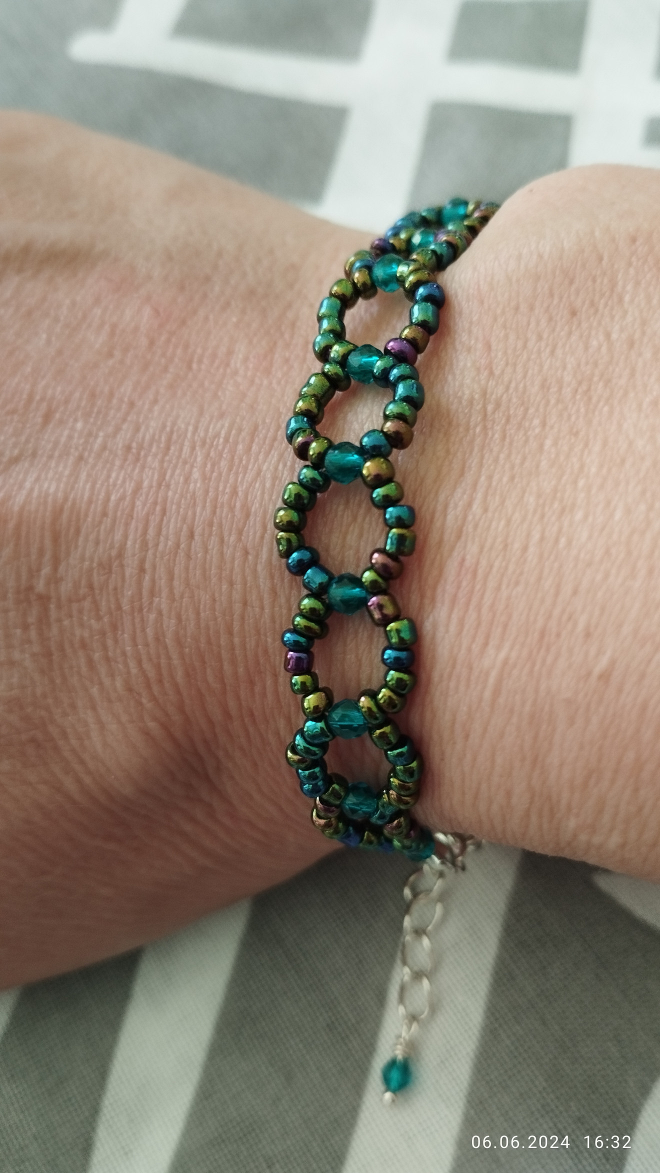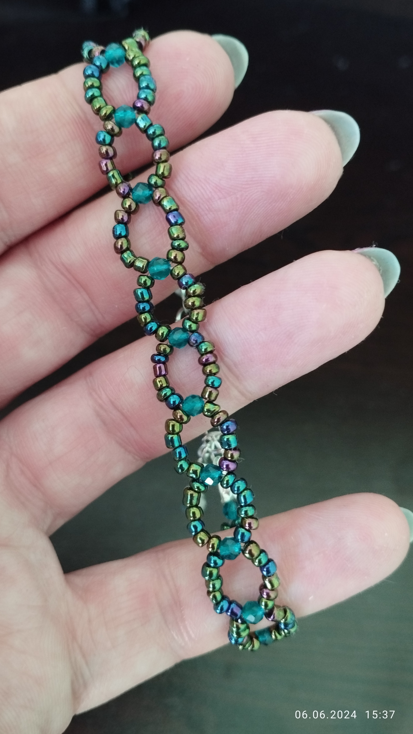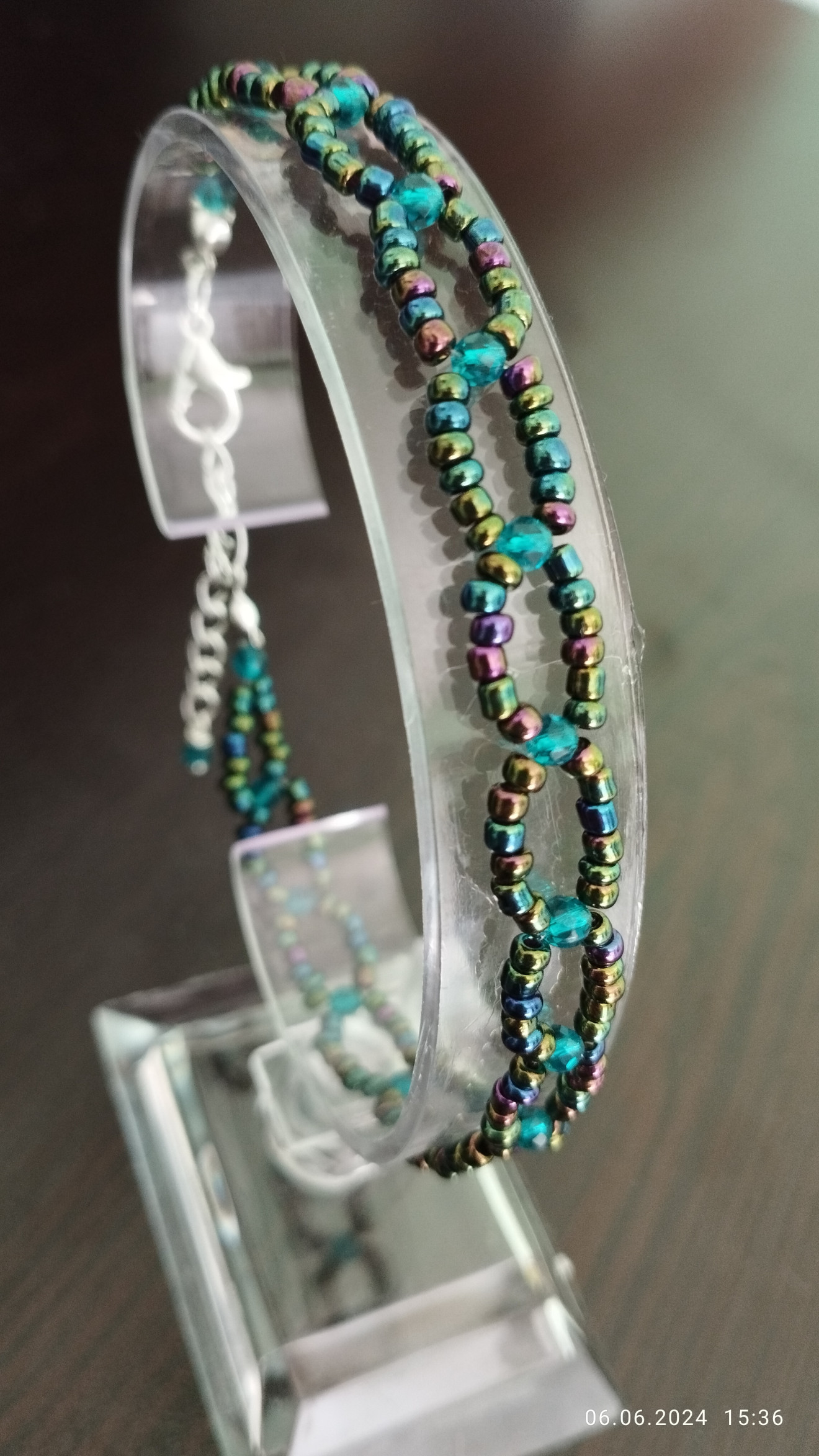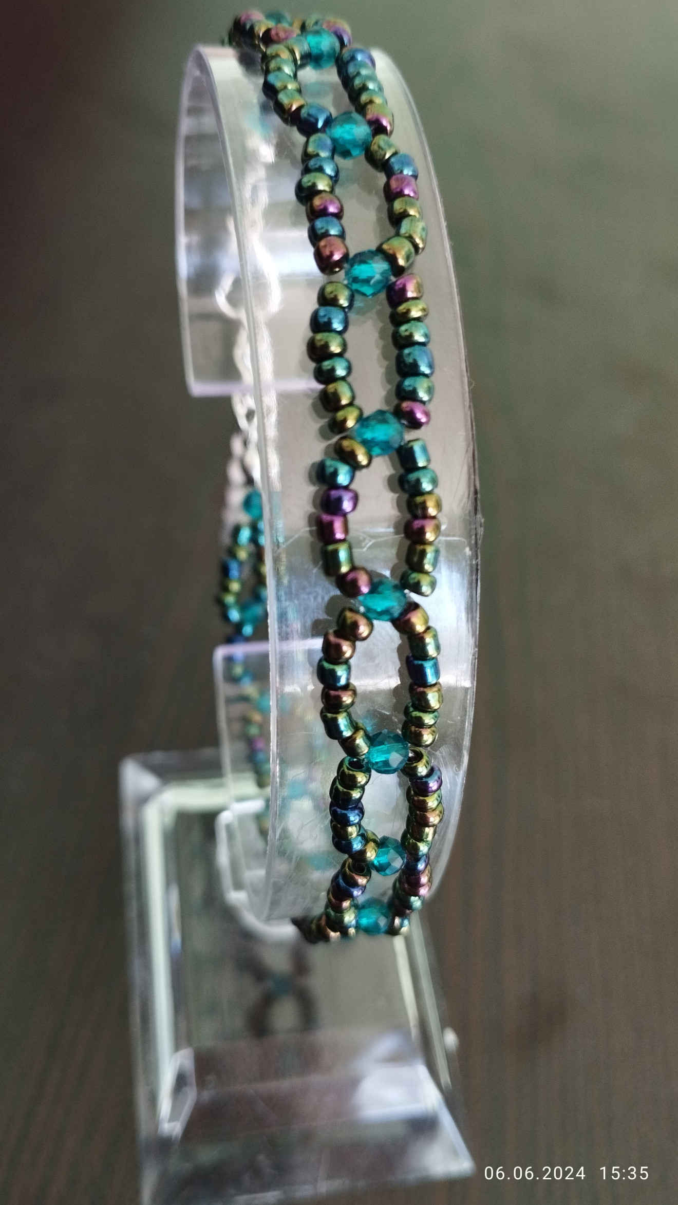 Гривната е изработена със стъклени мъниста в цвят "хамелеон" и сини кристали. Ширината се регулира. Може да се изработи и в други цветови комбинации.