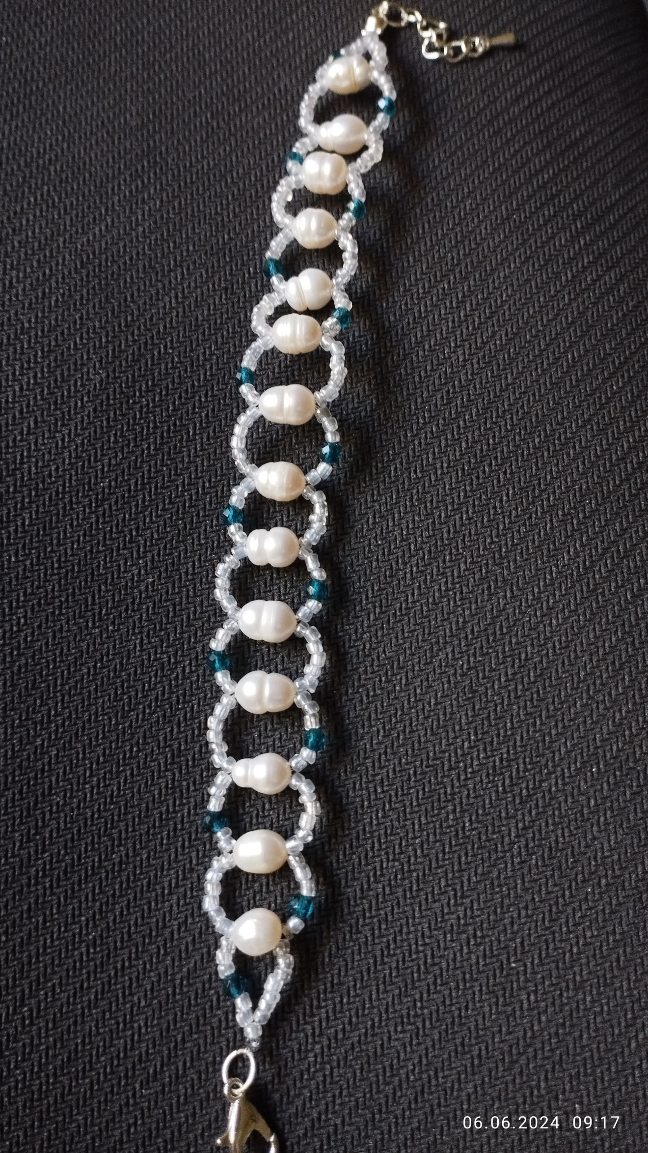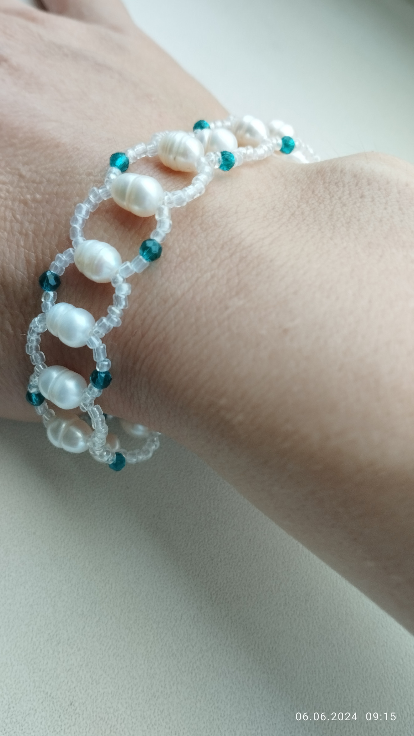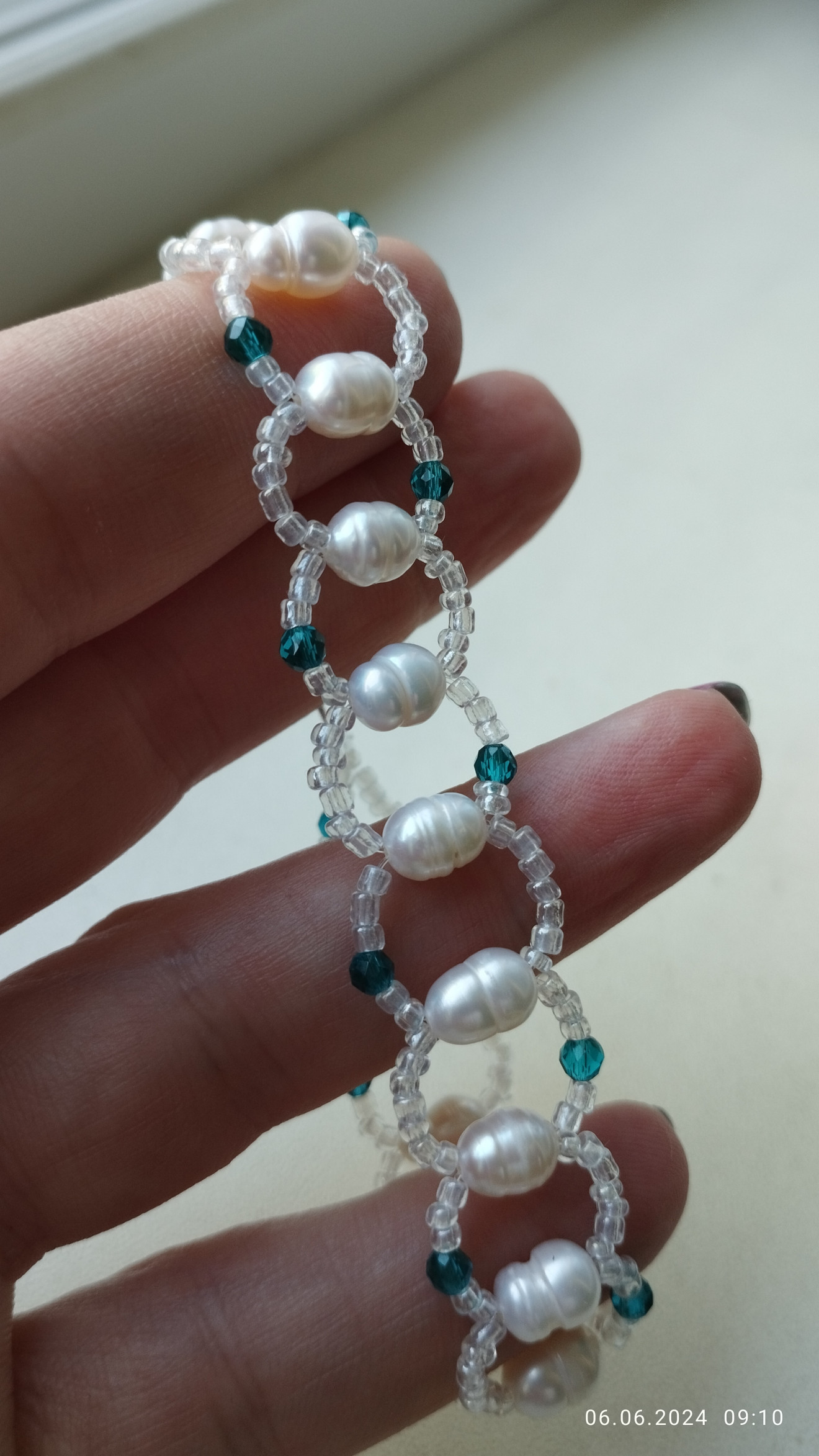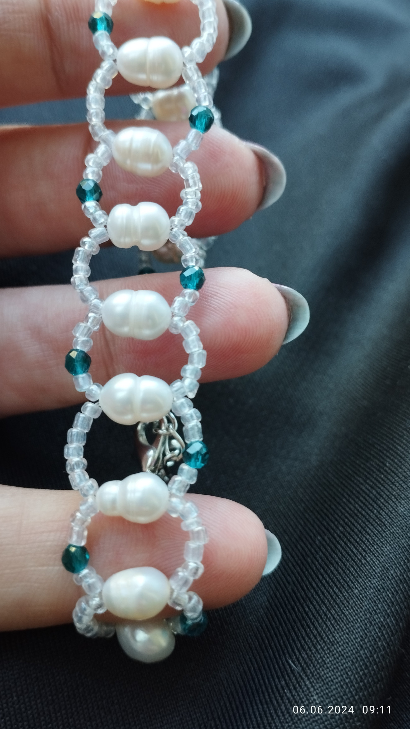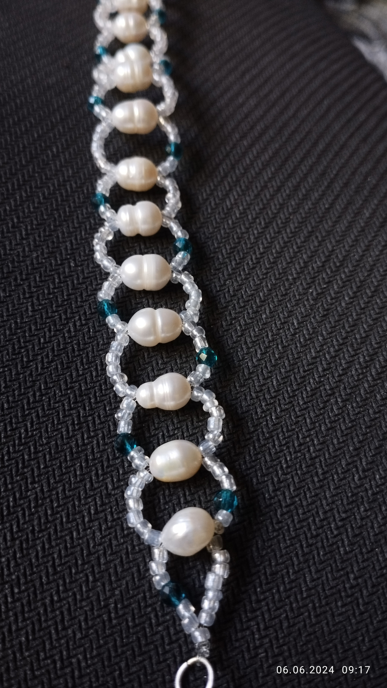 Гривната е изработена с естествени перли, стъклени мъниста и сини кристали. Ширината се регулира.