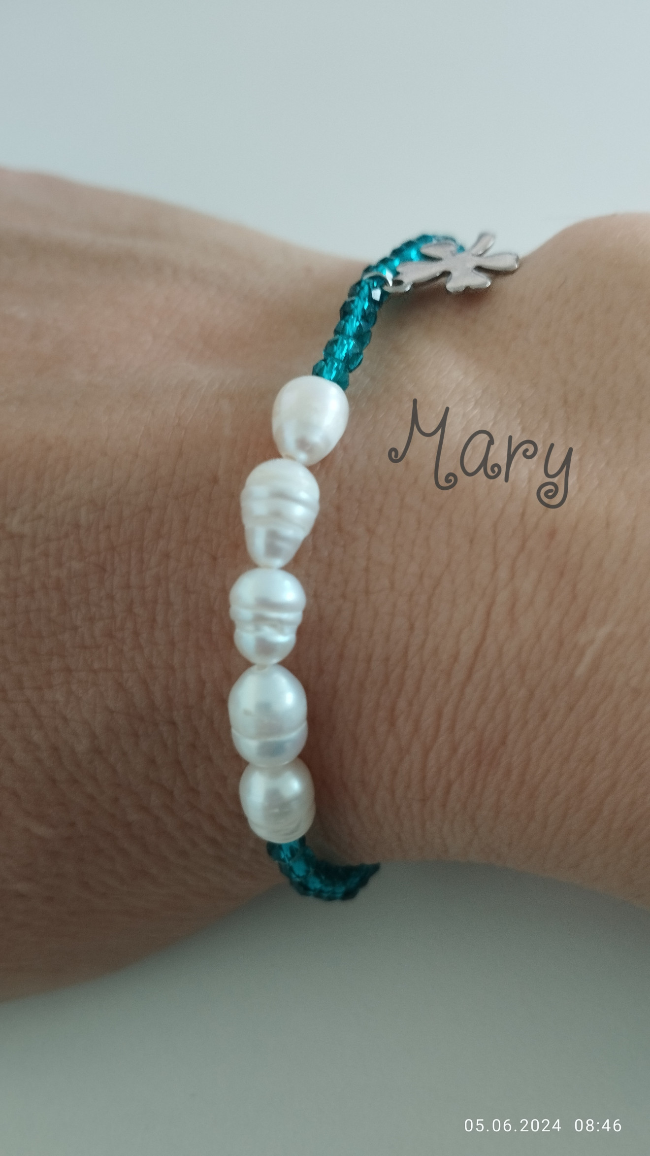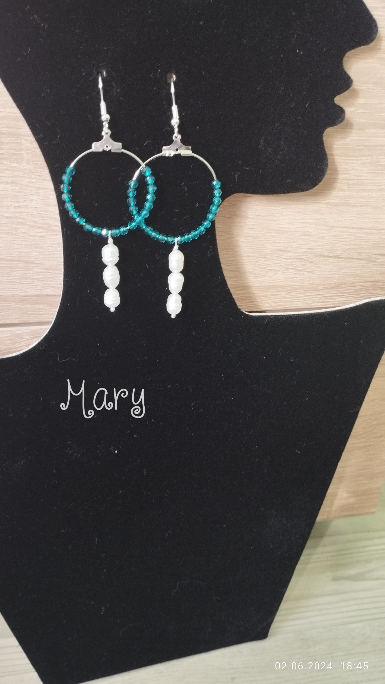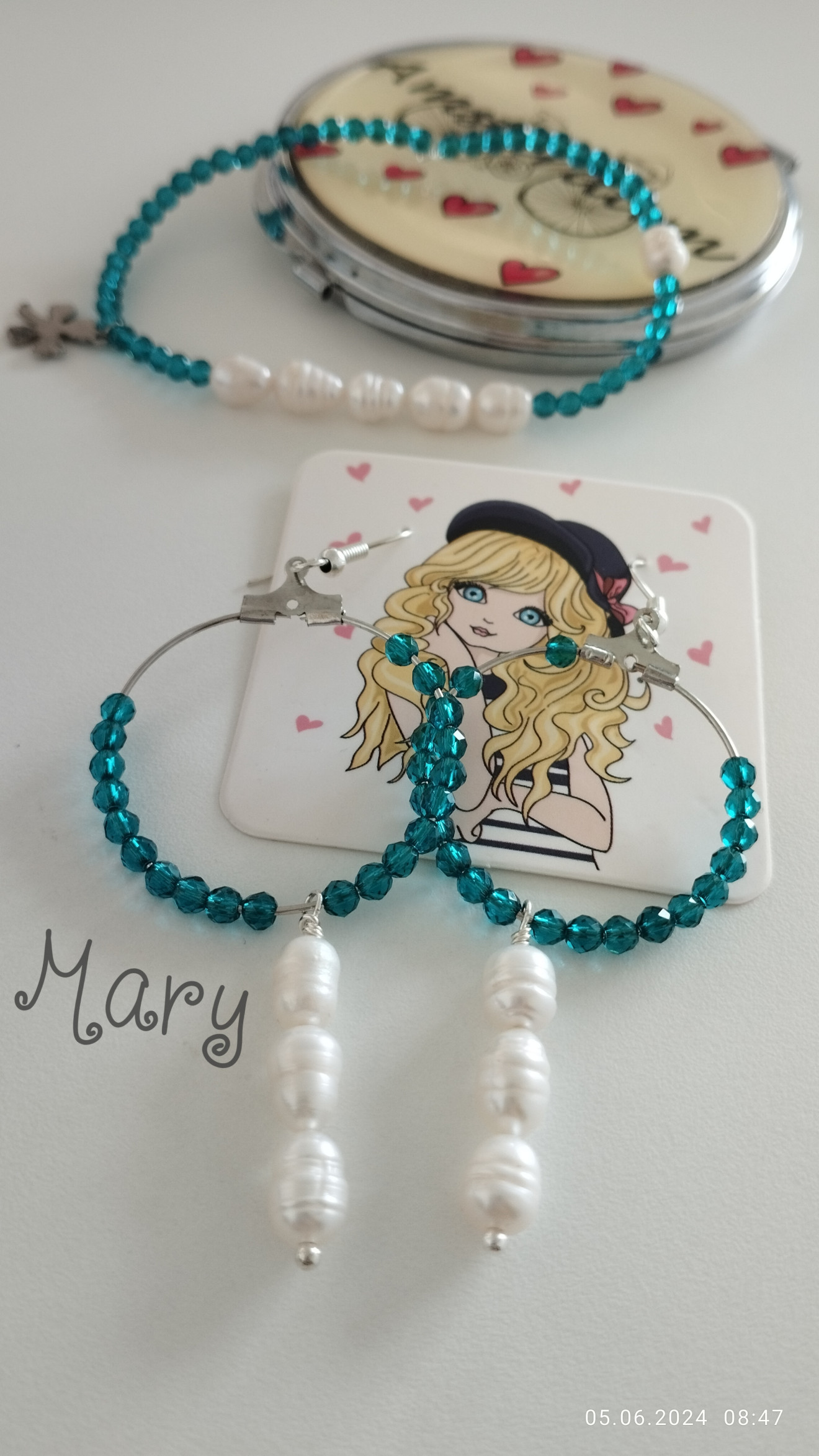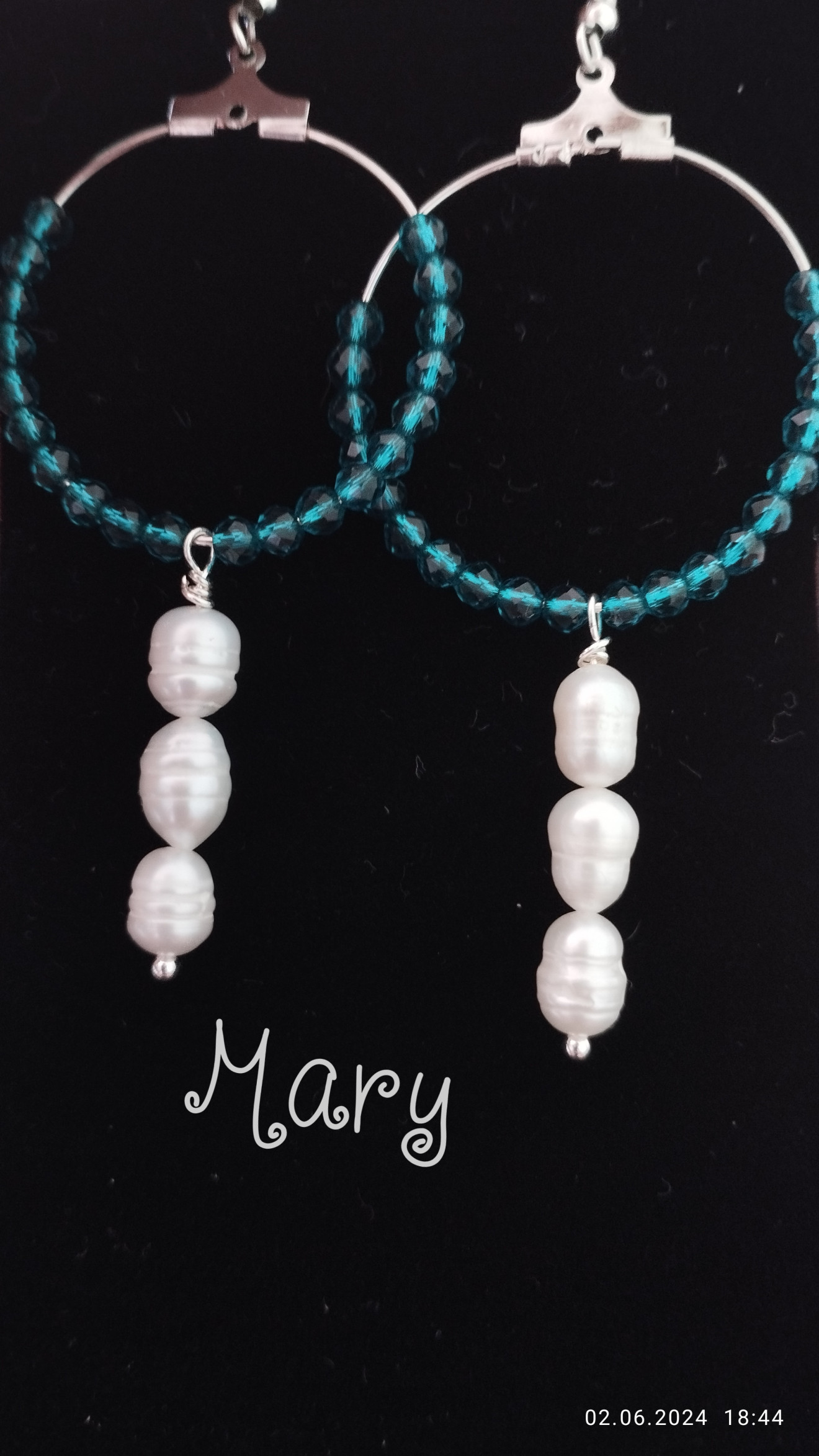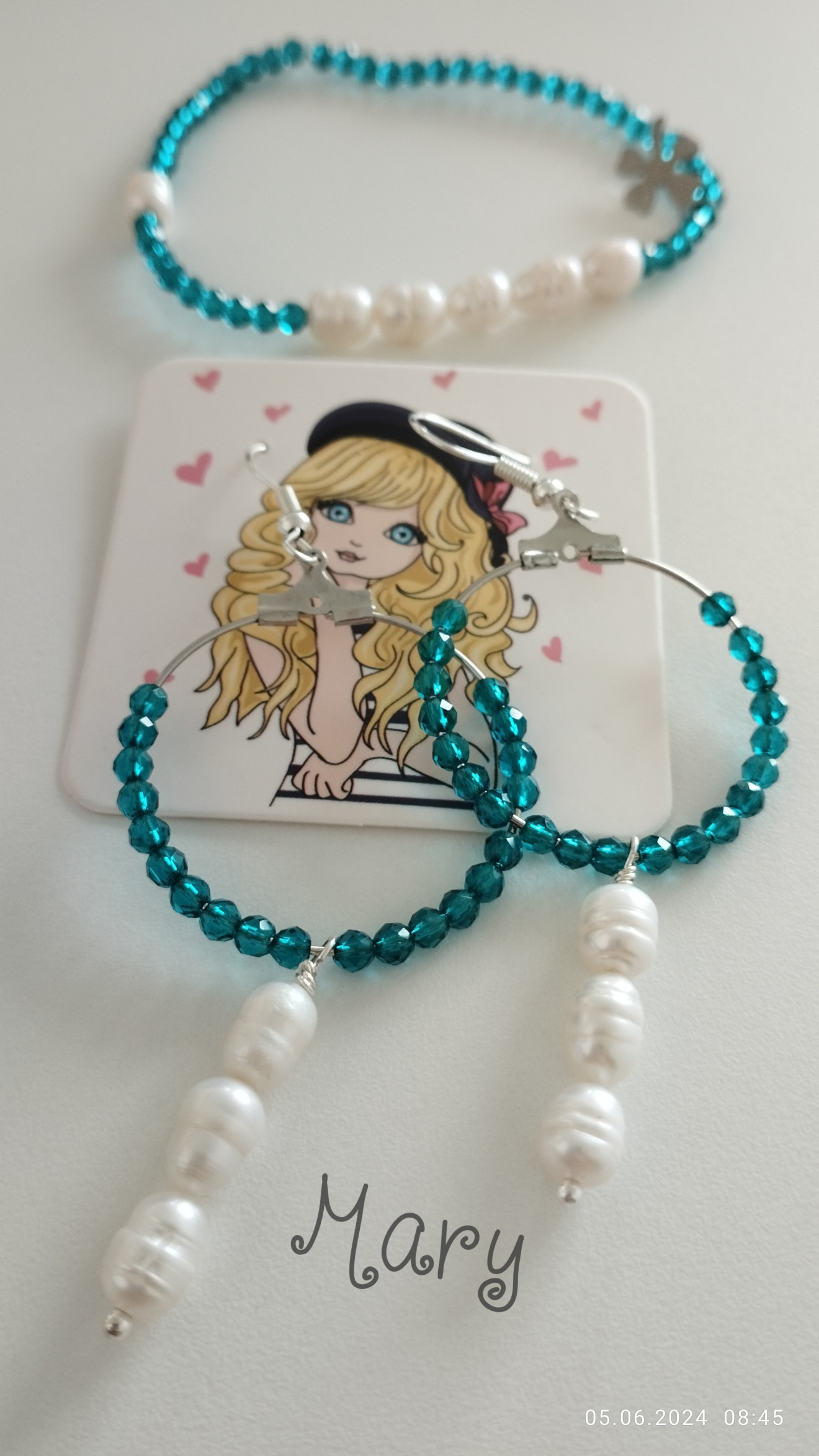 Комплектът е изработен с естествени бели перли и сини кристали. Кукичките на обеците са със сребърно покритие.