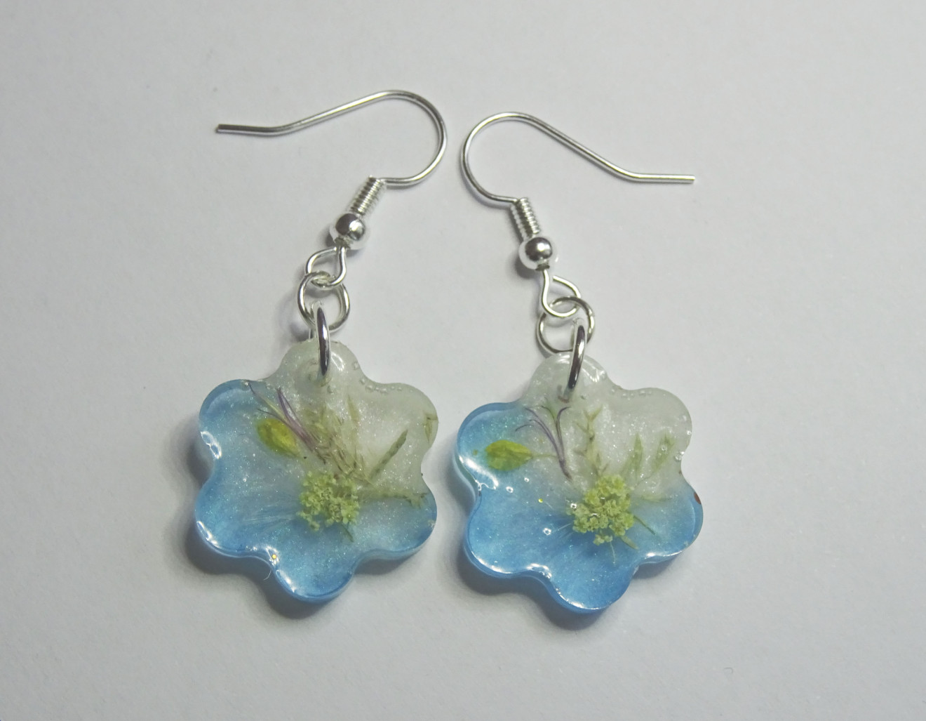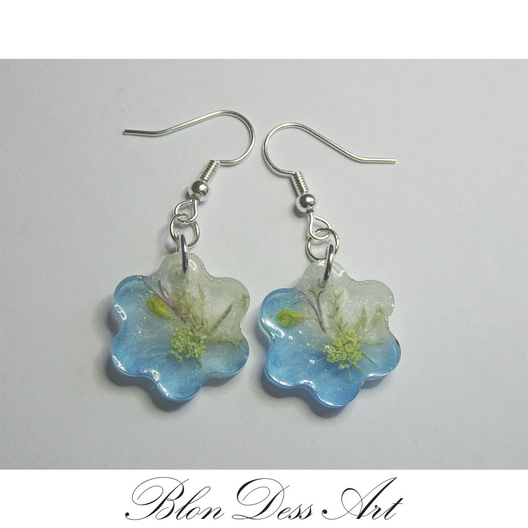 Обеци изработени от епоксидна смола и хипоалергични елементи. Цветето е с размер 2 см., а самата дължина на обецата е 4,5 см. С радост ще отговоря на всички, може да ме последваш и в: https://www.facebook.com/BlonDessArt и https://www.instagram.com/blondessart/?hl=bg