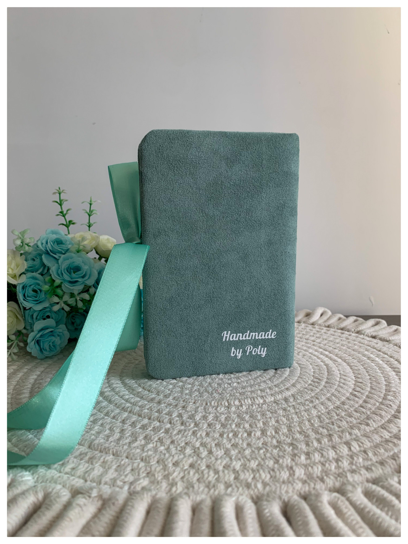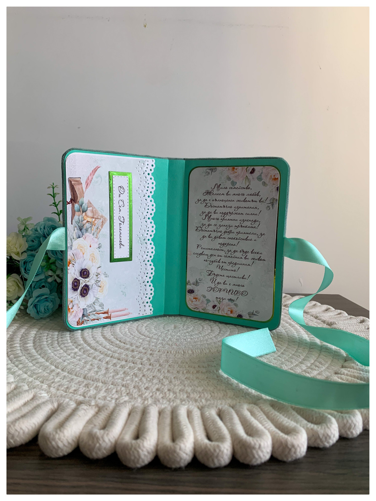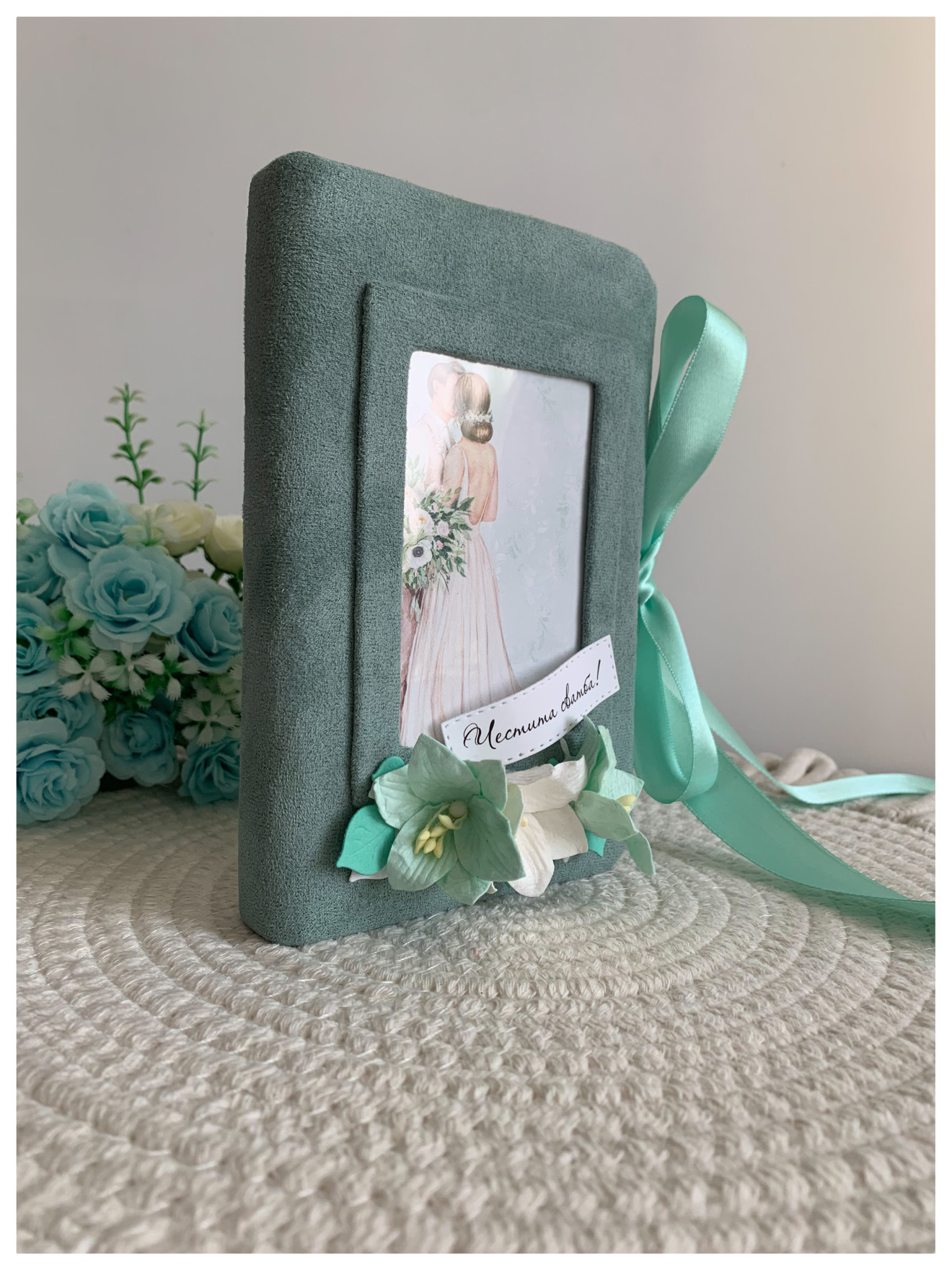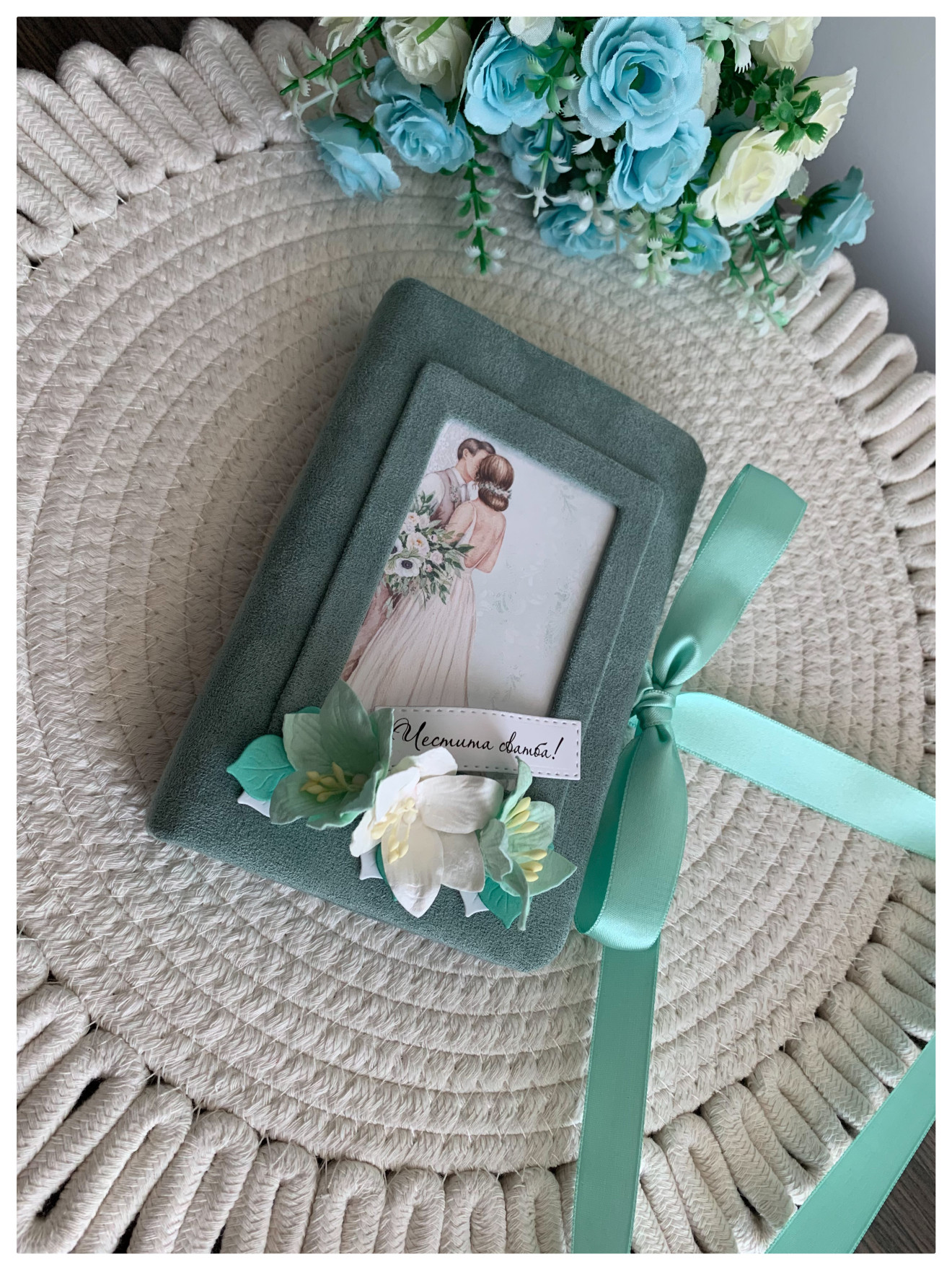 Сватбена картичка-плик с твърди корици опаковани с велур Цвят: лаврово зелено Размер: 10/16см. Цветовете и елементите се подбират индивидуално за всяка поръчка.