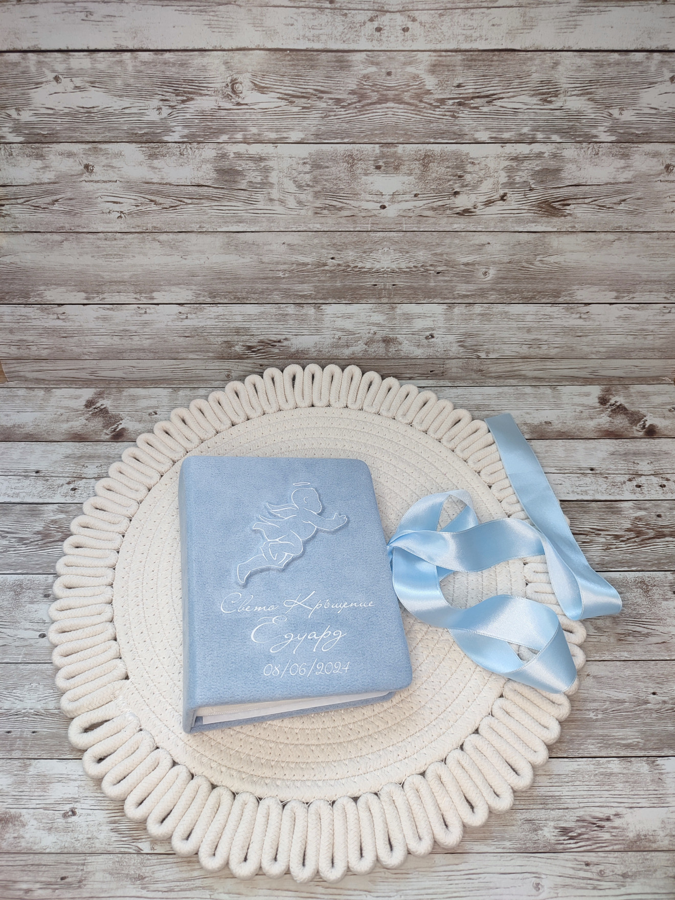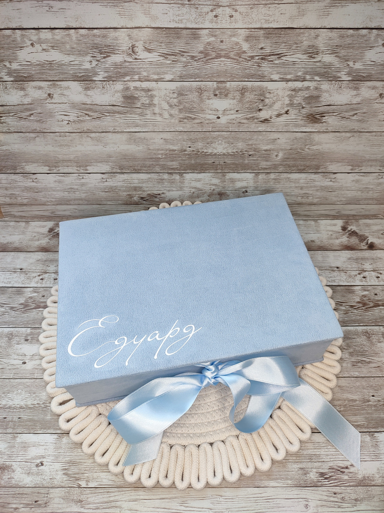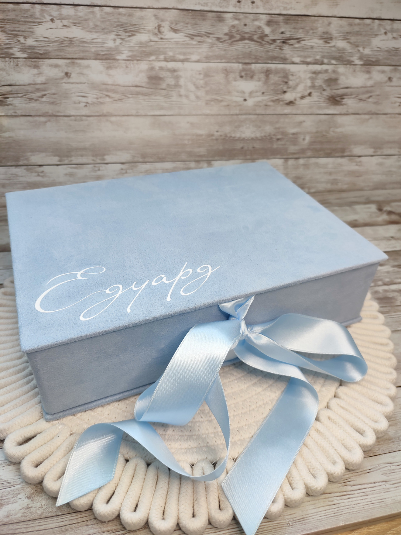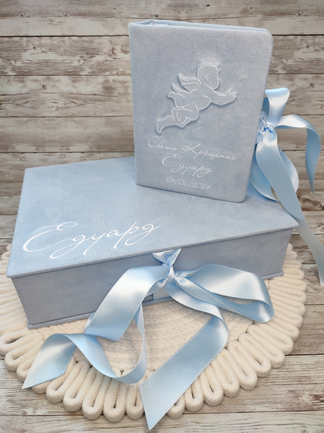 Кутия, облечена във велур, в която може да съхраните най-ценните предмети за спомен, свързани в появата на Вашето бебе. Включва: ~ Кутия за пъпче ~ Кутия за гривнички ~ Кутия за косичка ~ Кутия за кръстче ~ Мини албум с фолийни джобчета за 100бр снимки Може да се съчетае с комплект за кръщене. Може да бъде изработена по индивидуален размер, цвят, тема и съдържанието да бъде по Ваш избор: ~ Кутия за тест за бременност ~ Кутия за зъбче ~ други