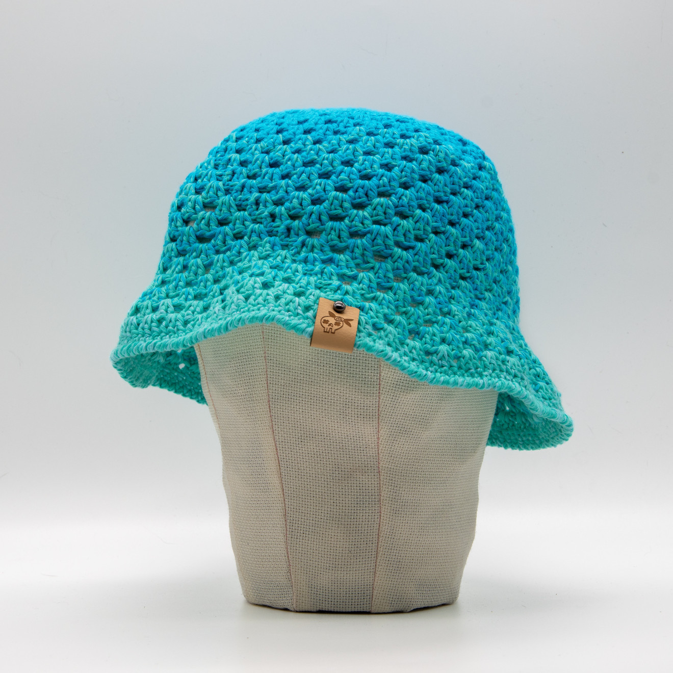 Материал: 100% памук Цвят: Синьо към аква омбре Размер: Подходяща е за деца и възрастни с обиколка на главата около 54-56см Детайли: Свалящ се етикет от веган кожа Грижа: Да се пере на ръка