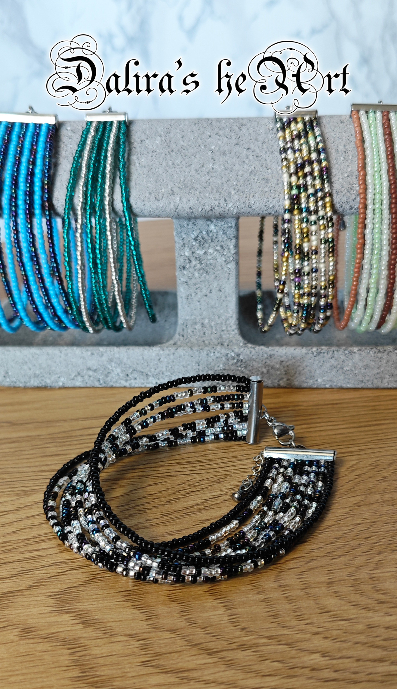 В тази многоредова гривна от стъклени мъниста и стомана от 9 корди, смесих три от любимите ми цветове мъниста - черно, сребристо и естествено ирис! ❤️? Ще подхожда чудесно на ежедневното и елегантното Ви облекло! ? Гривната е подходяща за китка с обиколка 16см и нагоре. Дължина 18см (дизайн+закопчалка)+3см удължител и метални части изцяло от стомана, за да не променя красотата си. Стоманата е чудесен избор при алергии на кожата, издръжлив материал и лесен за подръжка. Изработена с любов и внимание към детайлите. ?